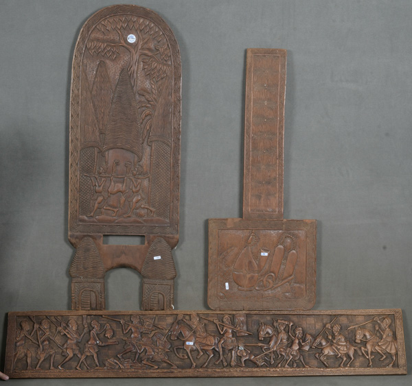 - Katalog-Nr: 286Drei Reliefs. Afrika. Massivholz, geschnitzt mit Reitern, Jägerszene und Transportbehältern, 25 x 41 bis 116 x 151 cm.o.L.