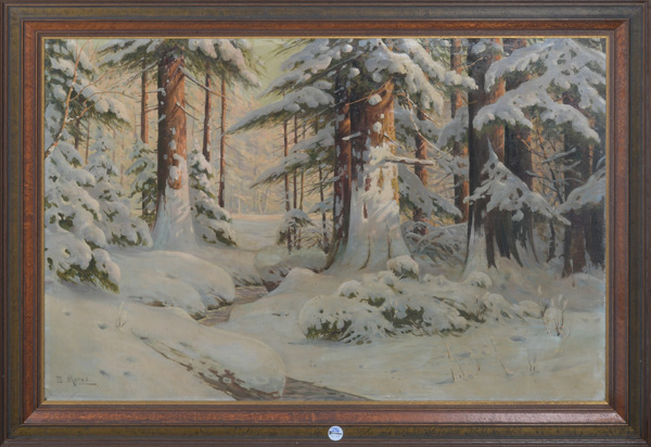 - Katalog-Nr: 296Otto Max Bruno Moras (1883-1939). Waldlandschaft mit Bachlauf im Winter. Öl/Lw., li./u./sign., gerahmt, 80 x 120 cm. (min. besch. / rest.)o.L.