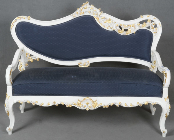 - Katalog-Nr: 298Sofa. Frankreich 20. Jh. Massivholz, geschnitzt mit Blattwerk, Rocaillen und Voluten, auf Kreidegrund weiß gefasst und gold gehöht; geschweiftes Gestell, Sitz und Rücken gepolstert, B=129 cm.o.L.