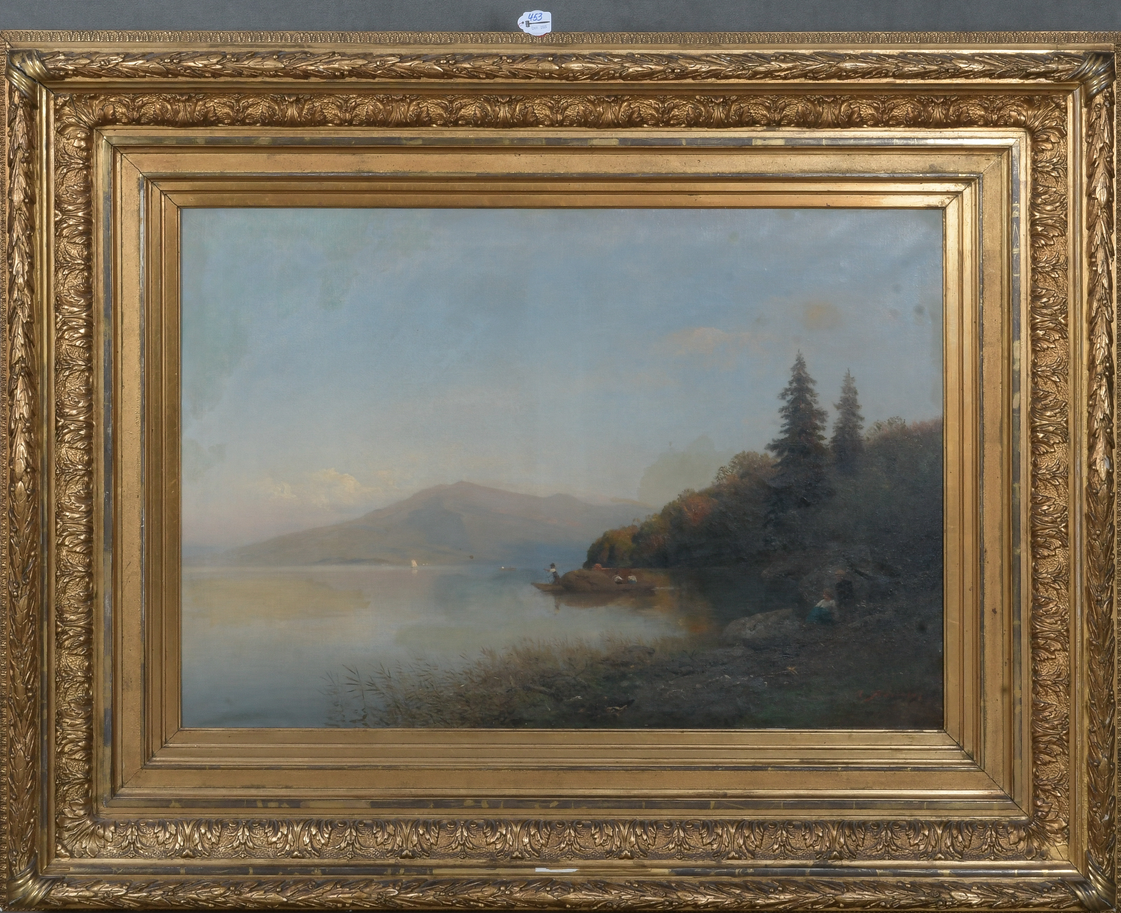 - Katalog-Nr: 453Ante Karlsson-Stig (1885-1967). Gebirgslandschaft mit See, Boot und Personenstaffage. Öl/Lw., re./u./sign., gerahmt, 62,5 x 90 cm.o.L.