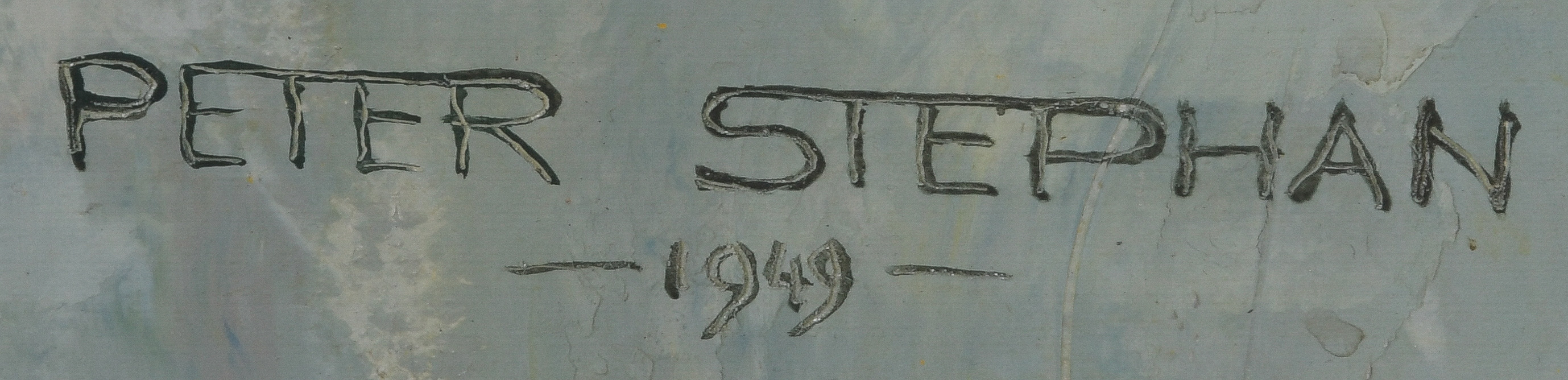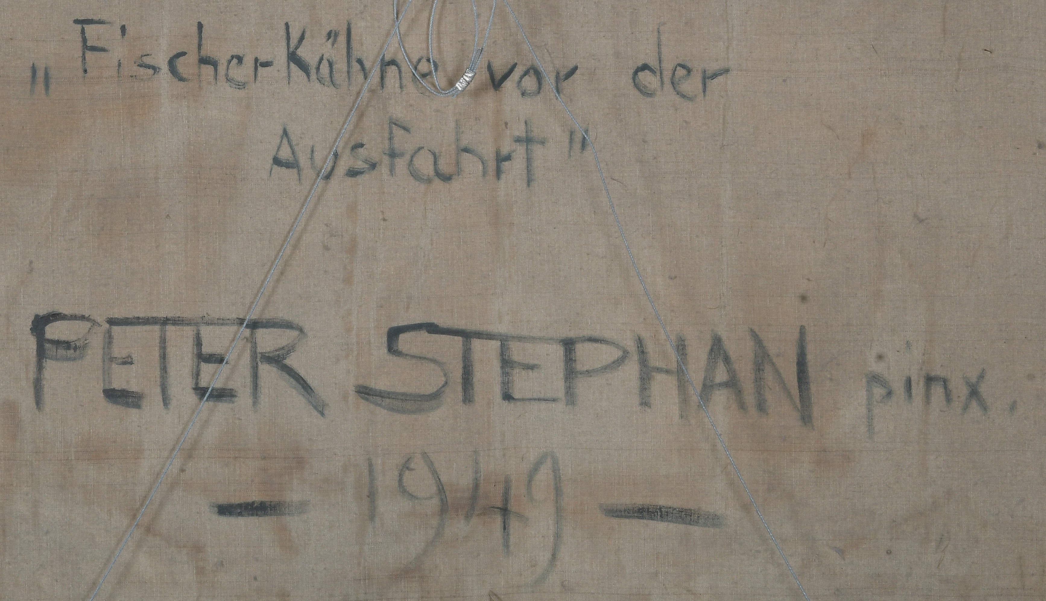 - Katalog-Nr: 454Peter Stephan (1927-2014). „Fischerkähne vor der Ausfahrt“. Öl/Lw., re./u./sign., verso bez./dat. 1949, gerahmt, 90,5 x 100 cm.o.L.
