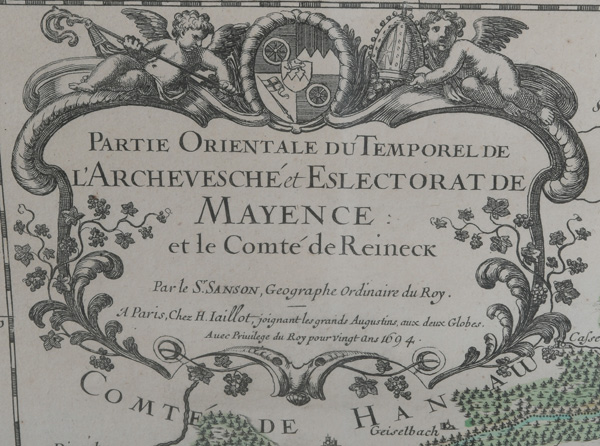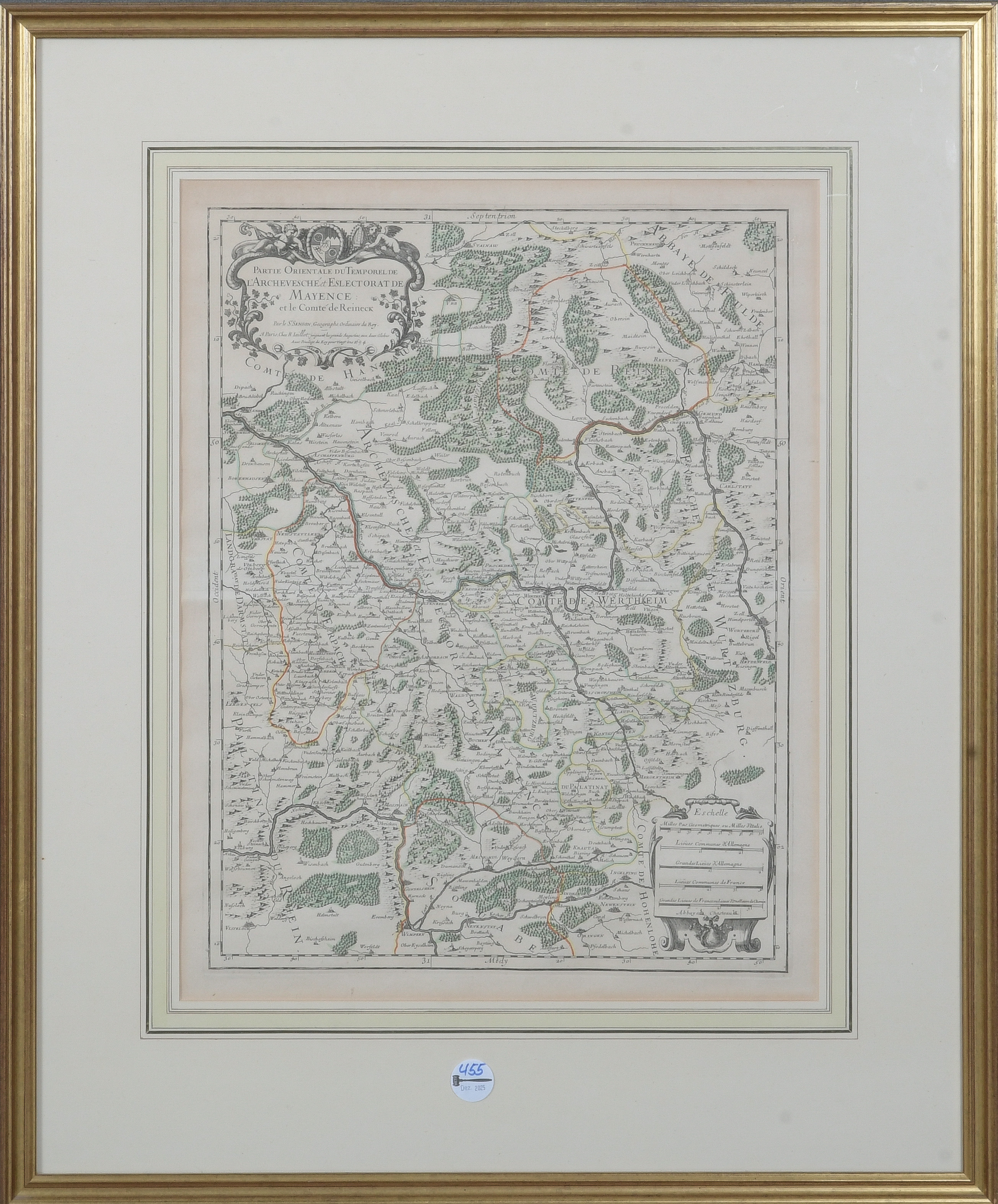 - Katalog-Nr: 455Alexis Hubert Jaillot (1632-1712). Karte von Mainz und Umgebung. Colorierter Kupferstich, re./o./sign./dat. 1694, mit Passepartout hi./Gl. gerahmt, 56 x 42 cm.o.L.