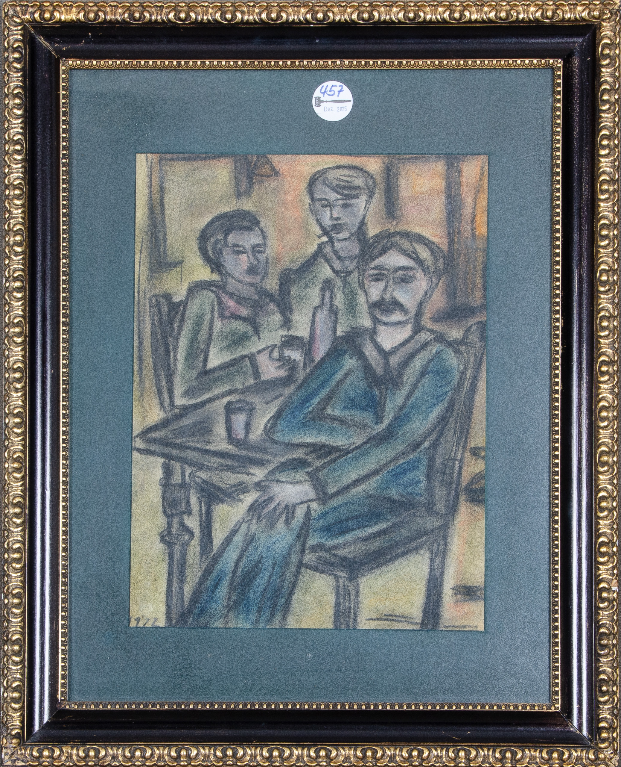 - Katalog-Nr: 457Maler des 20. Jhs. Drei Männer an Tisch sitzend. Kreidezeichnung, re./u./dat. 1922, hi./Gl. gerahmt, 37 x 27 cm.o.L.