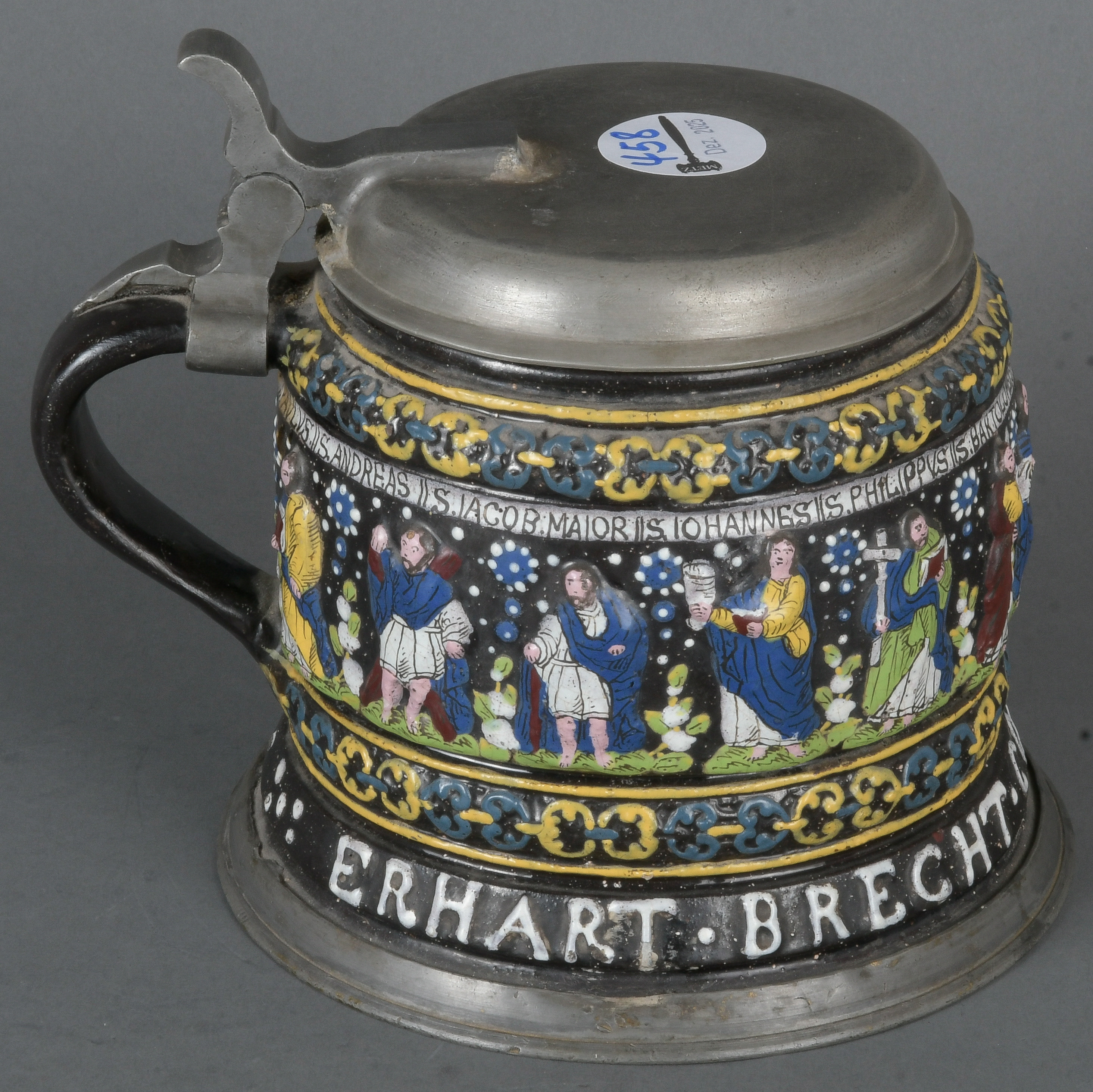 - Katalog-Nr: 458Apostelkrug. Creussen. Steinzeug, umlaufend reliefiert, beschriftet und farbig emailliert, mit Zinnstandring, -montur und -deckel, H=13,7 / 17,2 cm.o.L.