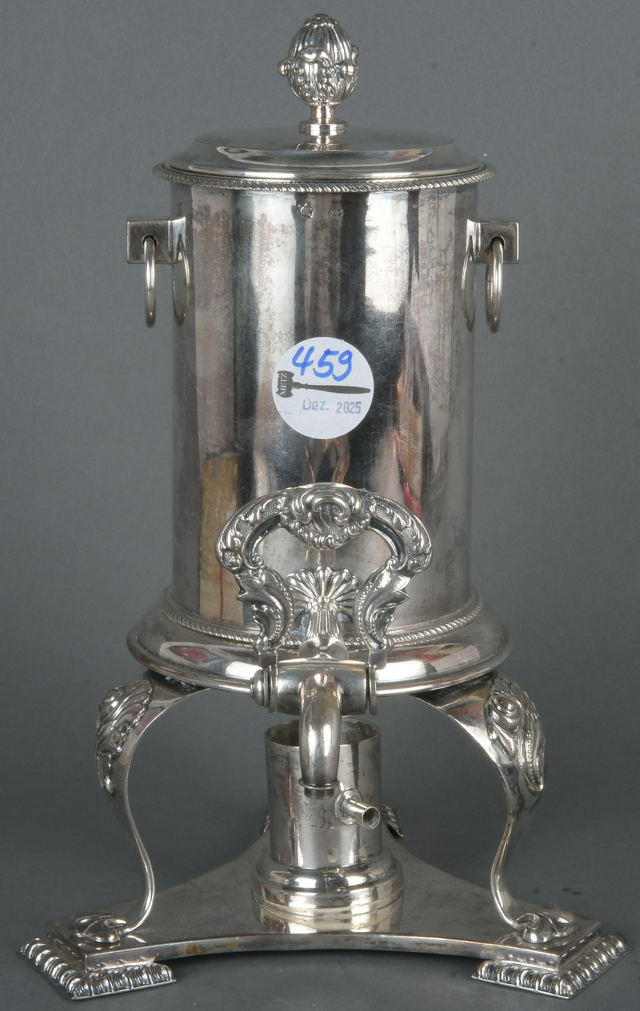 - Katalog-Nr: 459Samovar. Wien 1840. Walzenförmig, auf geschweiften Beinen. Silber, ca. 1.000 g, am Boden Stadtpunze mit Jahreszeichen und Meistermonogramm „C.S.“, H=31 cm. (Brenner fehlt)o.L.