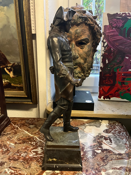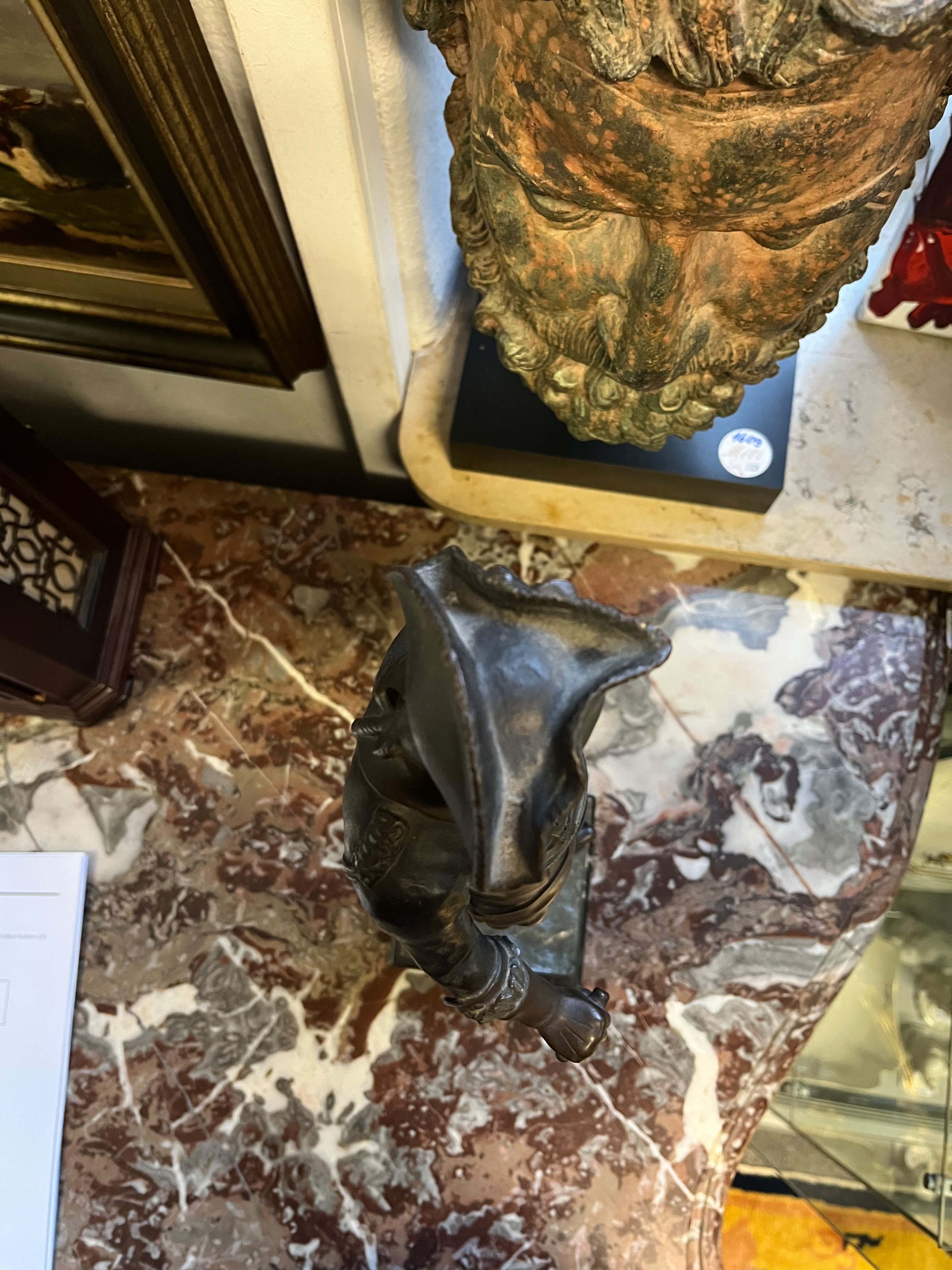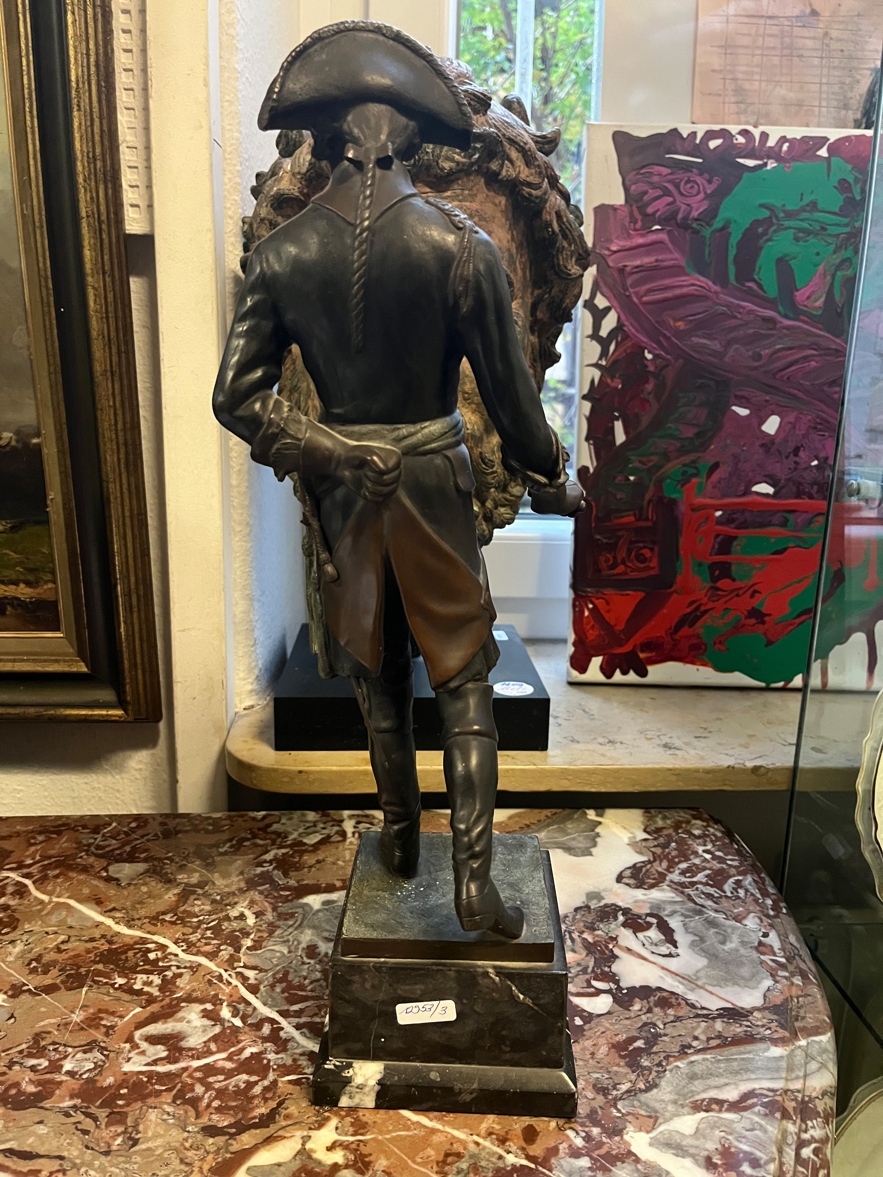 - Katalog-Nr: 460Rudolf Kaesbach (1873-1955). Statue des Alten Fritz. Bronze, brüniert, seitl. sign., auf quadratischem Marmorsockel, H=36,7 / 43,5 cm. (Stock fehlt)o.L.