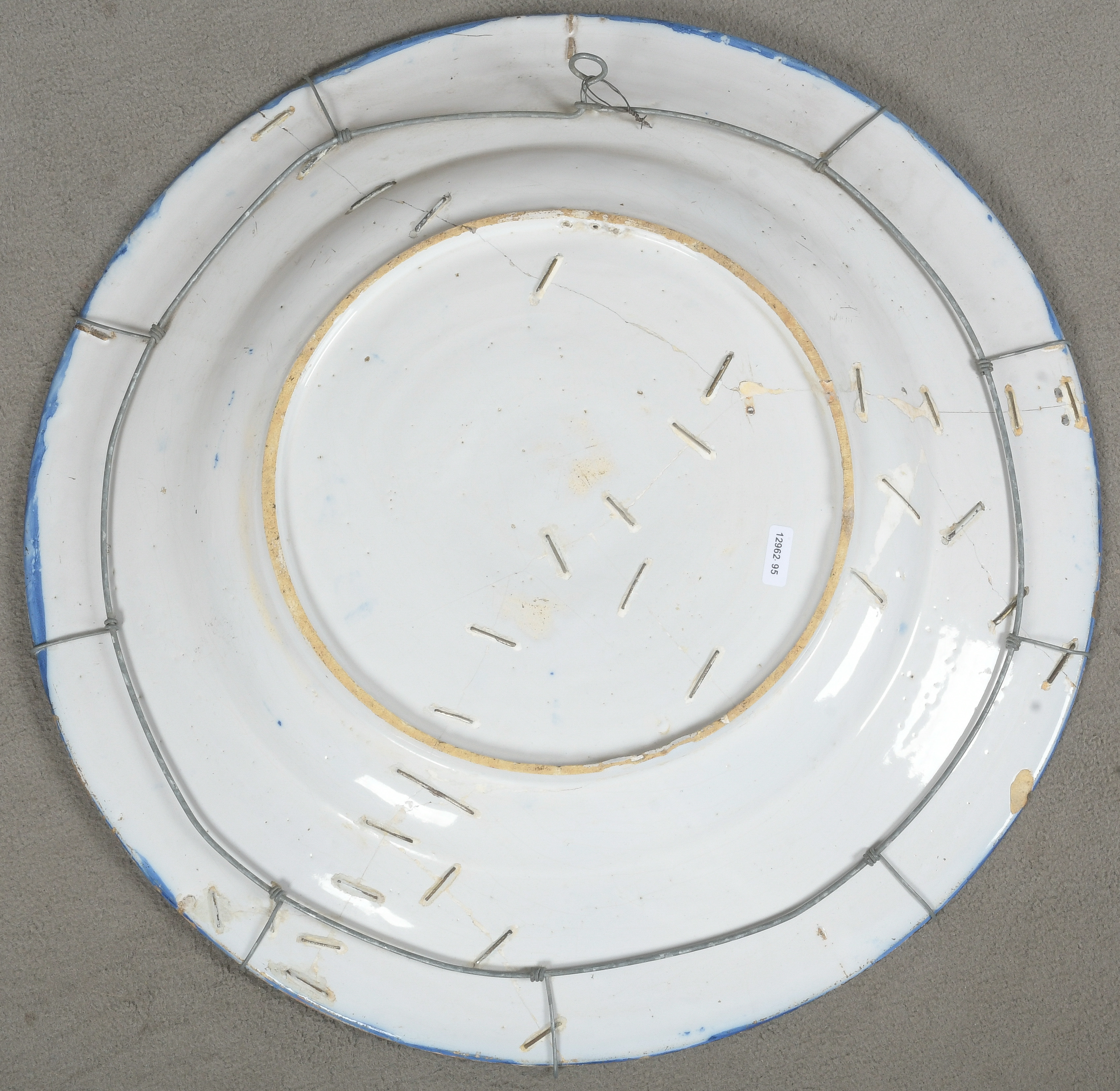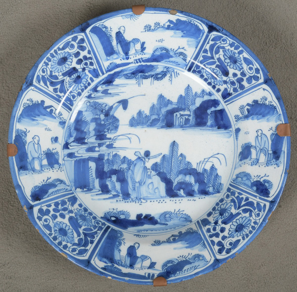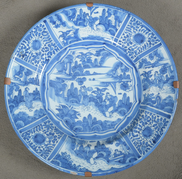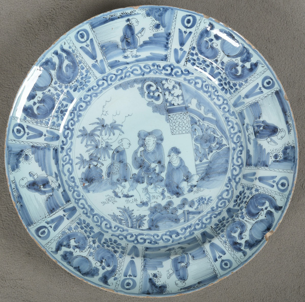 - Katalog-Nr: 461Große, runde Platte. Frankfurt um 1700. Fayence, unterglasurblau bemalt mit Chinoiserien, ohne Marke, D=47 cm. Provenienz: Sammlung Bruno Sandner, Hofheim. (rest.)o.L.