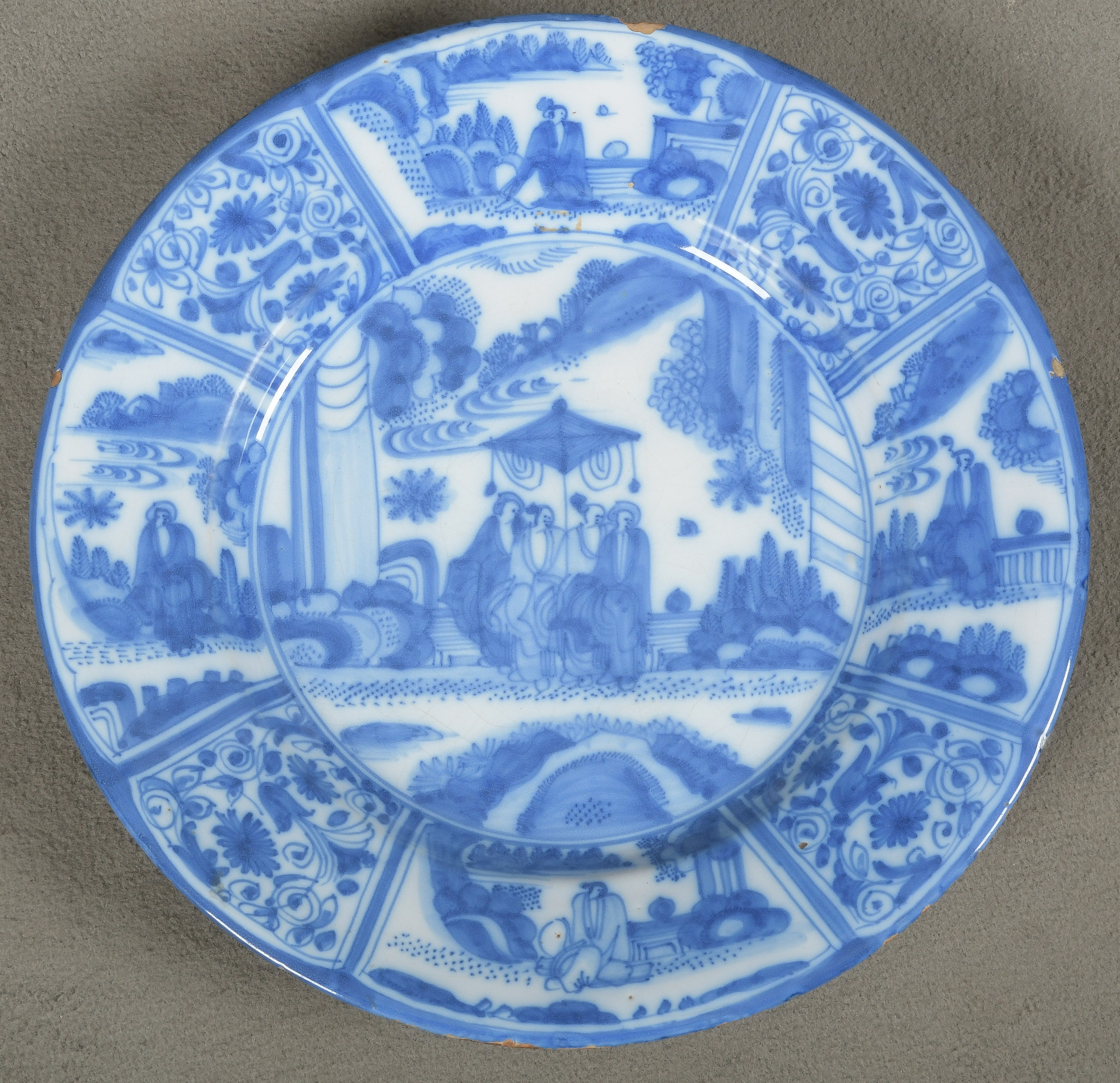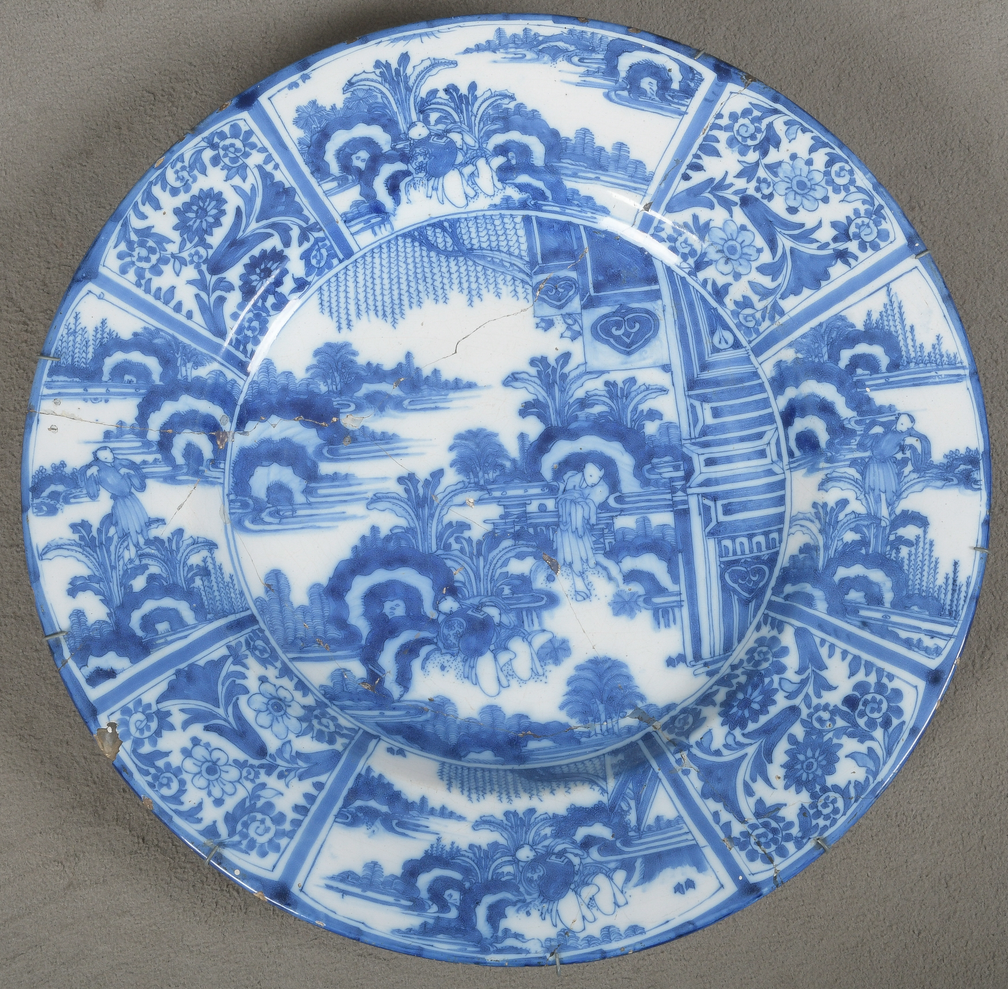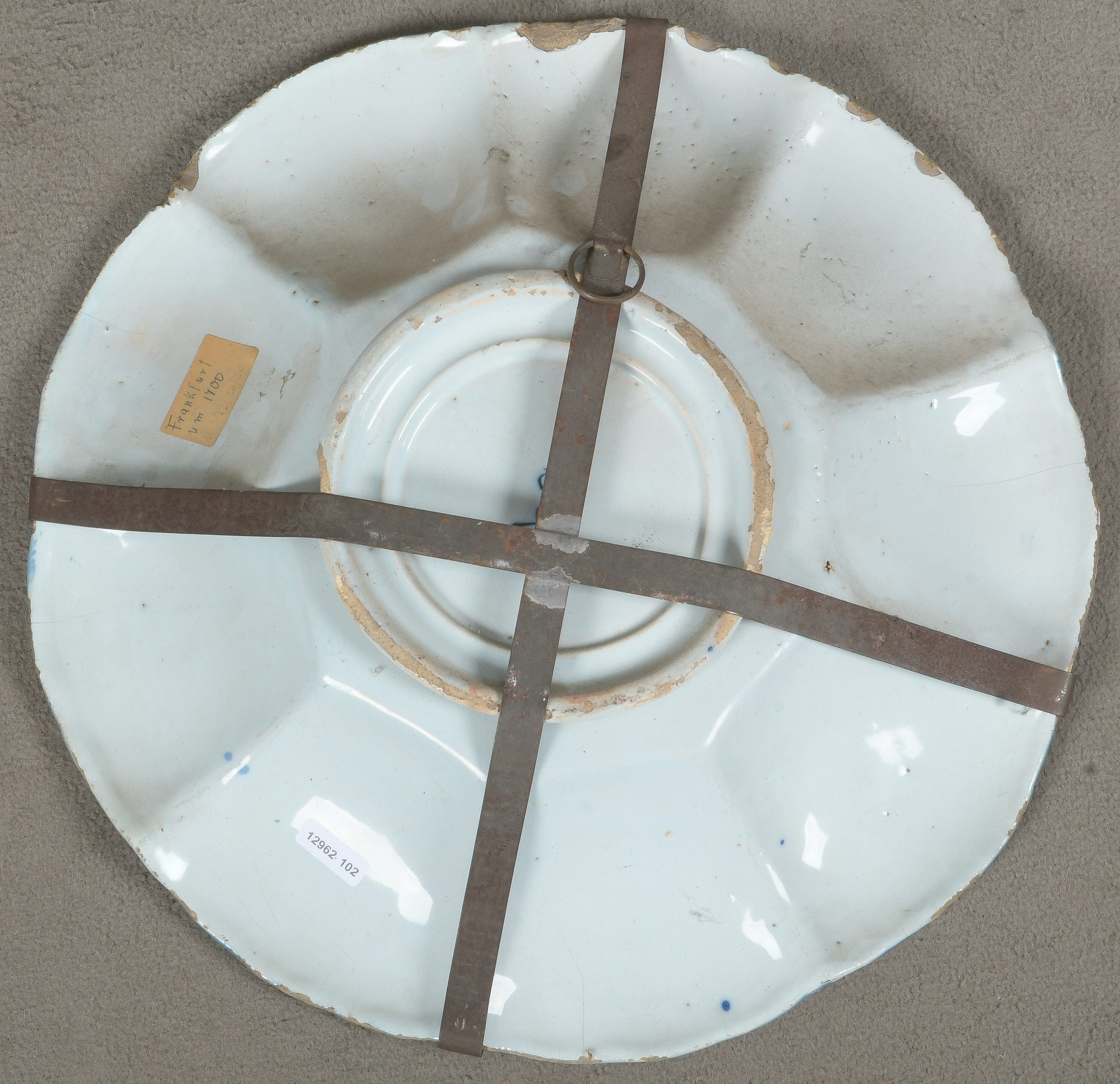- Katalog-Nr: 465Fächerplatte. Frankfurt um 1700. Fayence, unterglasurblau bemalt mit Chinoiserien, ohne Marke, D=34,5 cm. Provenienz: Sammlung Bruno Sandner, Hofheim. (Standring best.)o.L.