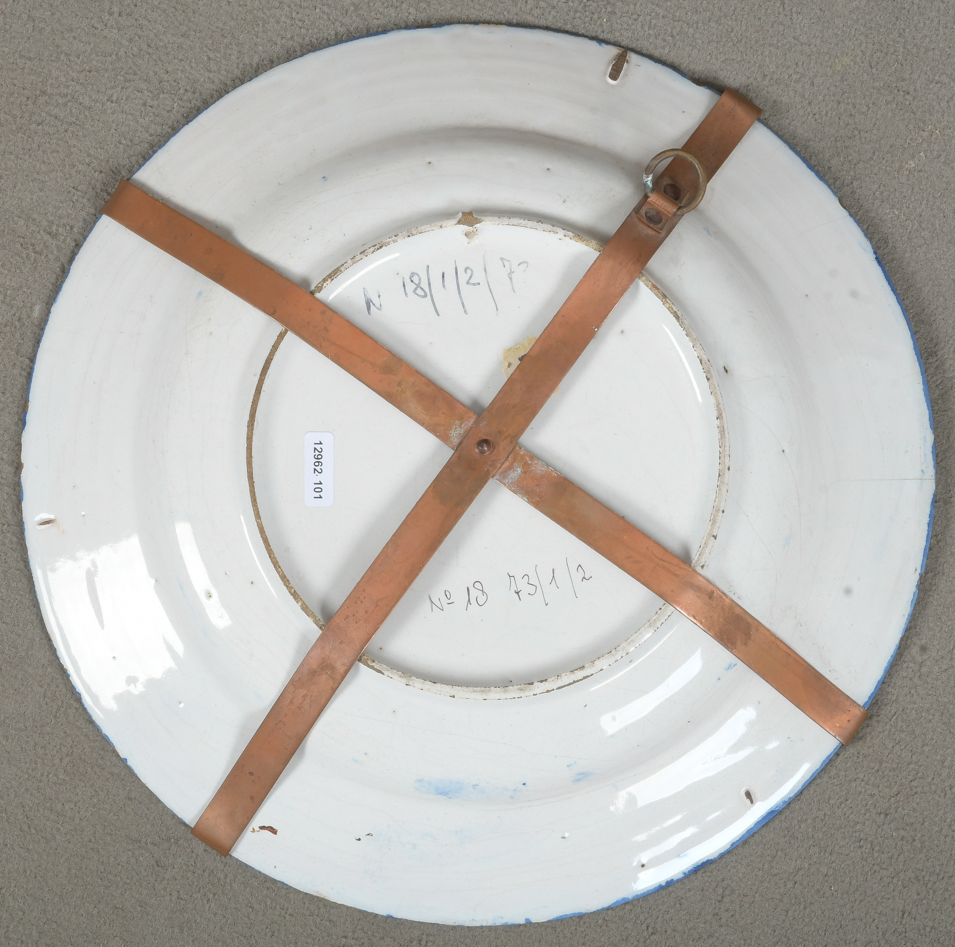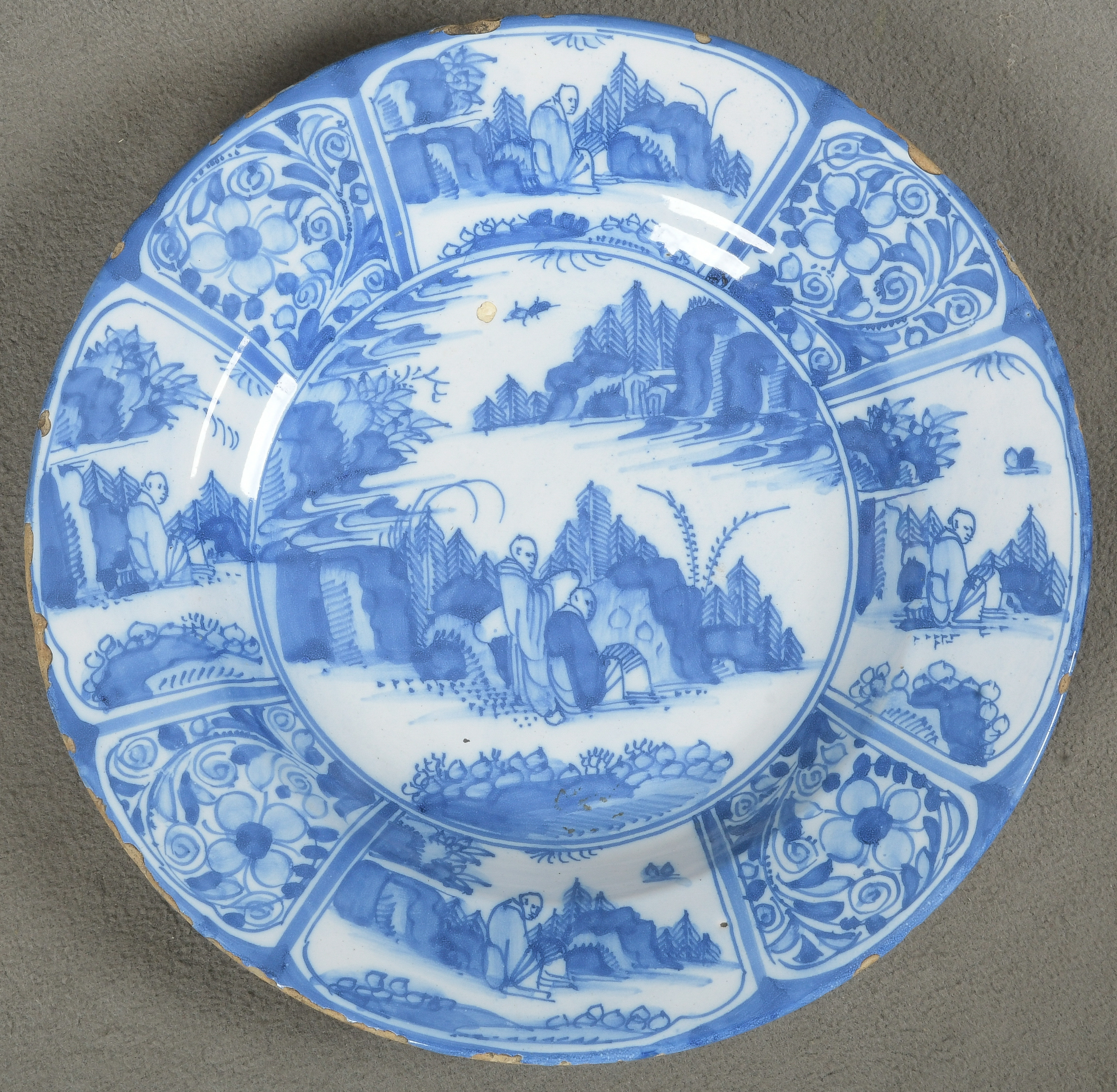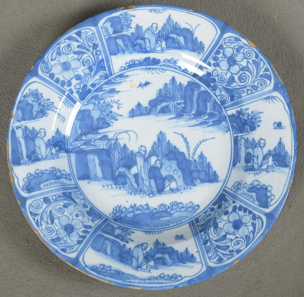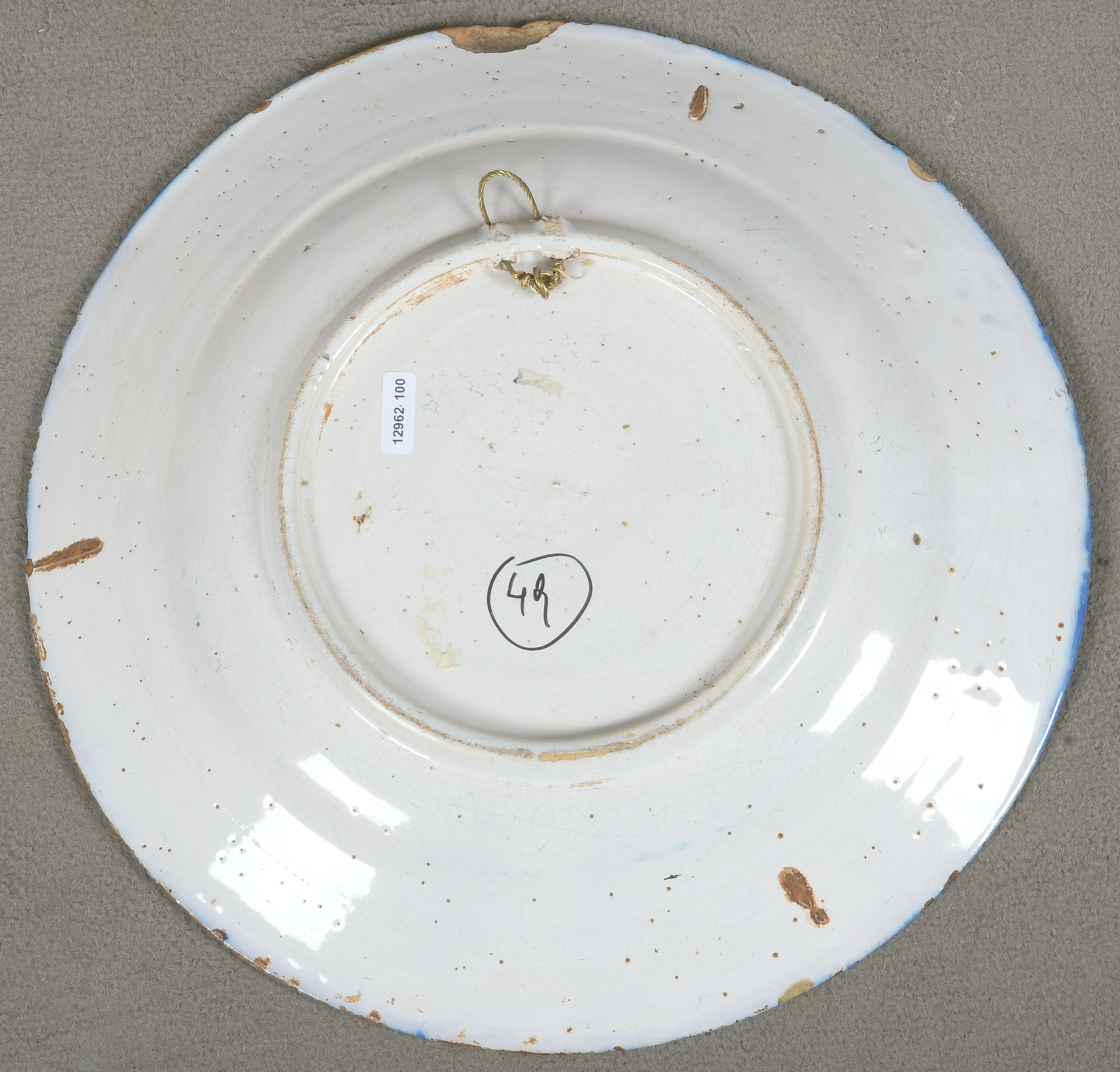 - Katalog-Nr: 465Fächerplatte. Frankfurt um 1700. Fayence, unterglasurblau bemalt mit Chinoiserien, ohne Marke, D=34,5 cm. Provenienz: Sammlung Bruno Sandner, Hofheim. (Standring best.)o.L.