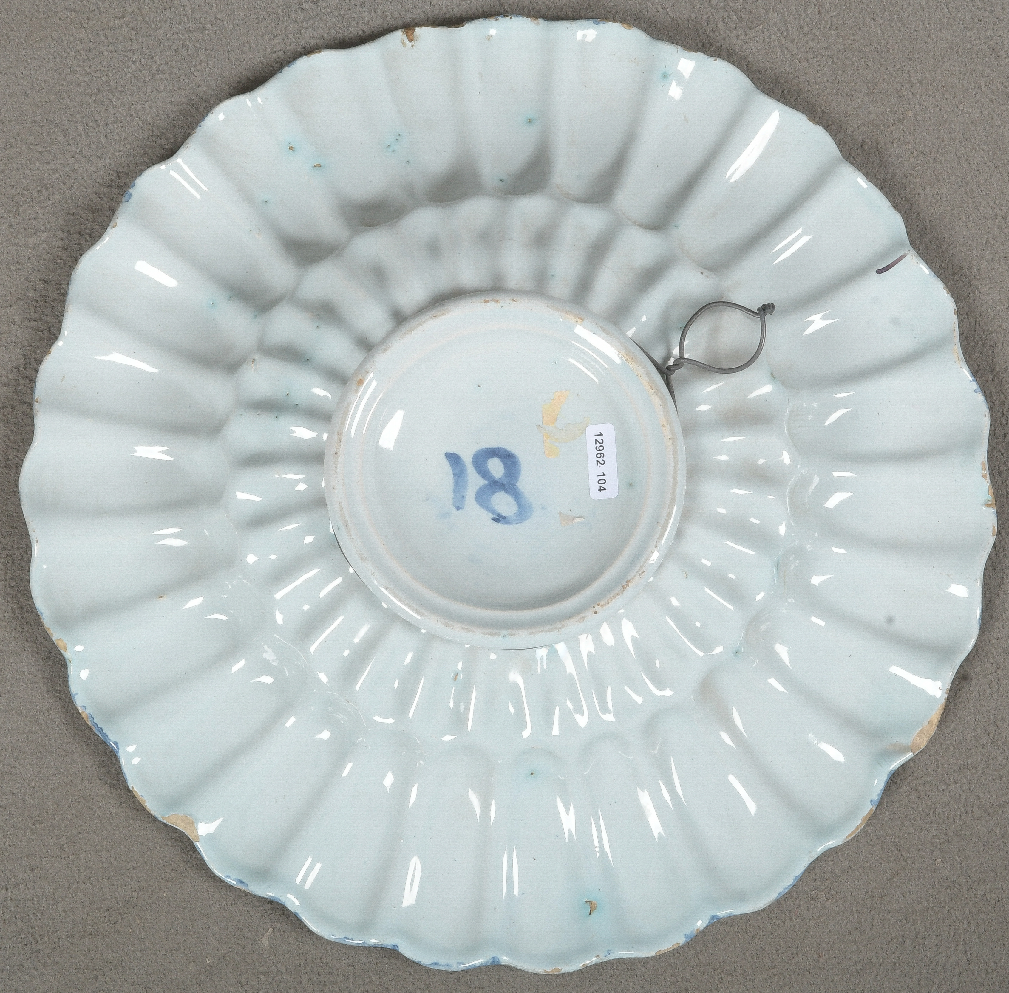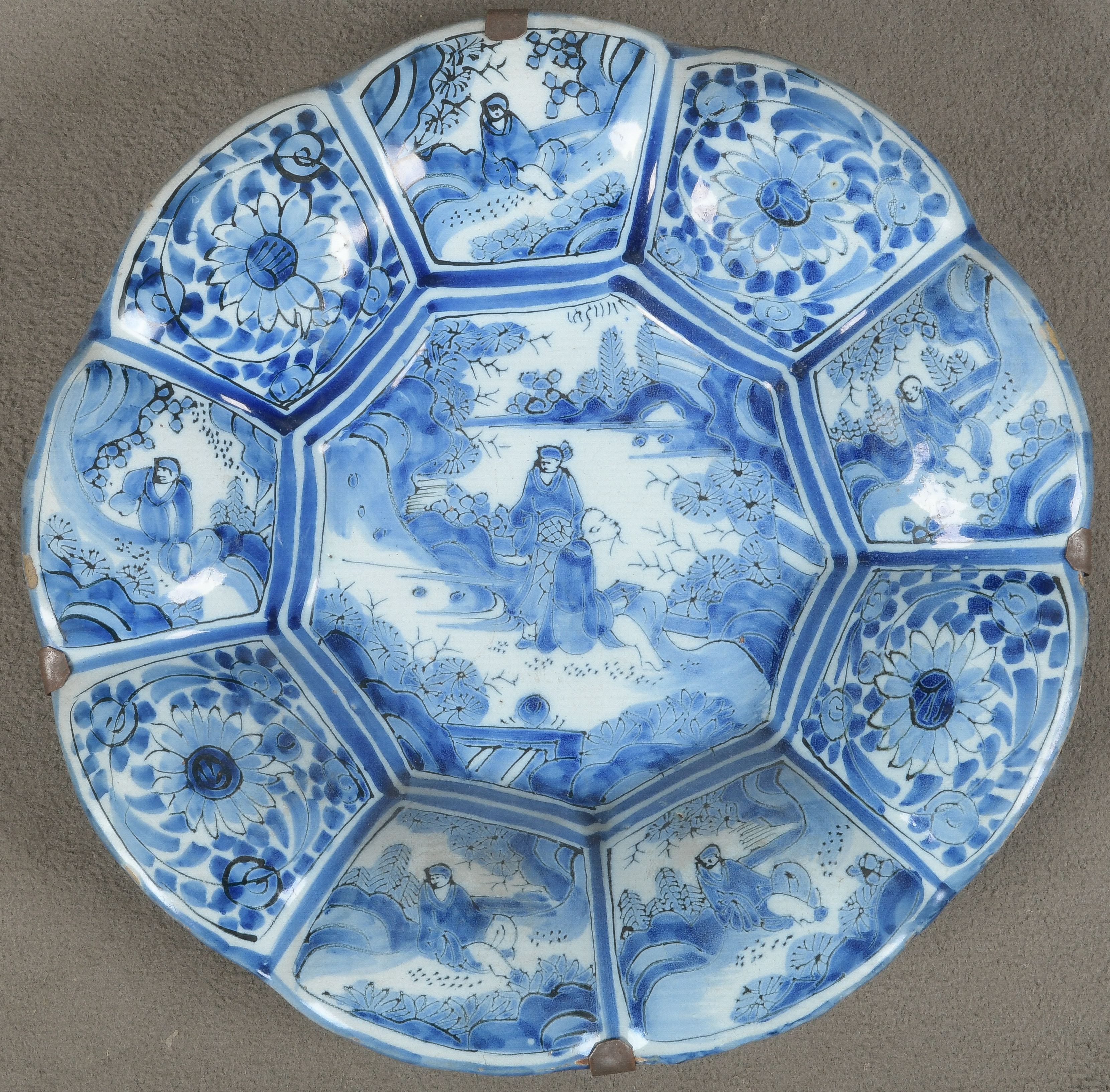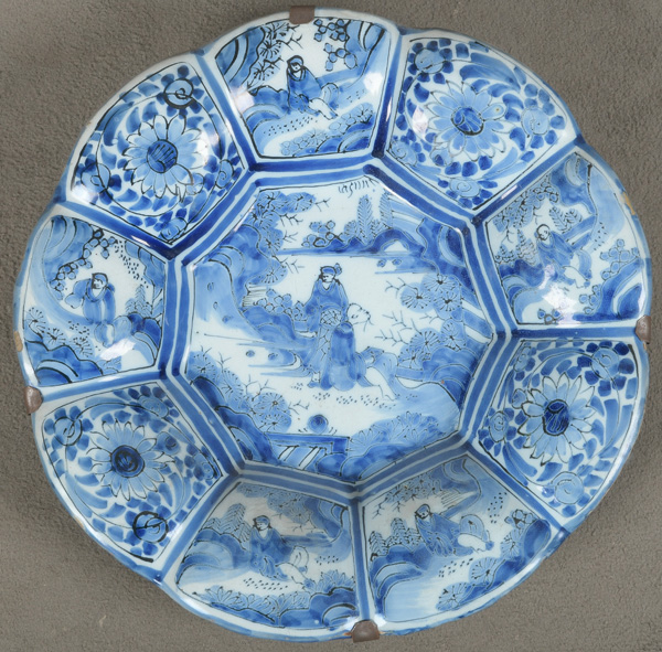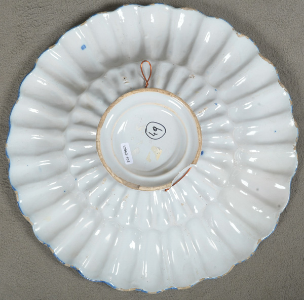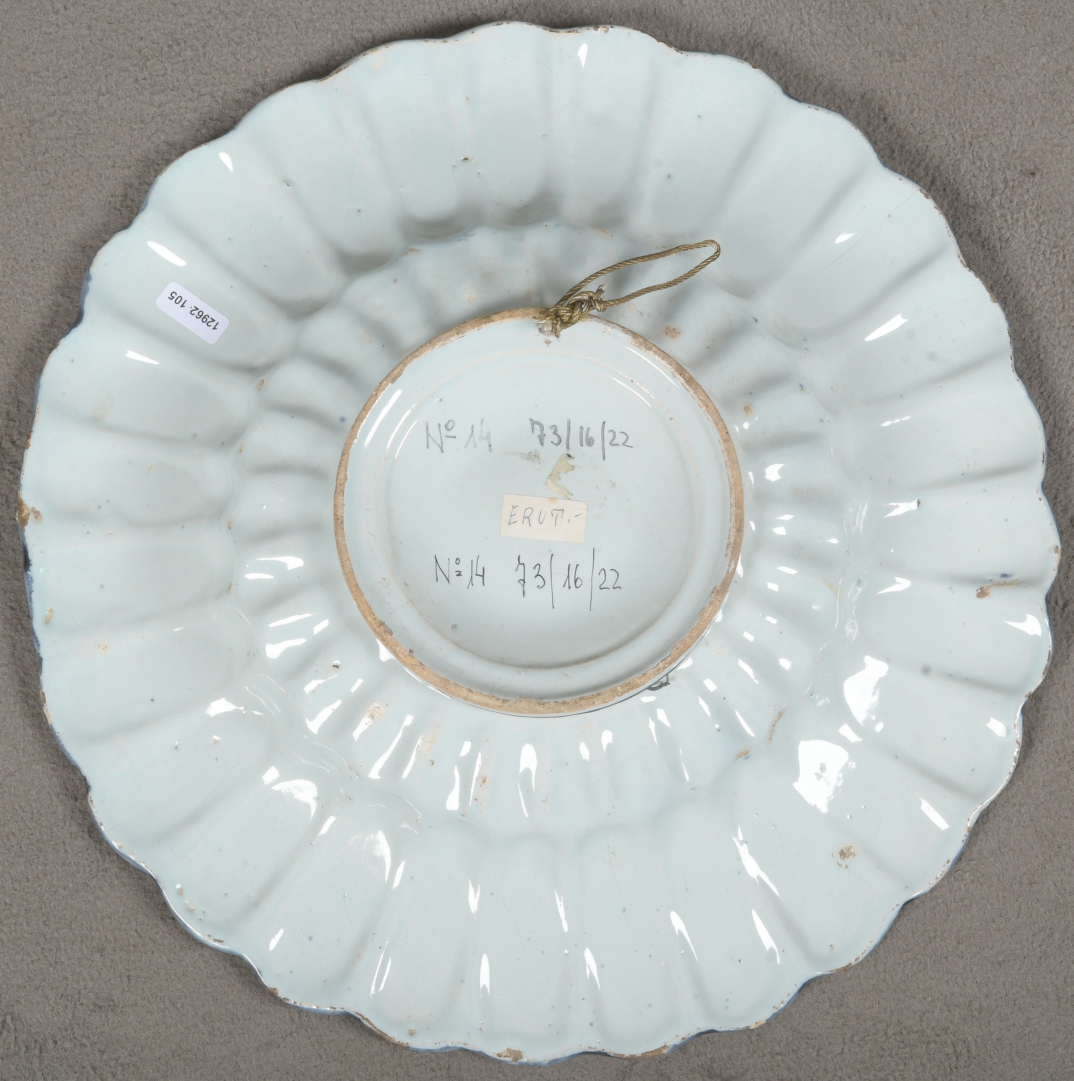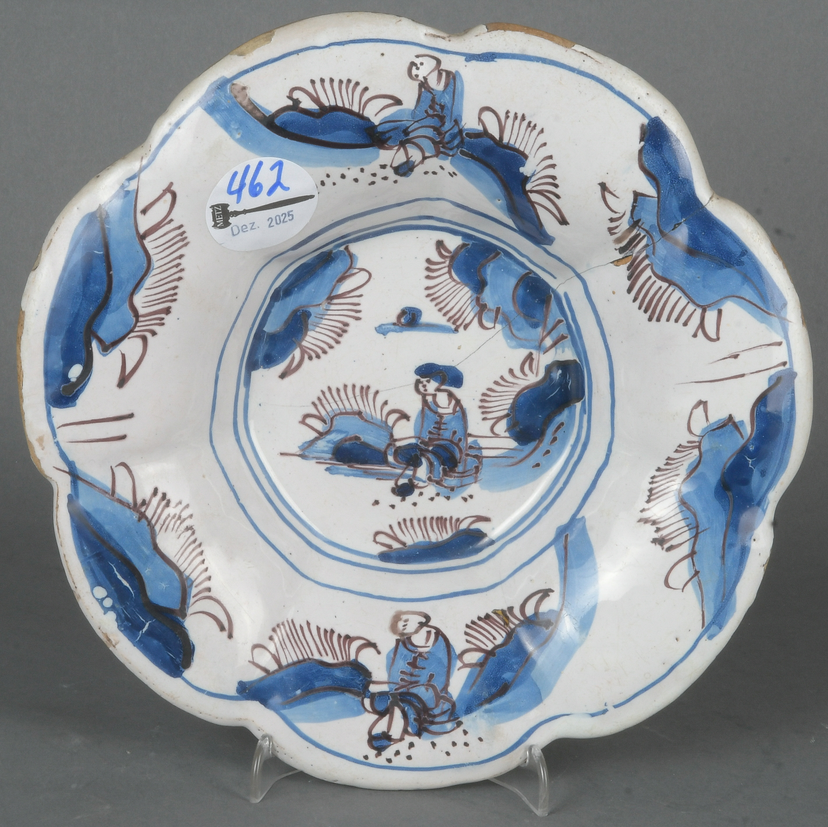 - Katalog-Nr: 464Fächerplatte. Frankfurt um 1700. Fayence, unterglasurblau bemalt mit Chinoiserie, verso Ziffer „18“, D=34 cm. Provenienz: Sammlung Bruno Sandner, Hofheim.o.L.