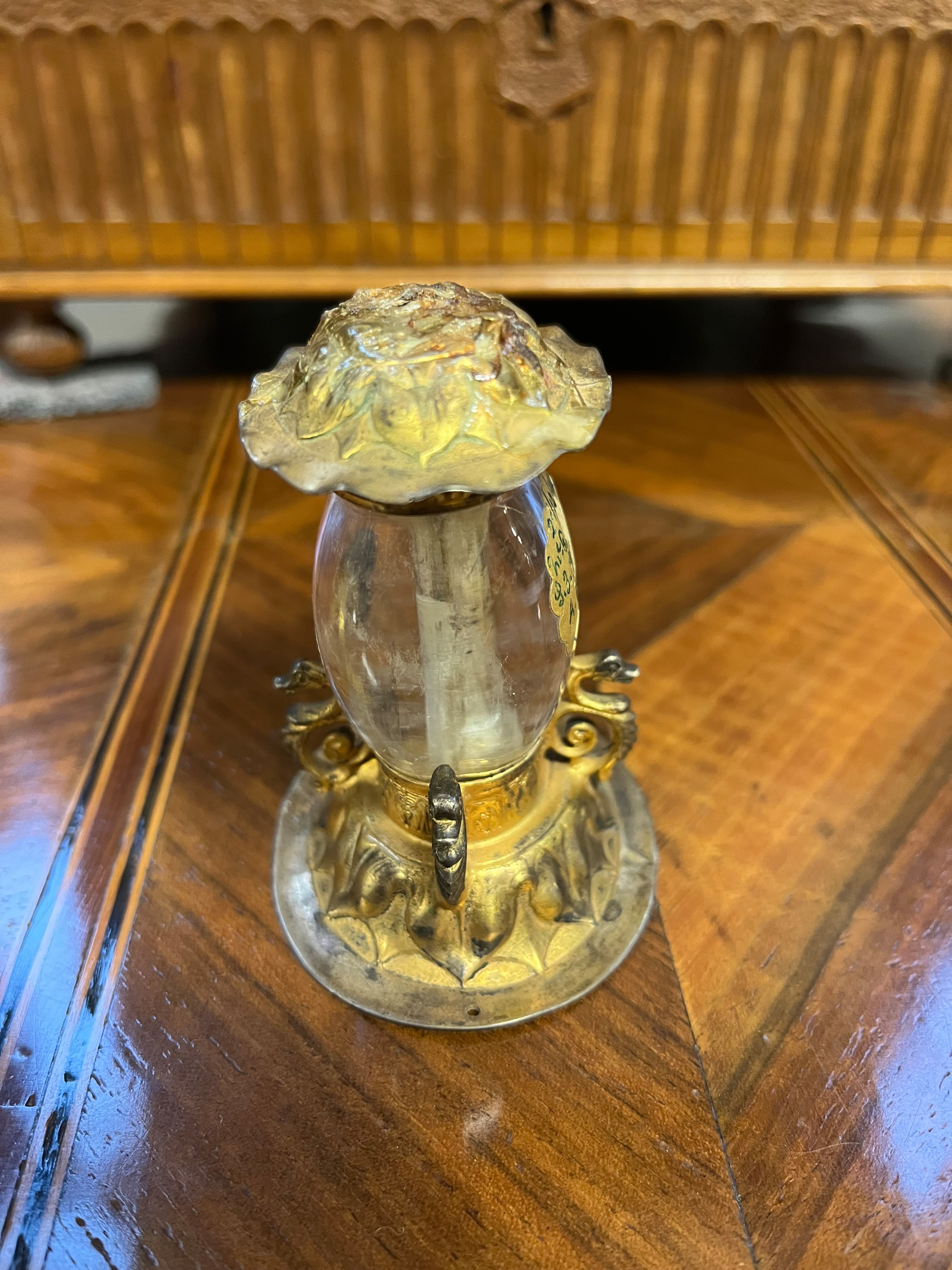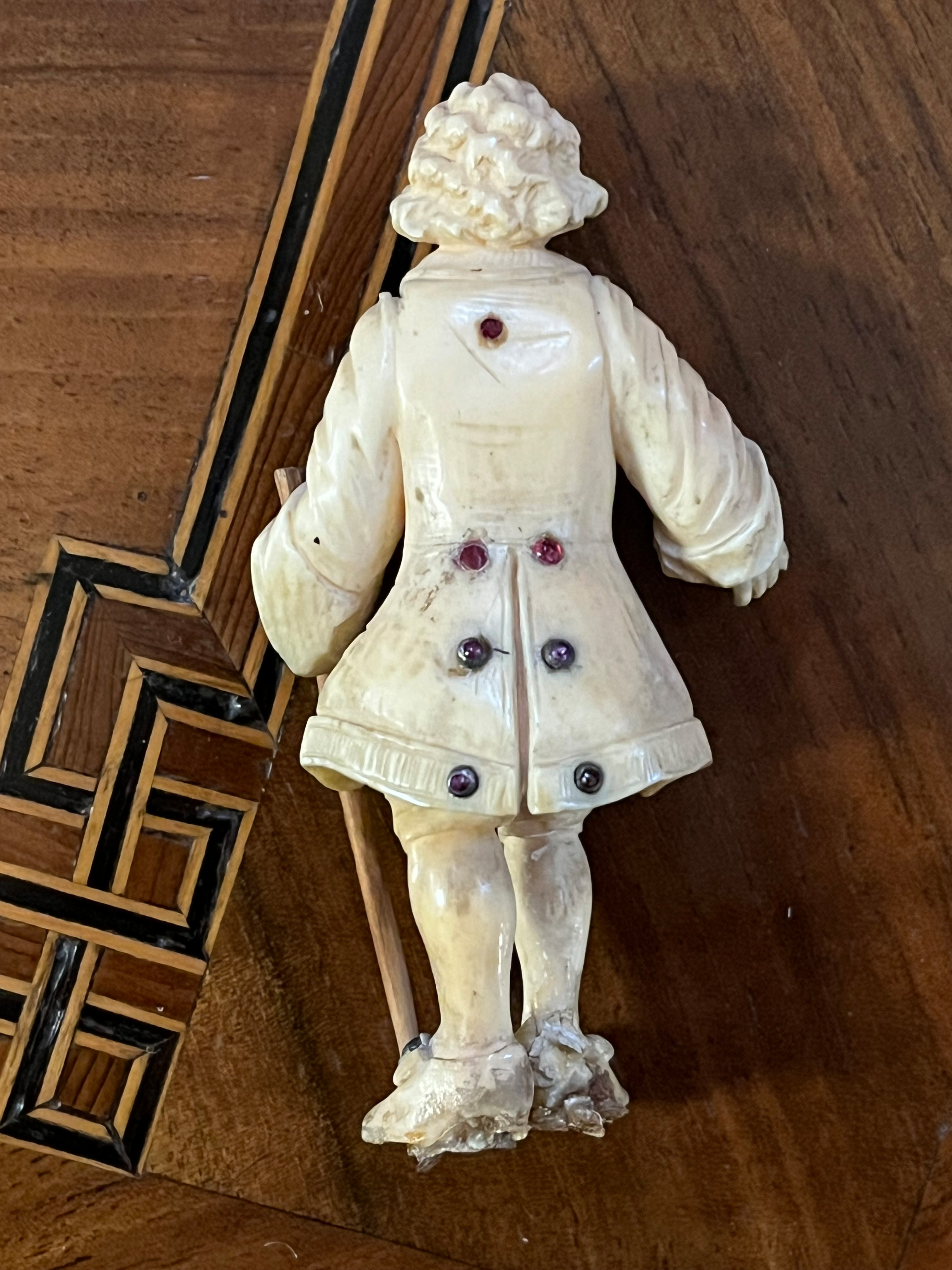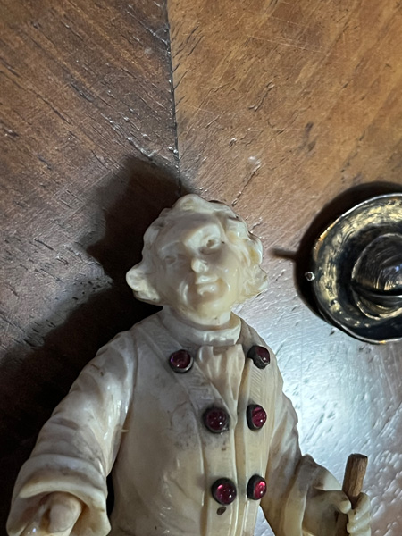 - Katalog-Nr: 473Johann Melchior Dinglinger (Biberach 1664 - 1731 Dresden) attrib. Stehender Edelmann mit Stock und Hut. Elfenbein, geschnitzt, montiert auf ovalen Bergkristall mit vergoldetem Silberstandfuß und -standfläche, H=9 cm. Elfenbein-Gutachten und EU-Verkaufsgenehmigung liegen vor und können für EUR 150,00 erworben werden. This item is illegal to sell to the U.K.o.L.