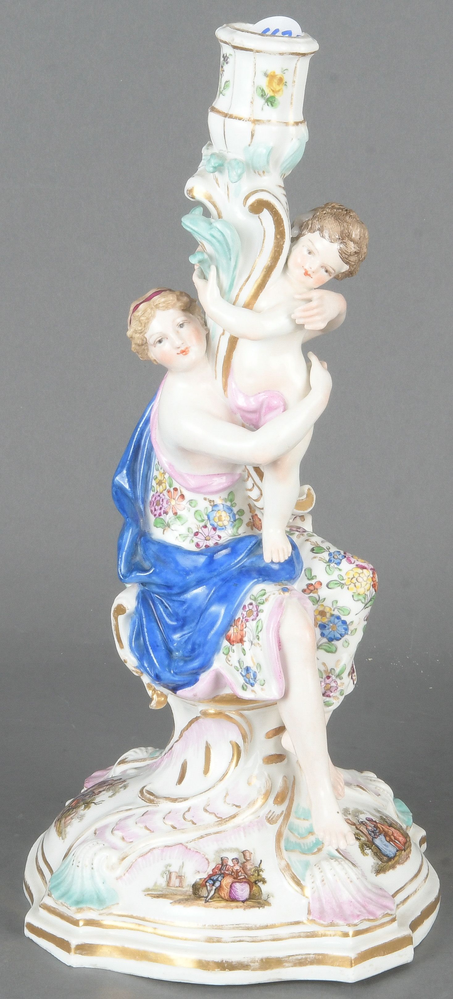 - Katalog-Nr: 475Leuchter. Meissen 19. Jh. Porzellan, bunt bemalt mit Watteauszenen in Parklandschaft; am Boden unterglasurblaue Schwertermarke mit Schleifstrichen, Modell nach Johann Joachim Kaendler, H=32 cm.o.L.