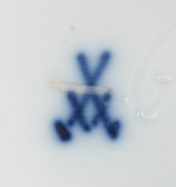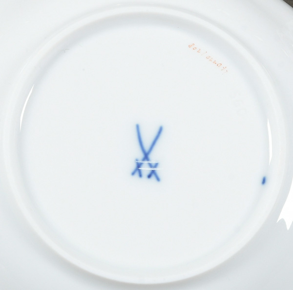 - Katalog-Nr: 45616-tlgs. Mokkaservice. Meissen 20. Jh. Porzellan, bunt bemalt mit Floraldekor; am Boden unterglasurblaue Schwertermarke. Bestehend aus: Eine Mokkakanne (H=16,5 cm), ein Milchgießer (H=8 cm), eine Zuckerdose (H=8,5 cm), sechs Mokkatassen mit Unterschalen und sieben Gebäckteller (D=14 cm).o.L.