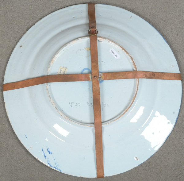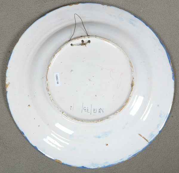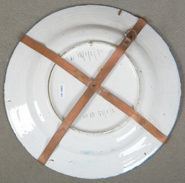 - Katalog-Nr: 471Runde Platte. Frankfurt um 1700. Fayence, unterglasurblau bemalt mit Chinoiserien, verso gemarkt, D=38 cm. Provenienz: Sammlung Bruno Sandner, Hofheim.o.L.