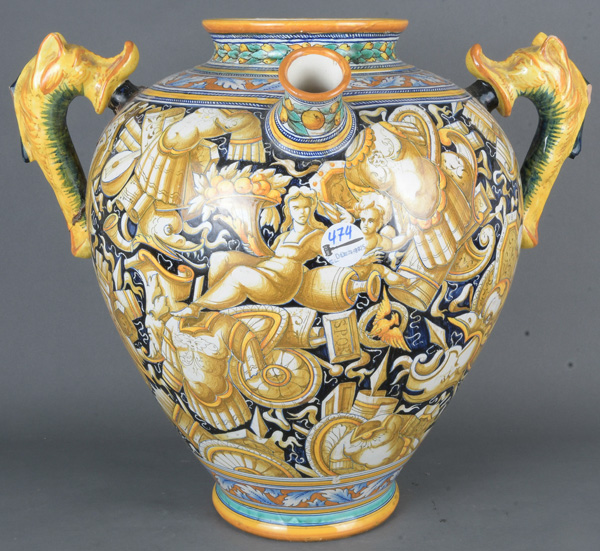 - Katalog-Nr: 474Große Henkelamphore. Italien. Fayence, aufwendig bunt bemalt; am Boden gemarkt, H=40 cm.o.L.