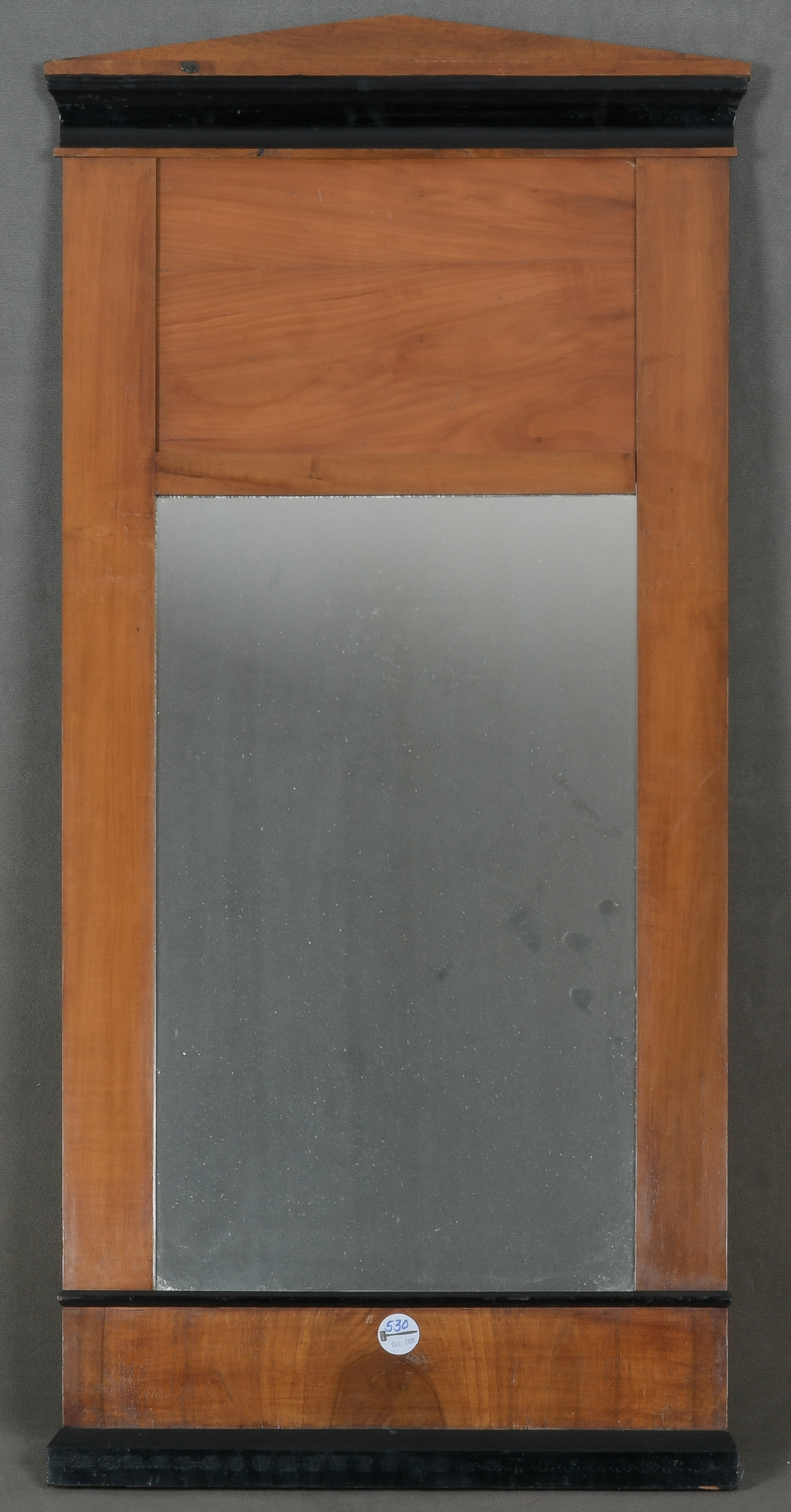 - Katalog-Nr: 530Biedermeier-Spiegel. Deutsch 19. Jh. Massiv Kirschbaum, teilw. furniert und ebonisiert; profilierter Rahmen mit Spitzgiebel, 111 x 53 cm.o.L.