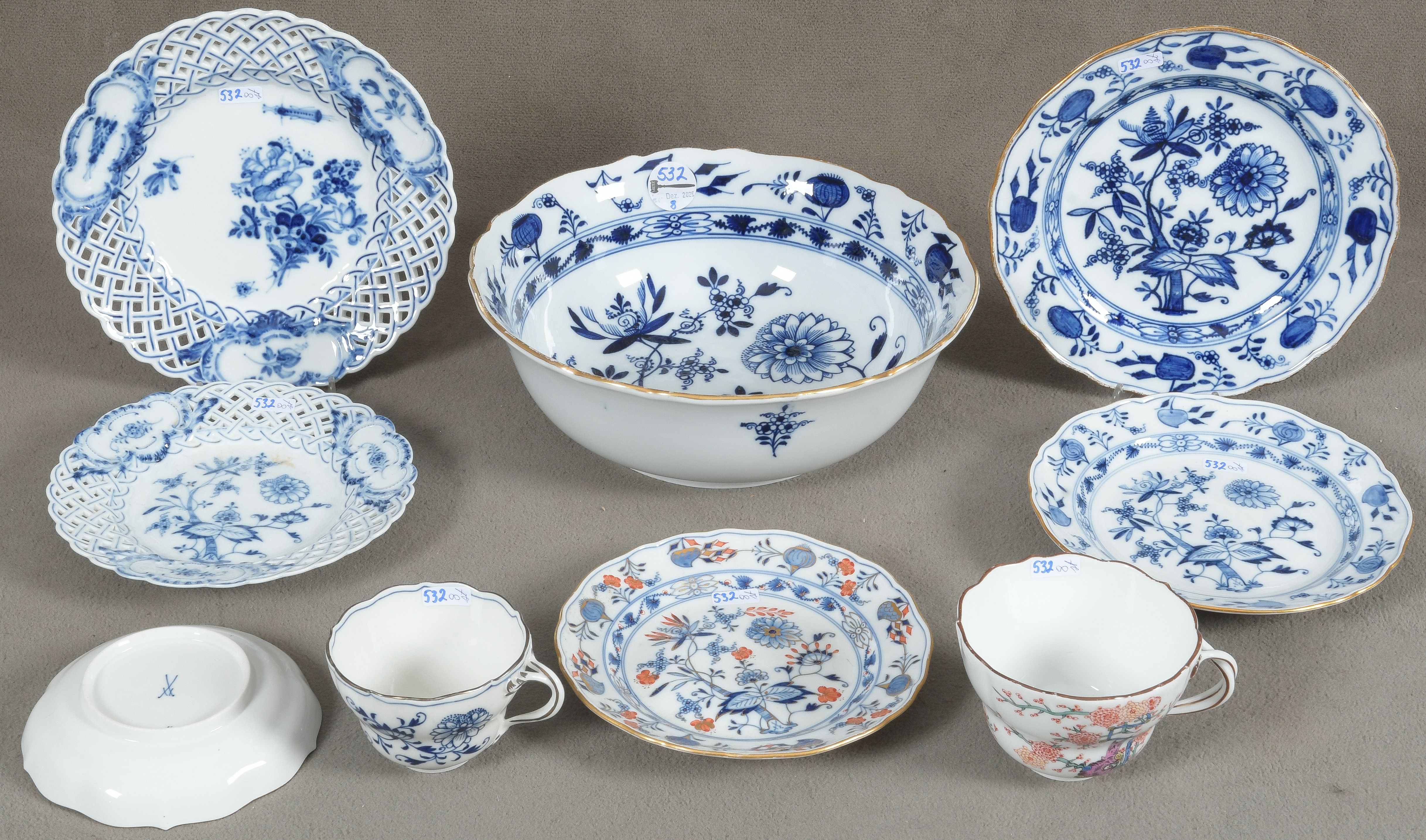 - Katalog-Nr: 532Siebentlgs. Service „Zwiebelmuster“. Meissen 19./20. Jh. Porzellan, unterglasurblau bemalt, teilw. mit Goldrand; am Boden unterglasurblaue Schwertermarke, teilw. mit zwei Schleifstrichen. Bestehend aus: Eine große, runde Schale (H=10,5 cm, D=30 cm), zwei Durchbruchsteller (D=20 / 23,5 cm), zwei Beilageteller (D=19,5 / 21,5 cm), ein Teller (D=24 cm), eine Tasse mit Unterschale; dazu eine weitere Tasse mit Drachendekor.o.L.
