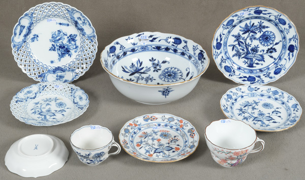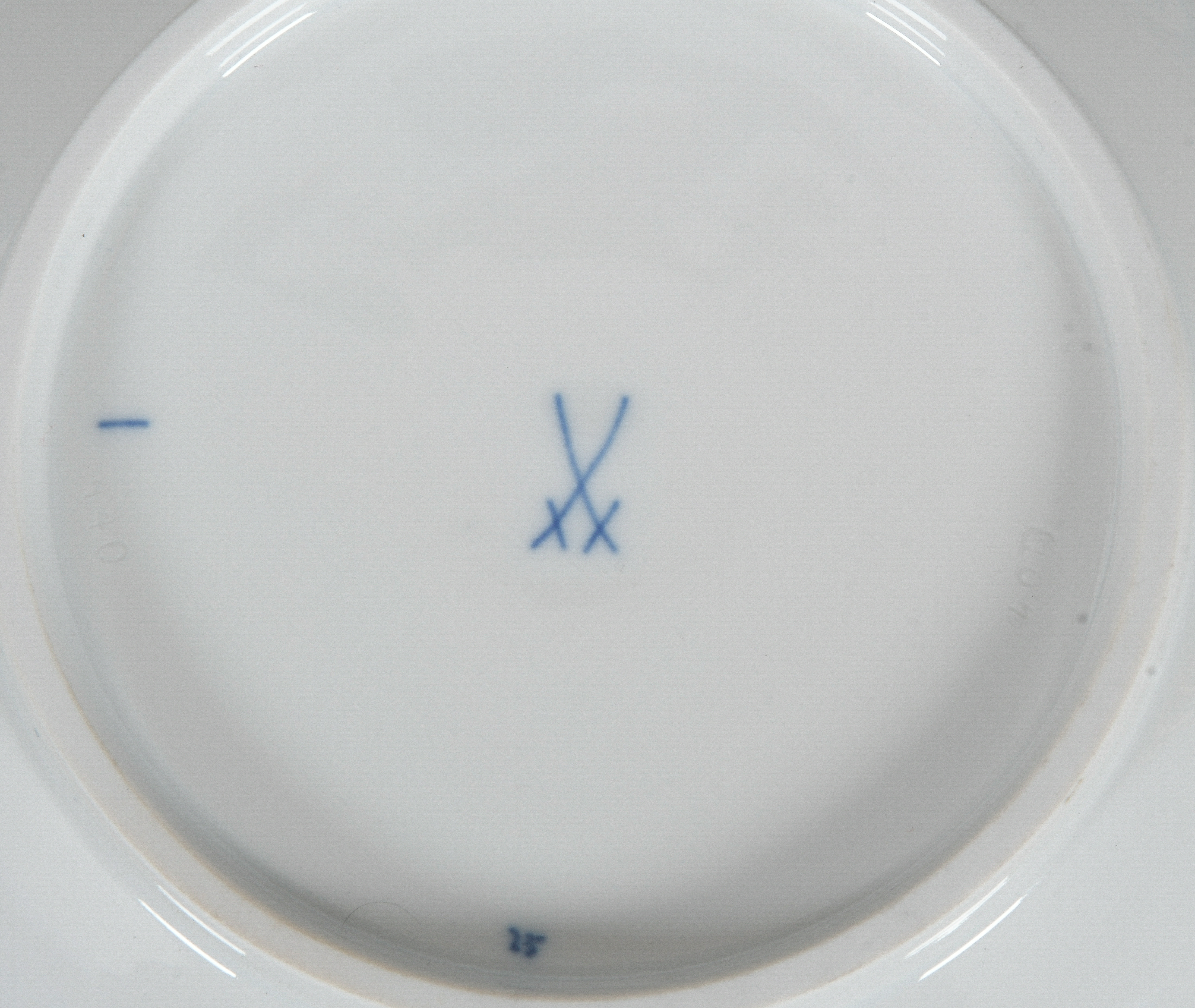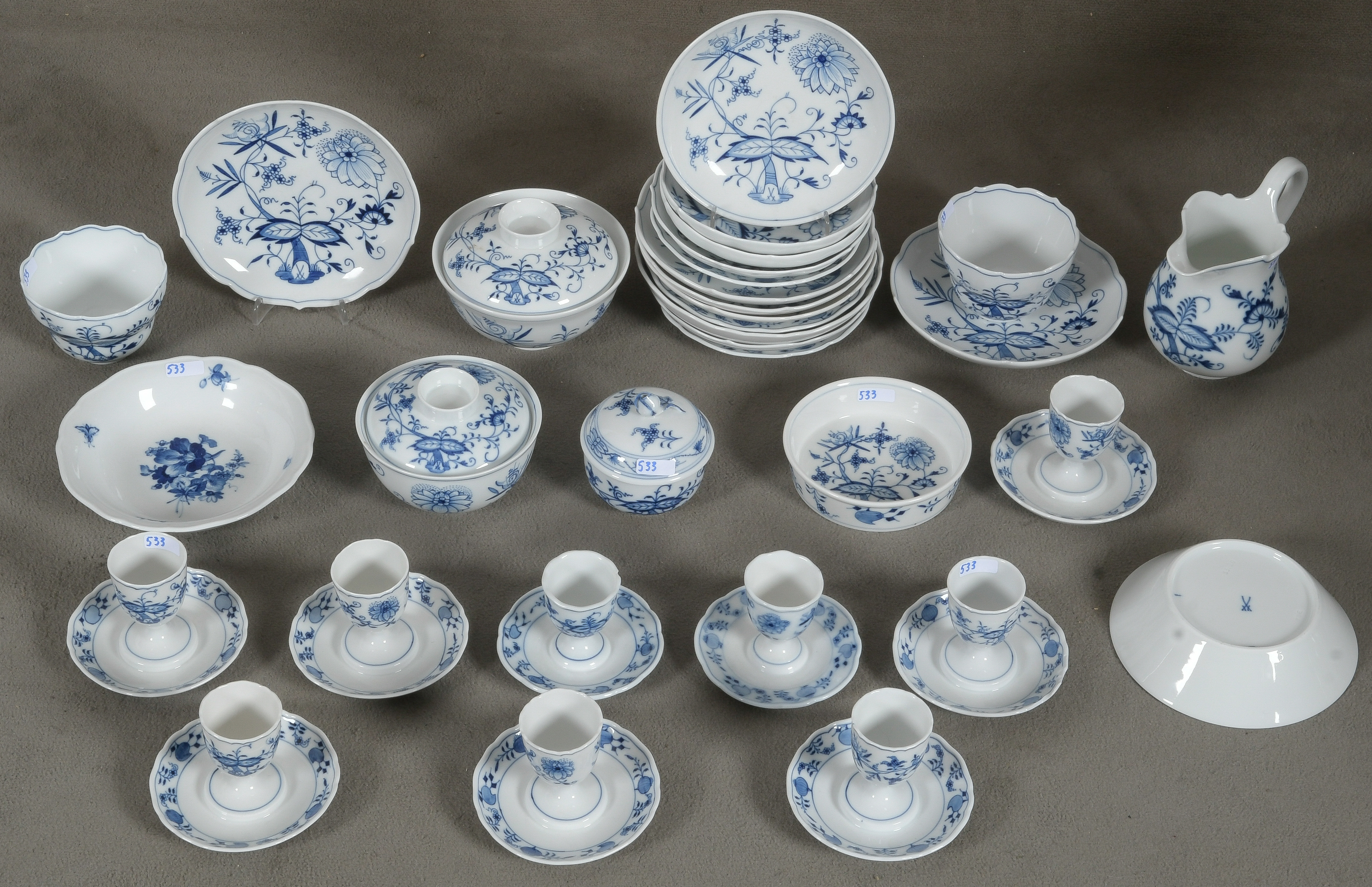 - Katalog-Nr: 53330-tlgs. Service „Zwiebelmuster“. Meissen 19./20. Jh. Porzellan, unterglasurblau bemalt; am Boden unterglasurblaue Schwertermarke, teilw. mit zwei Schleifstrichen. Bestehend aus: Zwei runde Schalen (H=4 cm, D=16 / 17 cm), eine runde Schale (H=3 cm, D=12,5 cm), zwei Reisschalen (H=10 / 12 cm, D=12 / 14 cm), ein Milchgießer (H=14 cm), eine Zuckerdose (H=9 cm), neun Eierbecher (H=je 8 cm) zwei Tassen mit Unterschalen sowie zwölf Unterschalen (D=15 bis 18 cm).o.L.