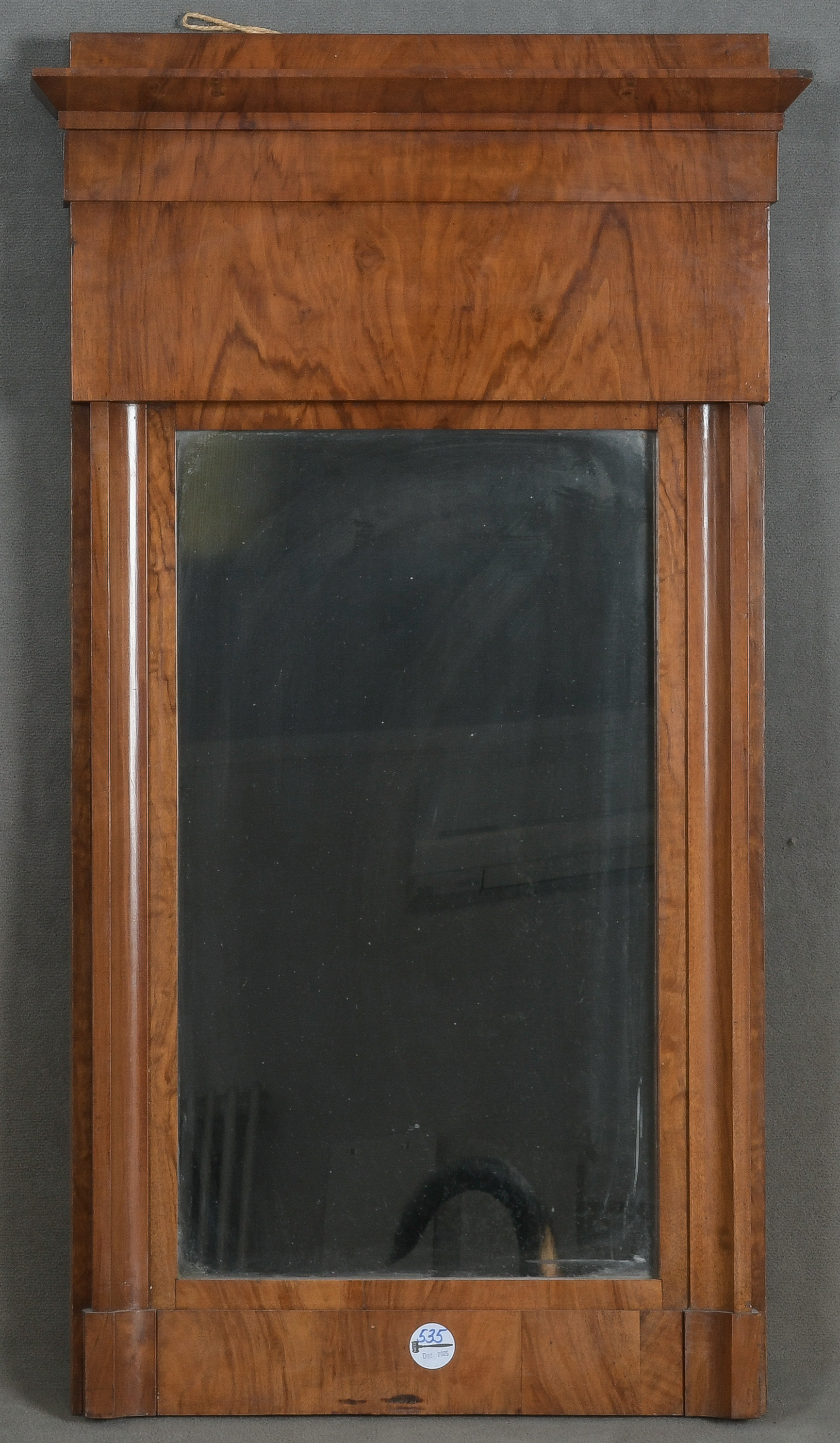 - Katalog-Nr: 535Biedermeier-Spiegel. Deutsch 19. Jh. Nussbaum furniert, teilw. massiv, 95 x 53,5 cm.o.L.