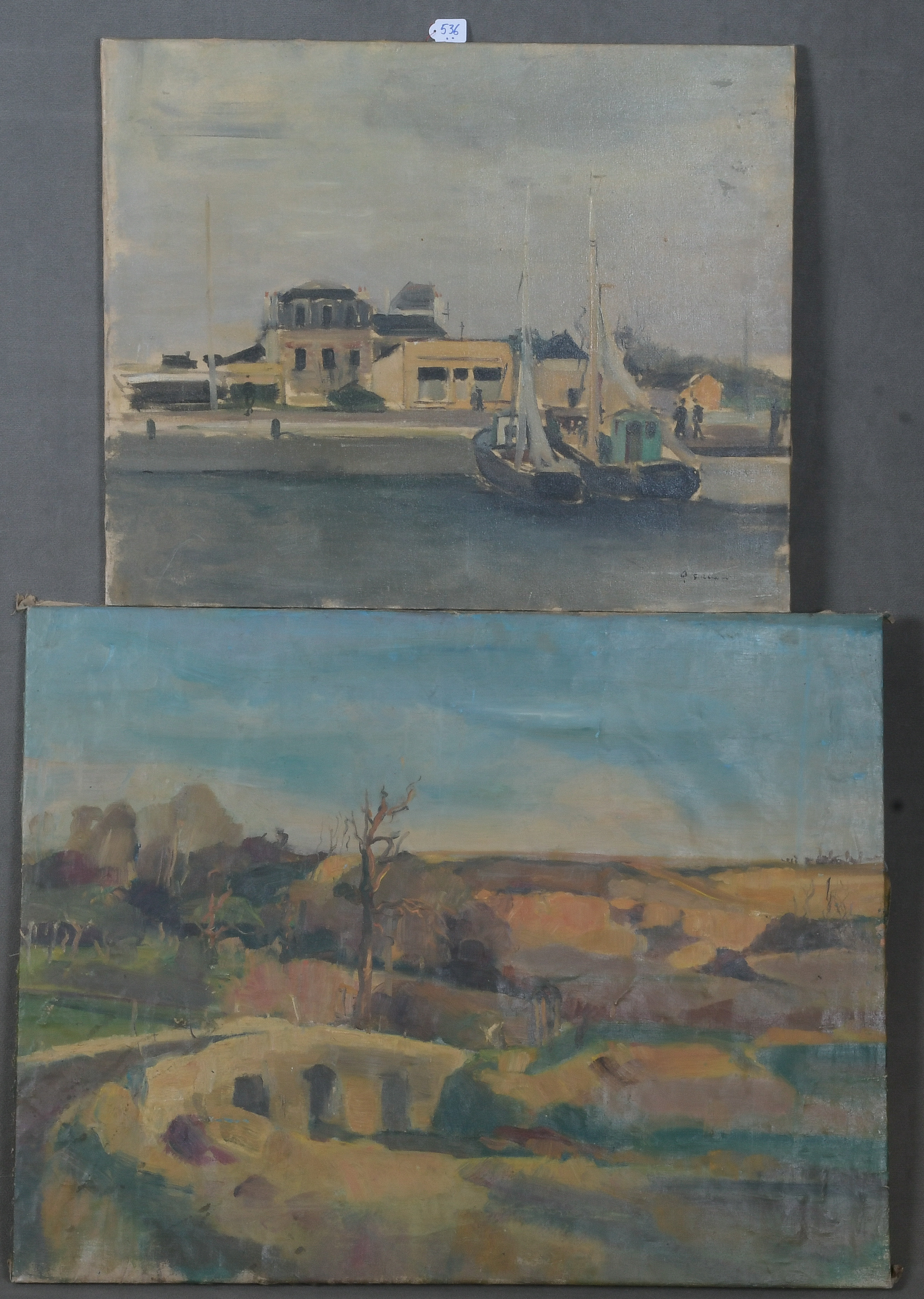 - Katalog-Nr: 536Gaston Sébire (1920-2001). Hügelige Landschaft mit Brücke und Fluss und Hafen mit Segelbooten. Zwei Öl/Lw., eines re./u./sign., 59,5 x 72 / 70 x 91 cm.o.L.