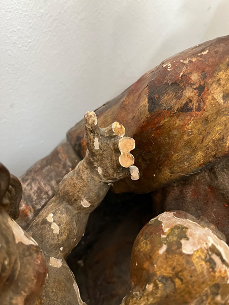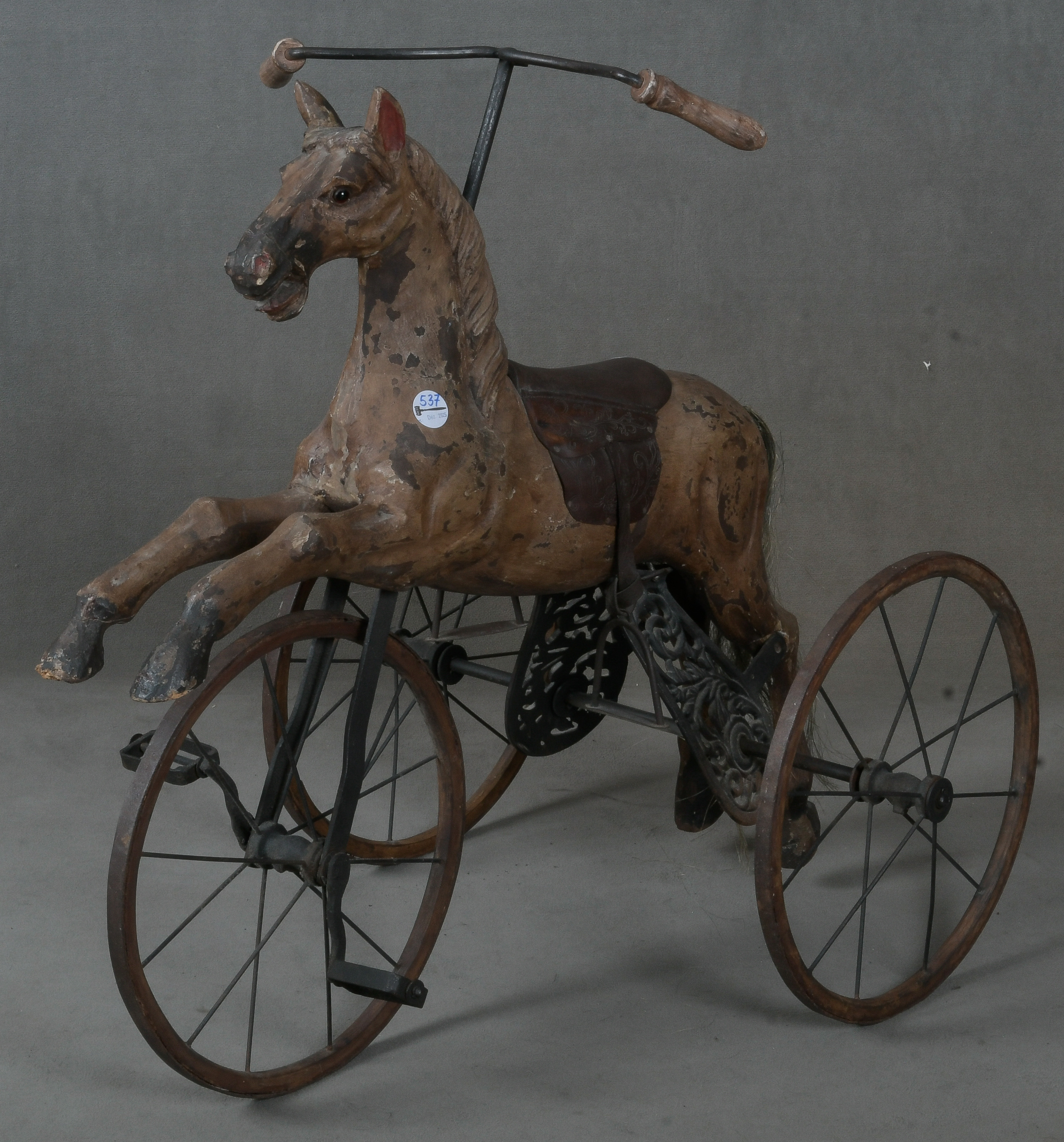 - Katalog-Nr: 537Dreirad-Pferd. Wohl deutsch 20. Jh. Schmiedeeisernes Gestell / Massivholz, geschnitzt, auf Kreidegrund gefasst, H=84 cm, B=85 cm, T=63 cm. (rest.)o.L.