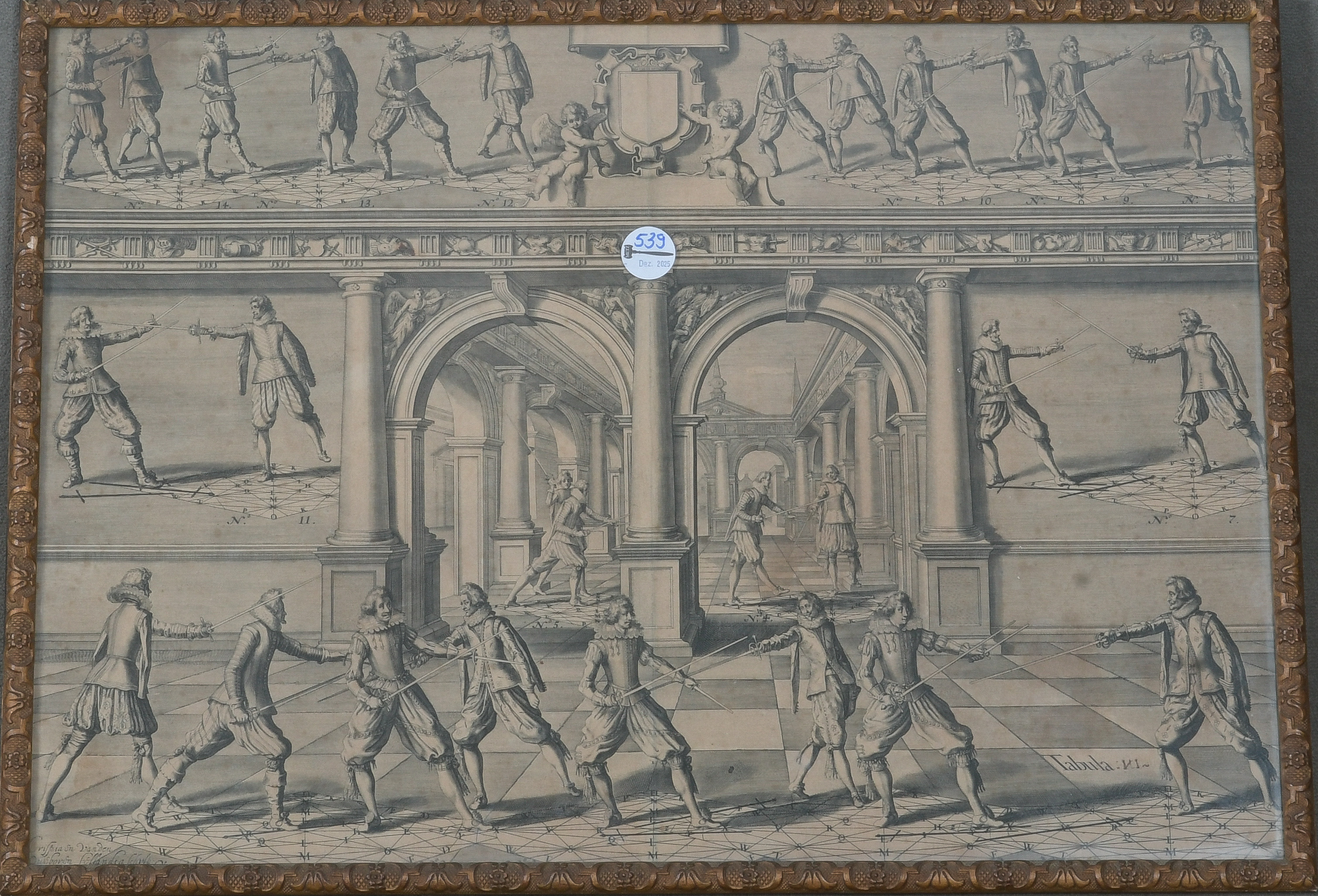 - Katalog-Nr: 539Crispiaen van den Broeck (ca. 1524/30-1590/91). Fechtunterricht. Kupferstich, li./u./sign., hi./Gl. gerahmt, 49 x 70,5 cm.o.L.