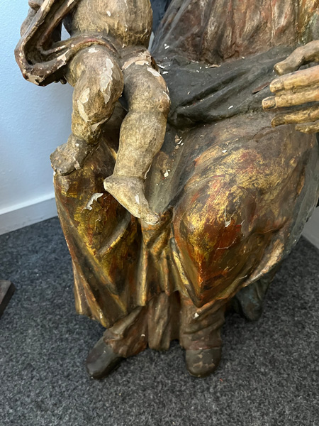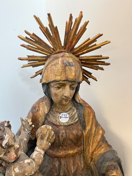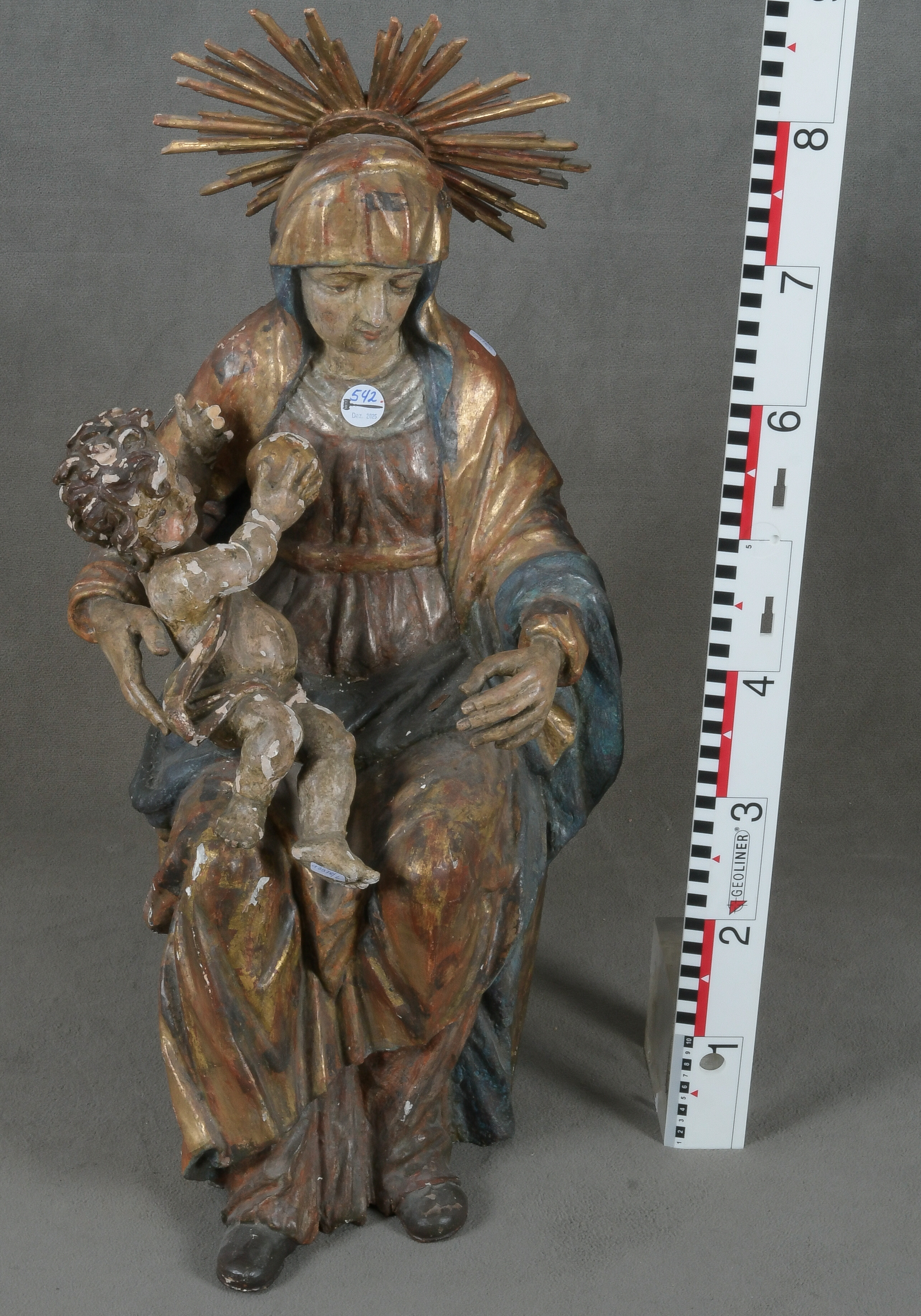 - Katalog-Nr: 542Strahlenkranzmadonna. Deutsch 18./19. Jh. Massivholz, geschnitzt, auf Kreidegrund gefasst mit Resten alter Vergoldung, H=87 cm. (besch.)o.L.