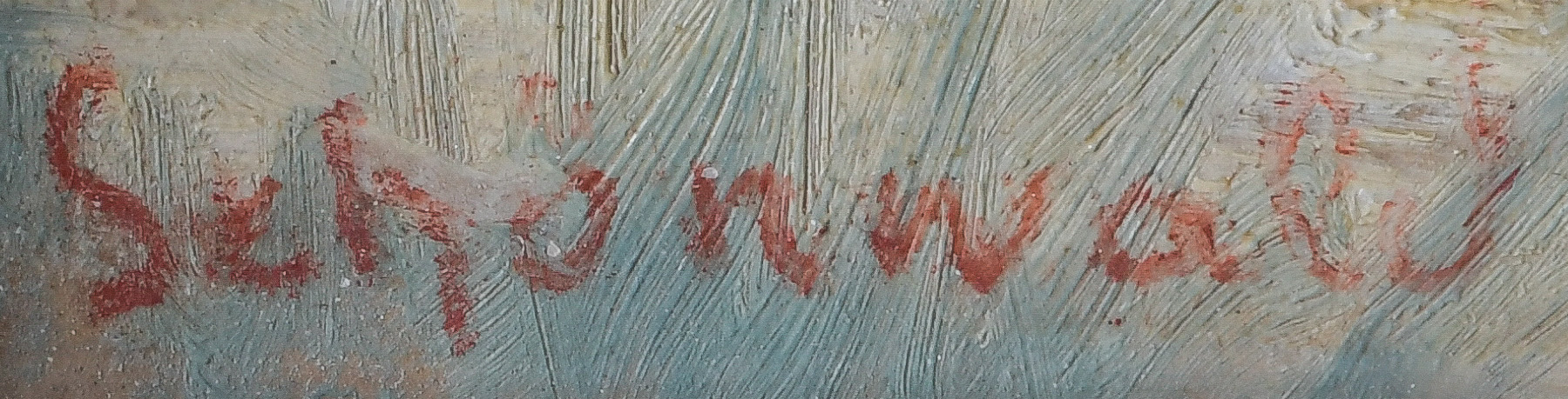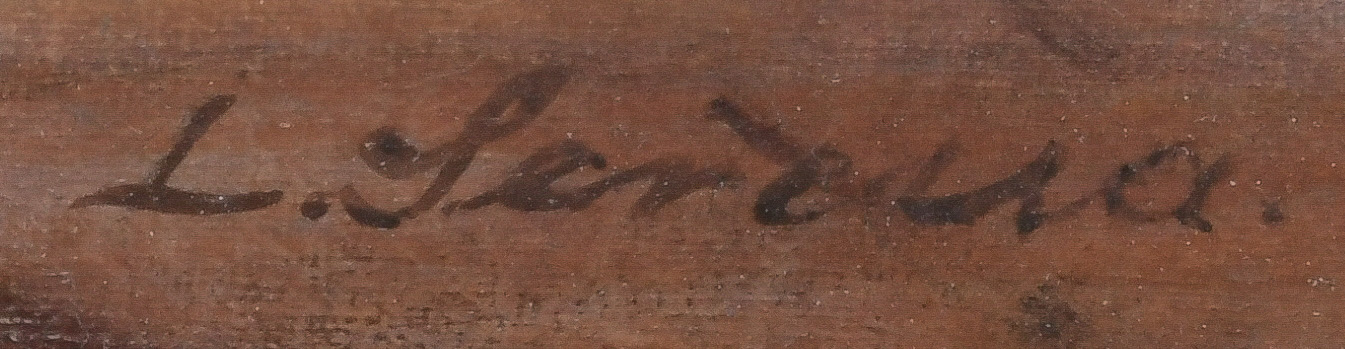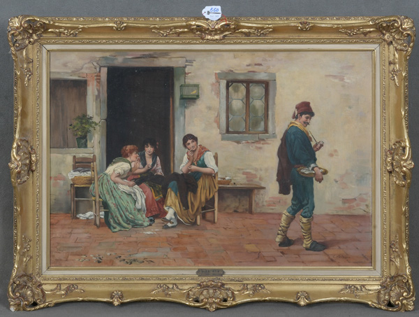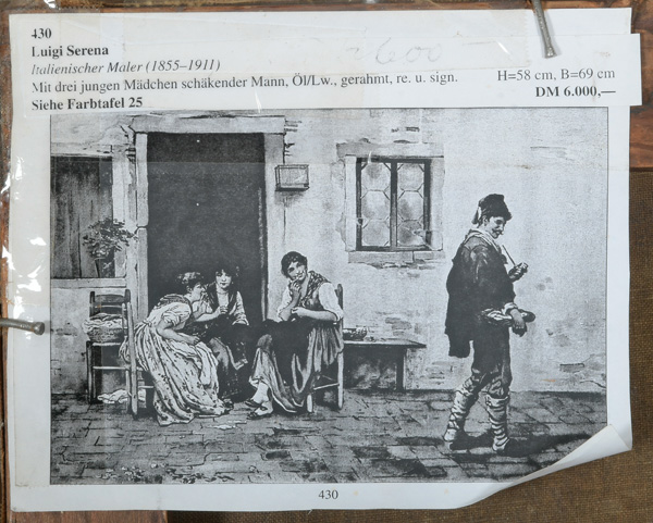 - Katalog-Nr: 550Luigi Serena (1855-1911). Drei tuschelnde Mädchen mit schäkerndem Mann. Öl/Lw., re./u./sign., gerahmt, 47 x 69 cm.o.L.
