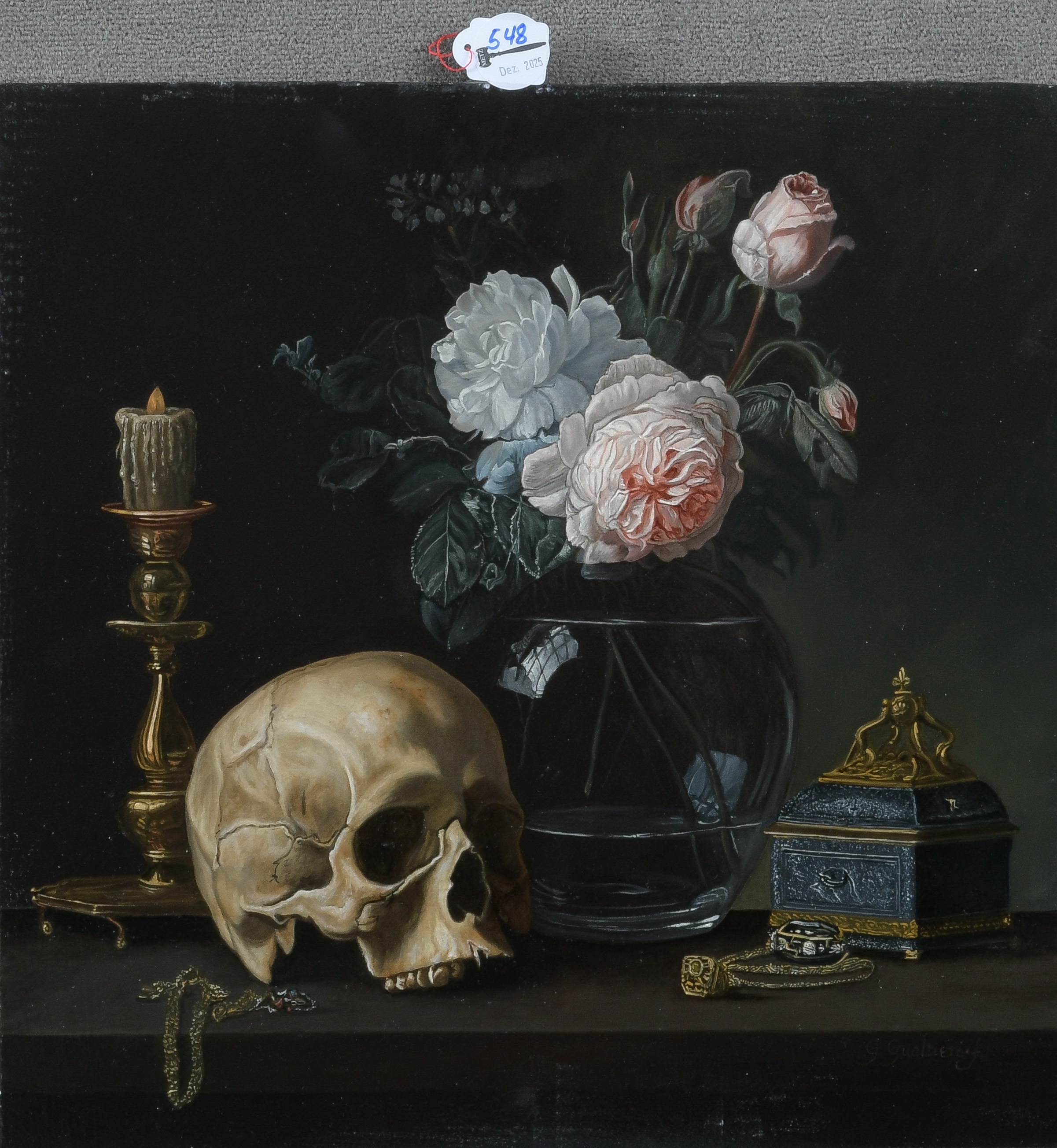- Katalog-Nr: 548Gianrico Gualtieri (*1962). Momento Mori. Öl/Holz, re./u./sign., 43 x 43,5 cm.o.L.