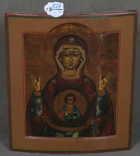 - Katalog-Nr: 527Ikone mit der Muttergottes. Russland 19. Jh. Holztafel mit Temperamalerei, 31 x 27 cm.o.L.