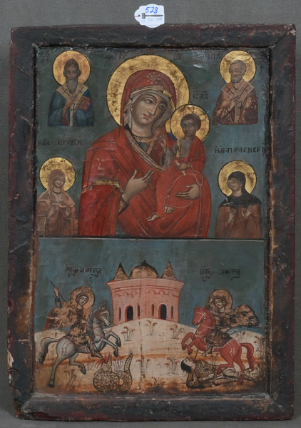 - Katalog-Nr: 528Ikone „Gottesmutter Iviron“. Russland 19. Jh. Holztafel, bunt bemalt, 52 x 37,5 cm.o.L.
