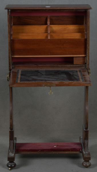 - Katalog-Nr: 546Patentmöbel. Deutsch. Mahagoni furniert, teilw. massiv, Messinggriffe; Kugelfüße mit Fußbrett, seitl. geschweifte Wangen, Schreibklappe mit dahinter liegender Facheinteilung, Schreibplatte mit schwarzem Lederbezug, überstehende Platte, H=108 cm, B=56 cm, T=36 cm.o.L.