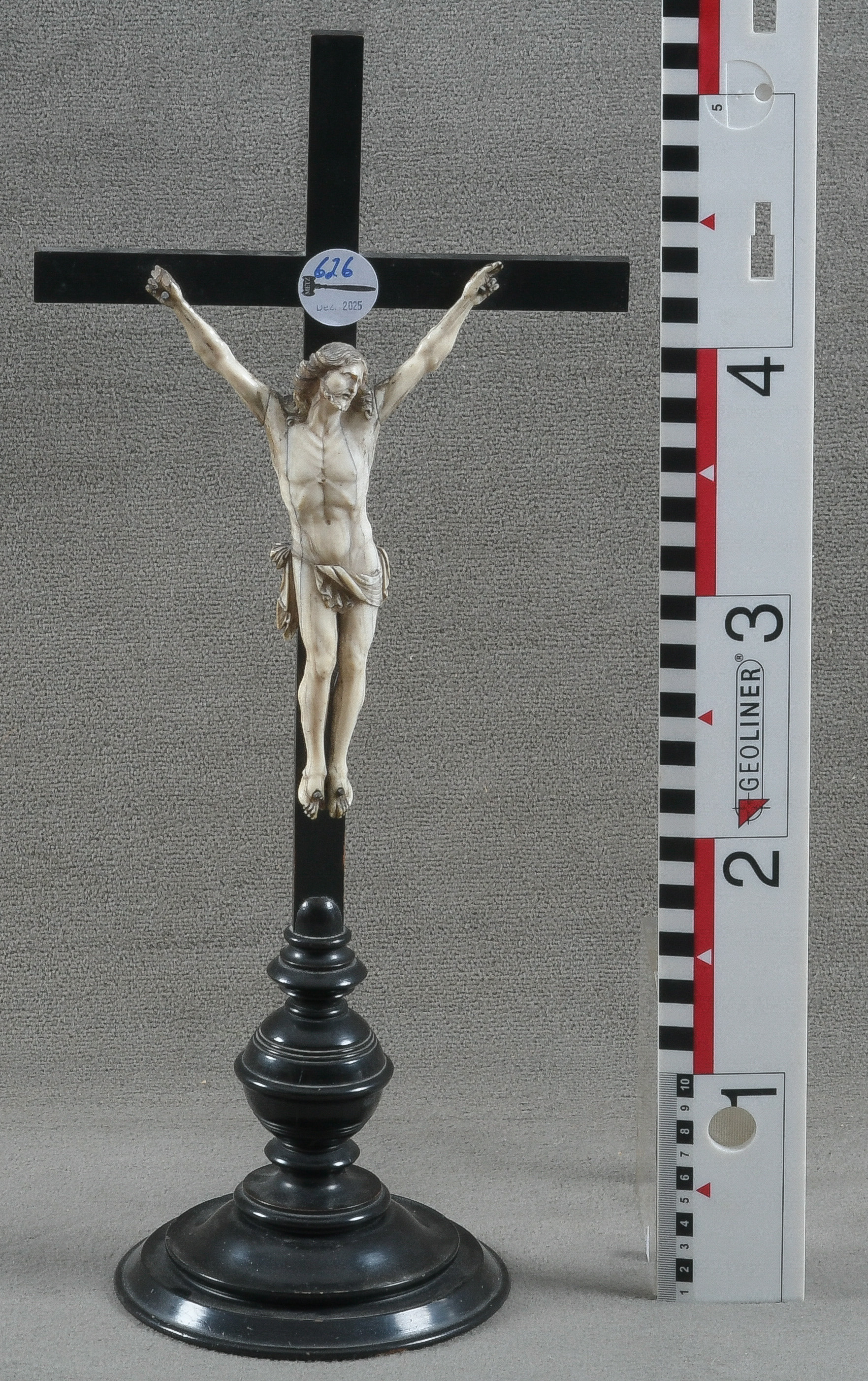 - Katalog-Nr: 626Kruzifix. Deutsch 18./19. Jh. Beinkorpus, geschnitzt, an Massivholzkreuz, gedrechselt und ebonisiert, H=53 cm.o.L.