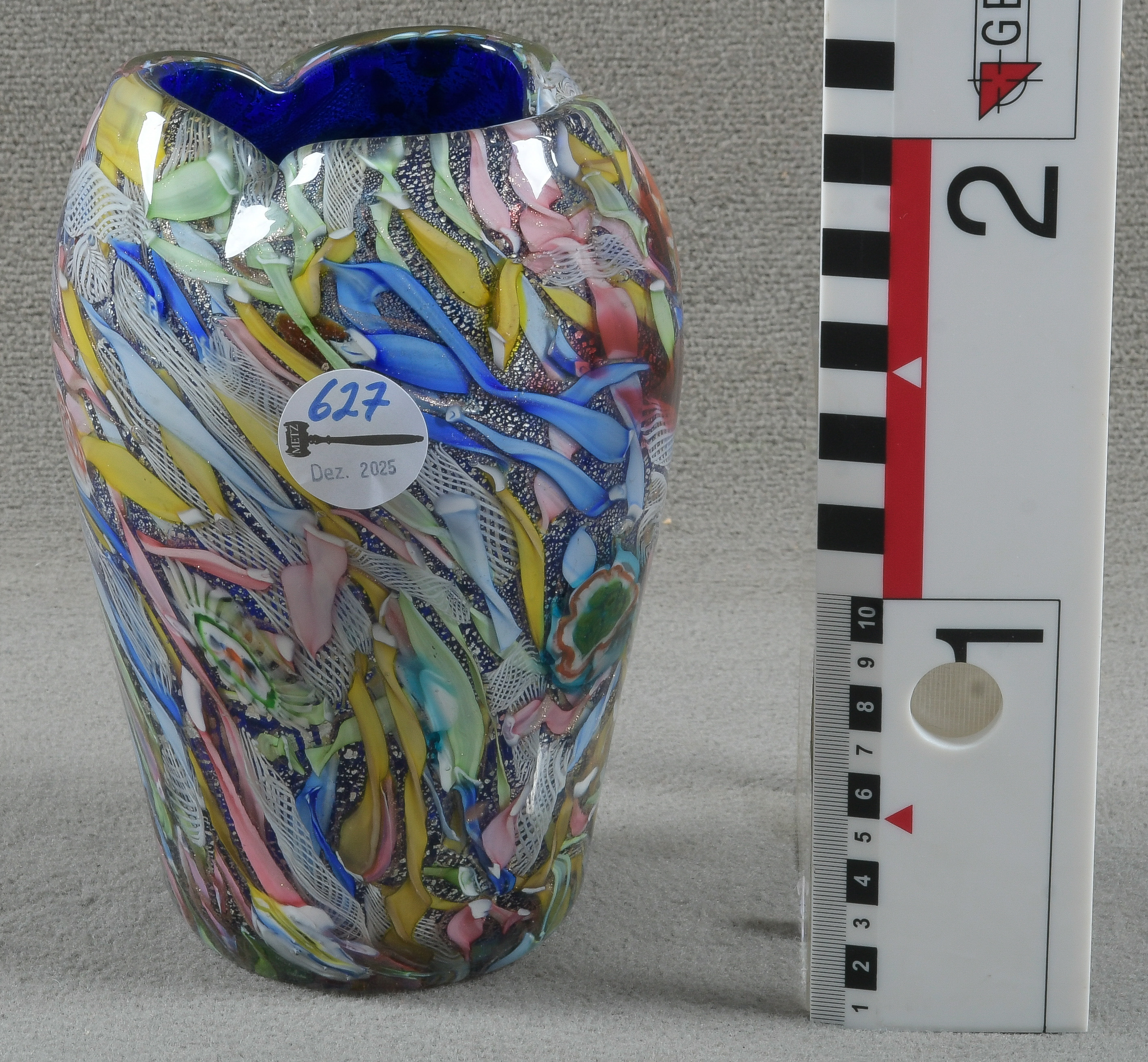 - Katalog-Nr: 627Glasvase Design „Bizantino“. Arte Vetraria Muranese 20. Jh. Dickwandiges, farbloses Glas mit bunten Einschmelzungen und kobaltblauem Innenüberfang, H=19,5 cm.o.L.