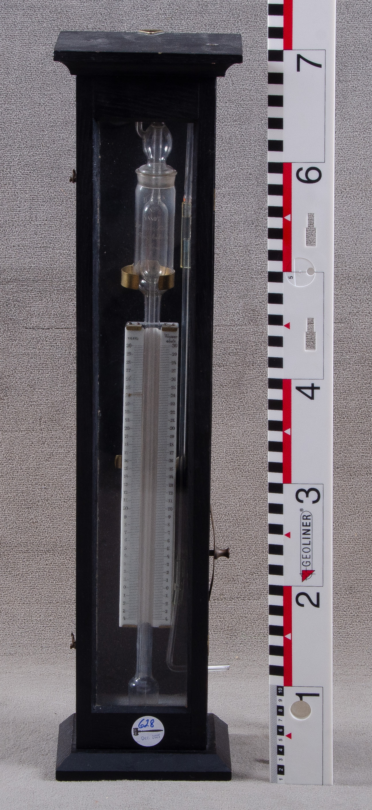 - Katalog-Nr: 628Barometer. Bonn, Franz Müller / Dr. H. Geissler Nachf. 20. Jh. Dreiseitig verglast mit profiliertem Sockel und Gesims, im Glas bez. „D.R.P. Nr. 48807“, in schwarz lackiertem Holzkasten, H=70 cm, B=17 cm, T=11,5 cm. (Funktion ungeprüft)o.L.