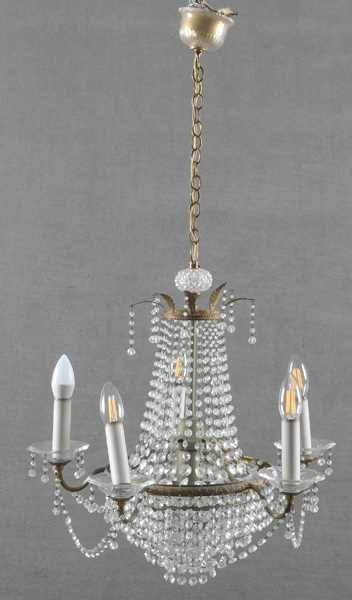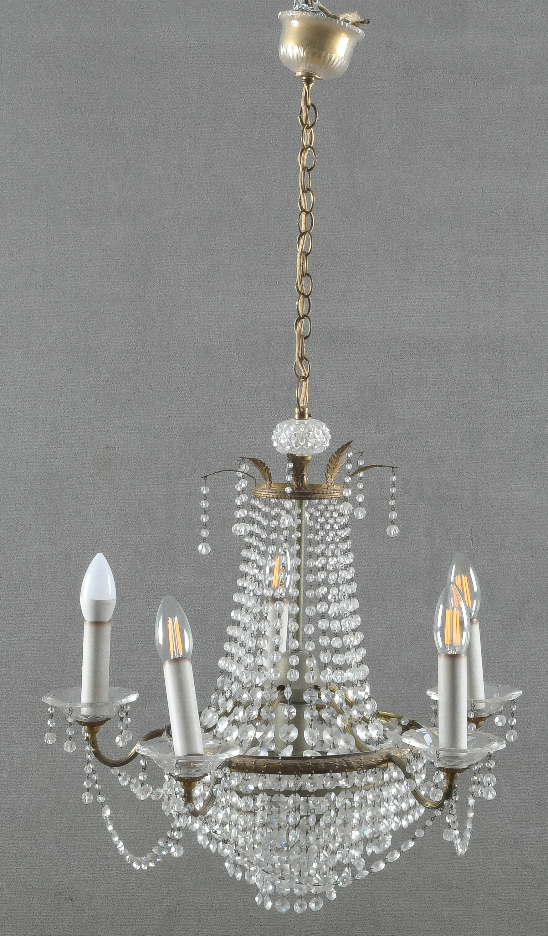 - Katalog-Nr: 632Sechsflammiger Deckenlüster im Empirestil. Italien 20. Jh. Messinggestell, mit Glasprismen, H=92 cm, D=49 cm. (Funktion ungeprüft)o.L.