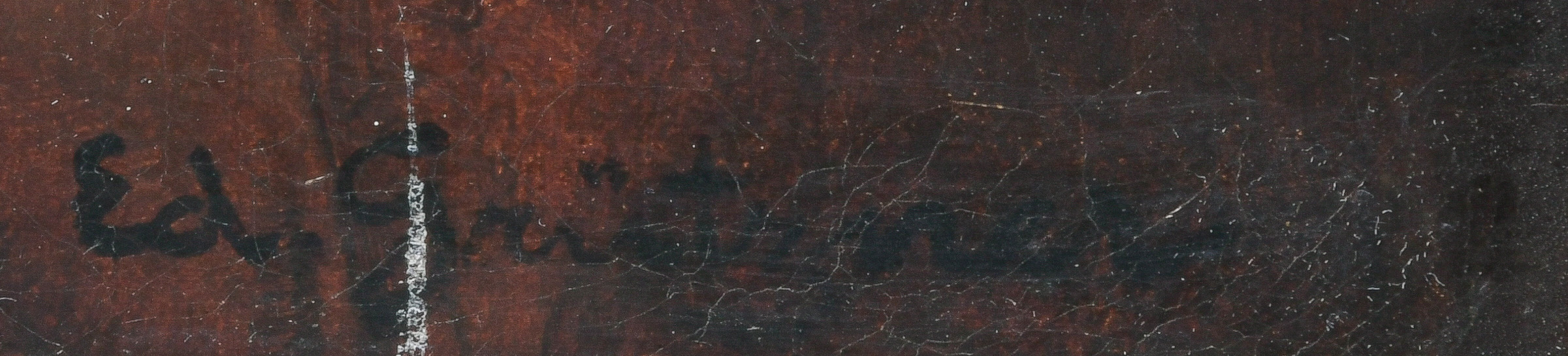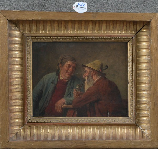 - Katalog-Nr: 634Eduard von Grützner (1846-1925) atrrib. Interieur mit zwei rauchenden Männern. Öl/Lw., re./u./sign., gerahmt, 22,5 x 28,5 cm.o.L.