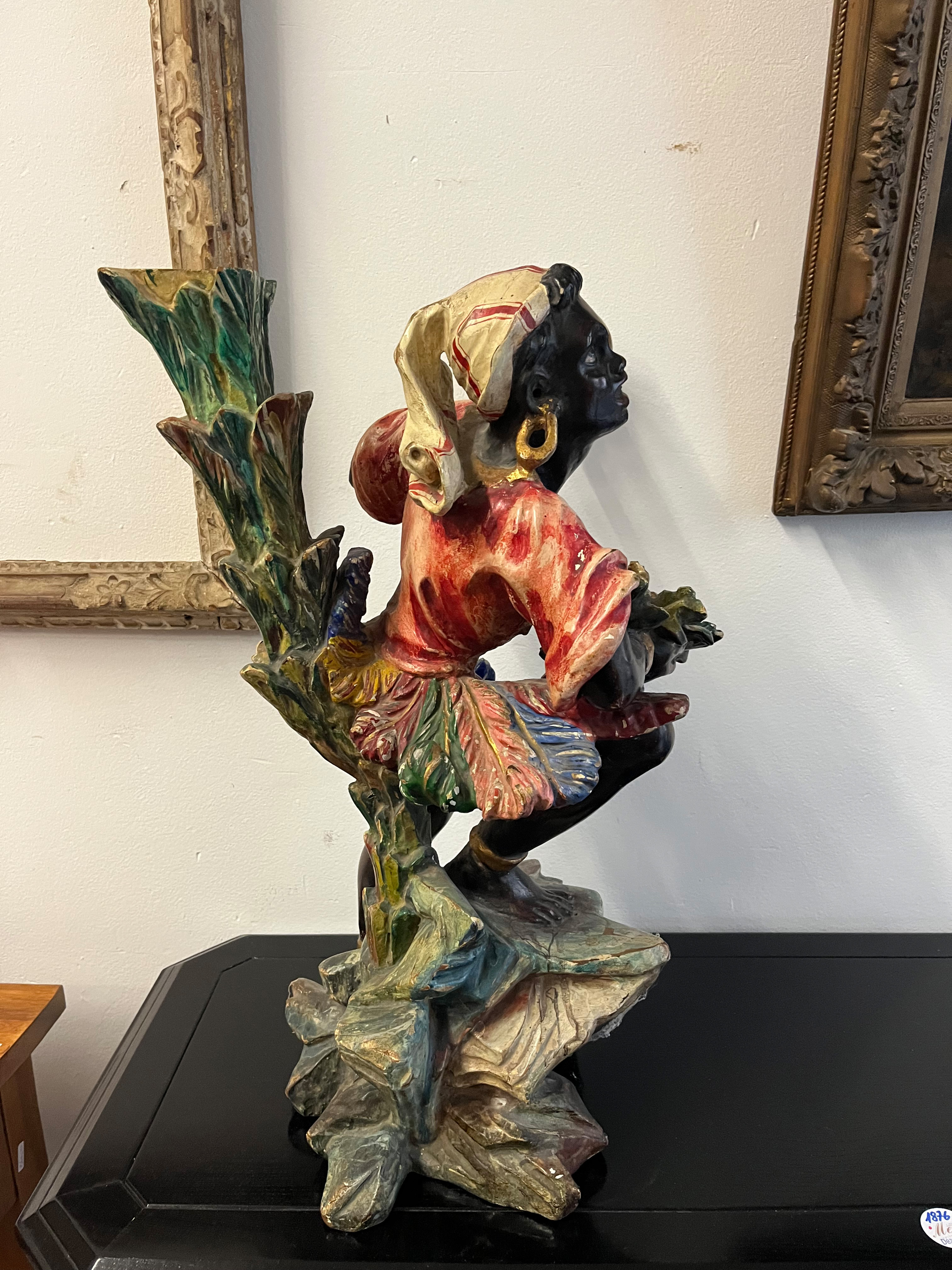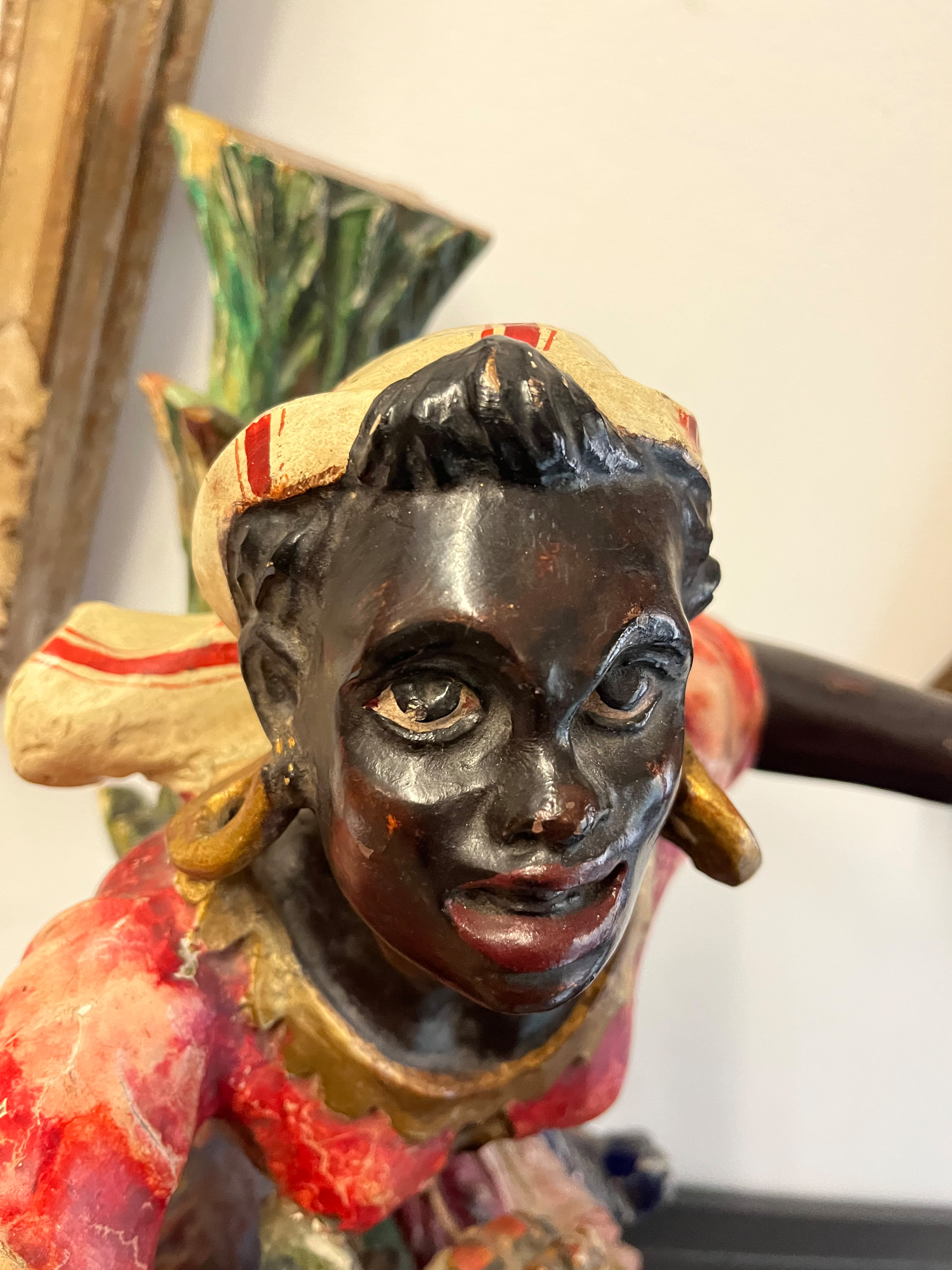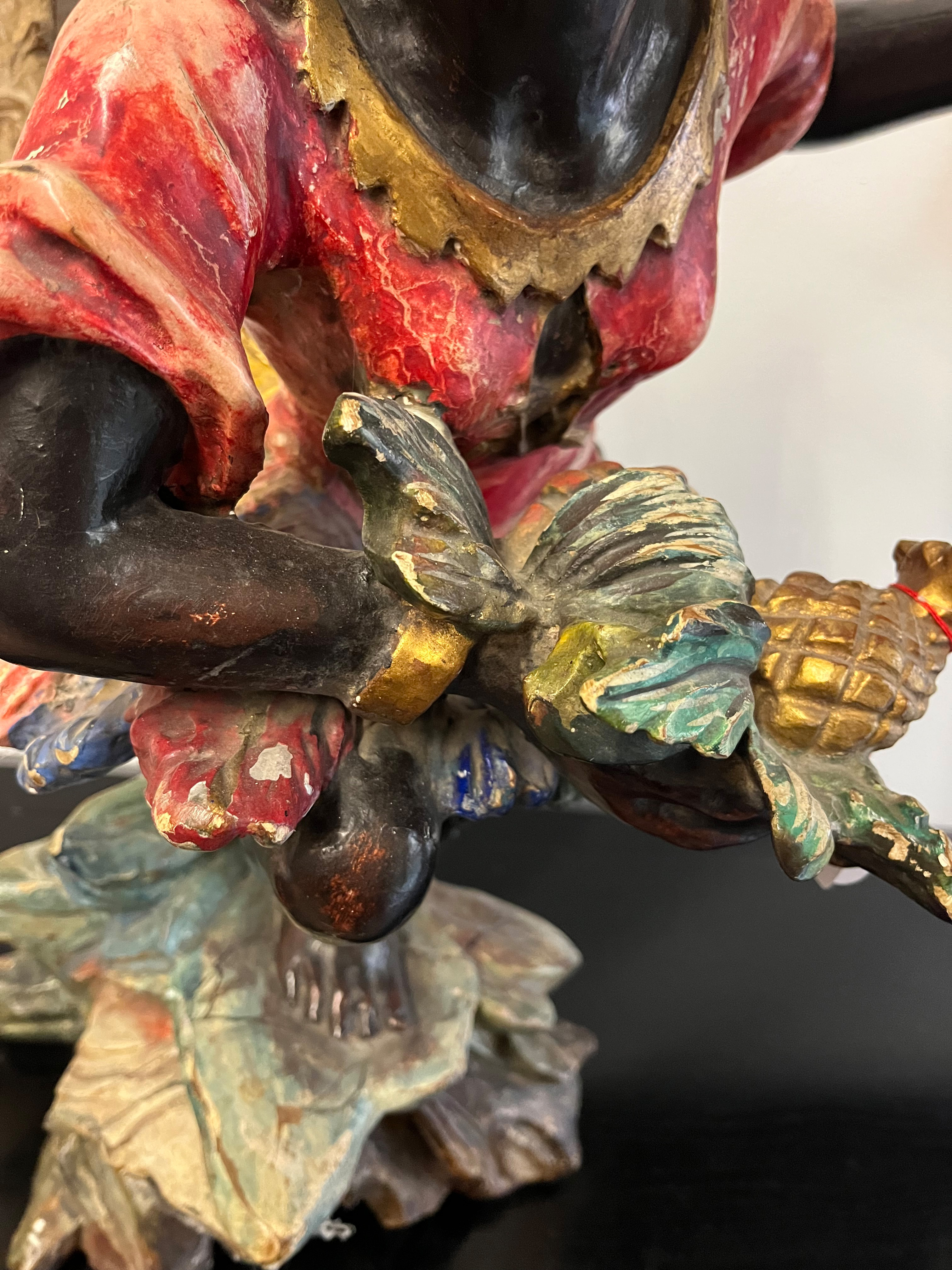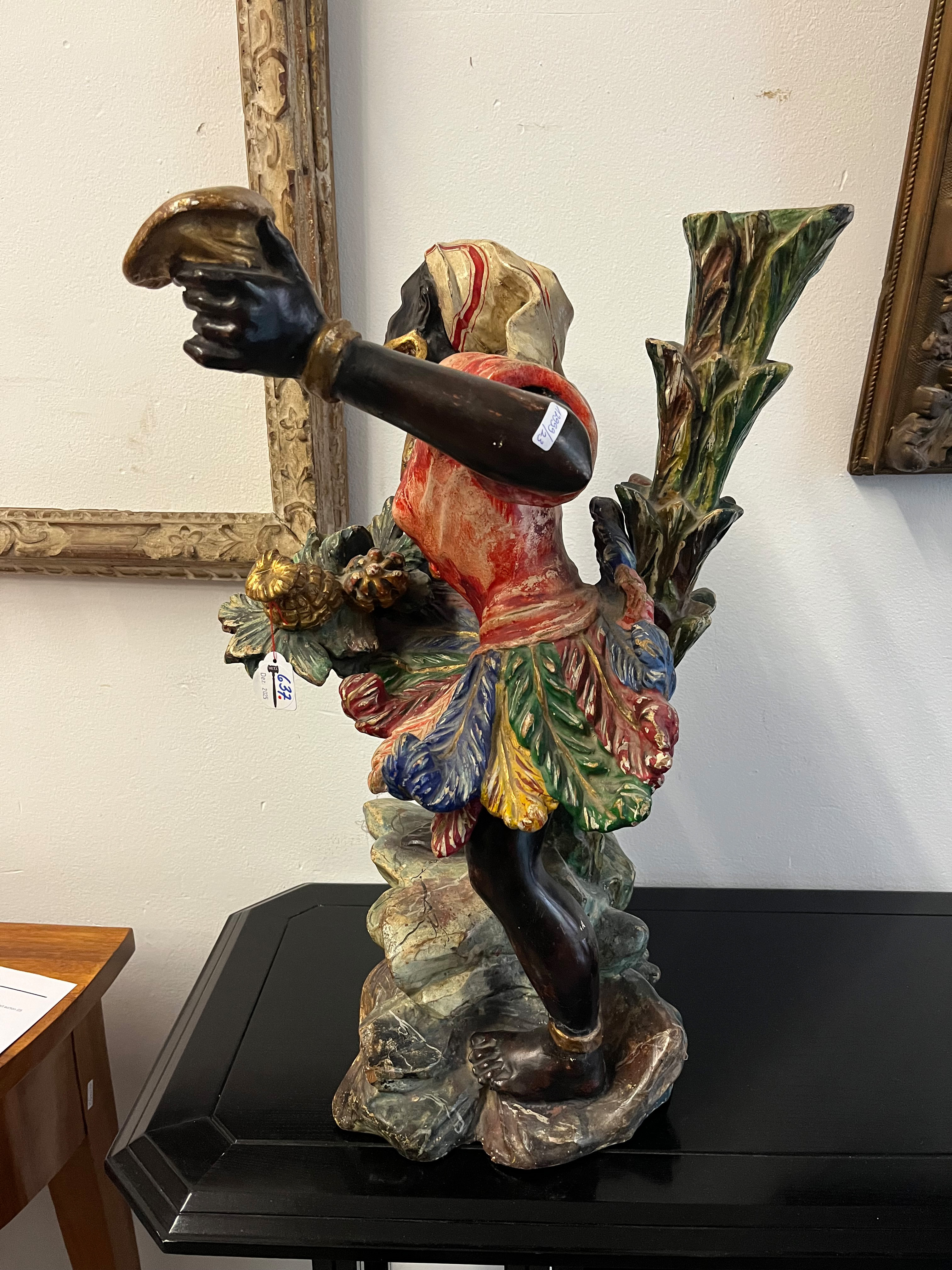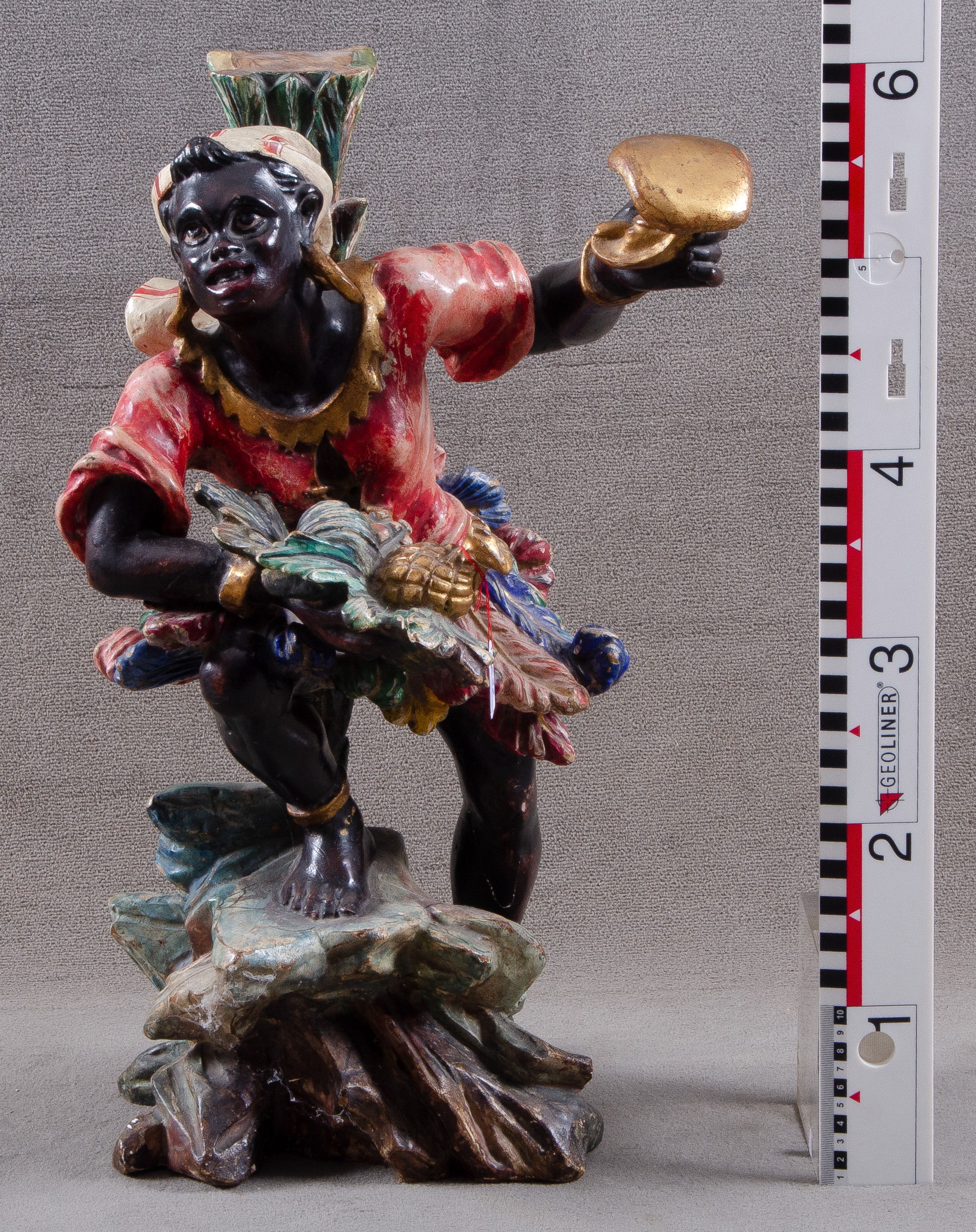 - Katalog-Nr: 637Sich auf Felssockel stützende Figur mit Ananas und Klapper. Wohl Venedig 20. Jhs. Massivholz, geschnitzt, auf Kreidegrund bunt gefasst und gold gehöht, H=56,5 cm.o.L.