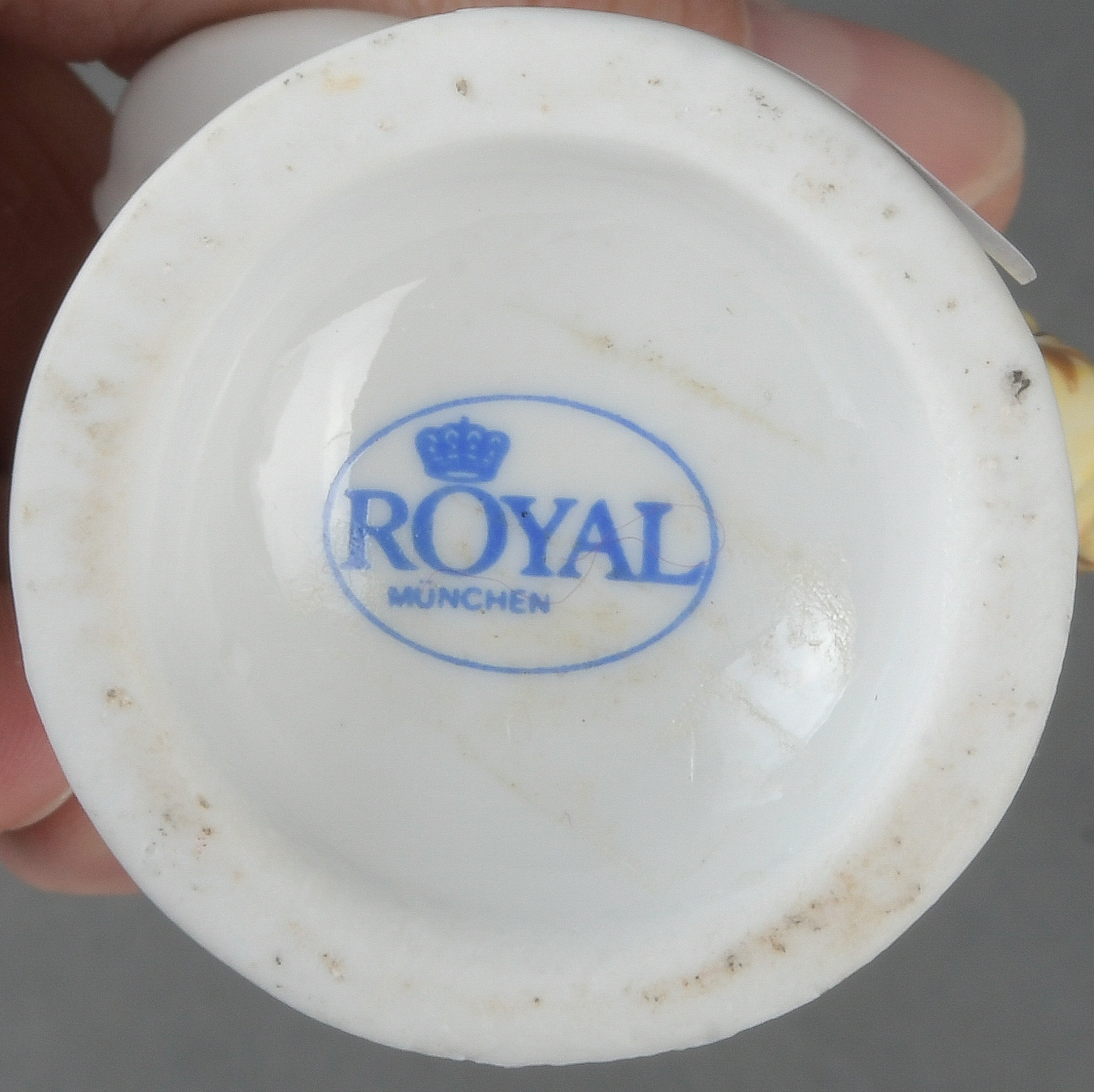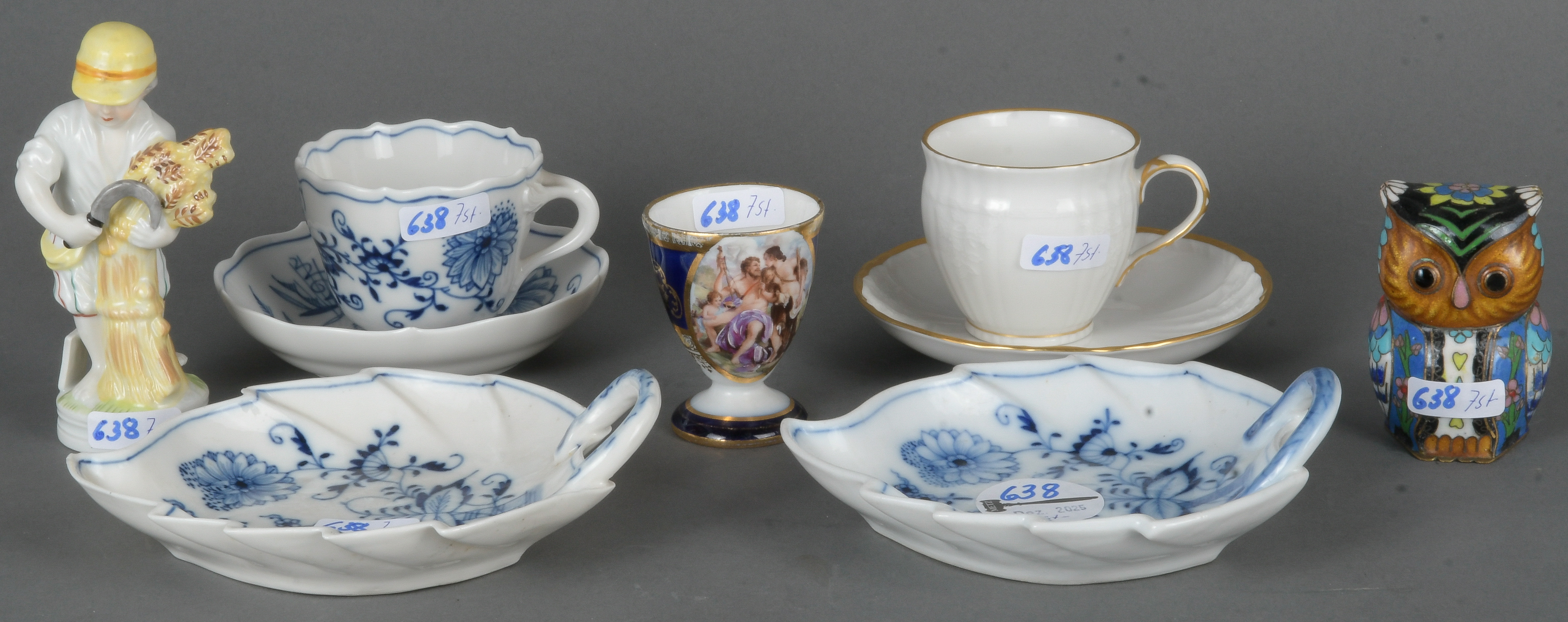- Katalog-Nr: 638Siebentlgs. Konvolut, u.a. Berlin / Stadt Meissen 20. Jh. Porzellan, bunt bemalt. Bestehend aus: Eine Figur als Allegorie des „Sommer“ (H=11,4 cm), ein Eierbecher (H=6 cm), ein Paar Blattschalen (H=je 4,5 cm, B=je 14 cm, T=je 11,5 cm), zwei Mokkatassen mit Untertassen und eine Eule (H=6,5 cm).o.L.