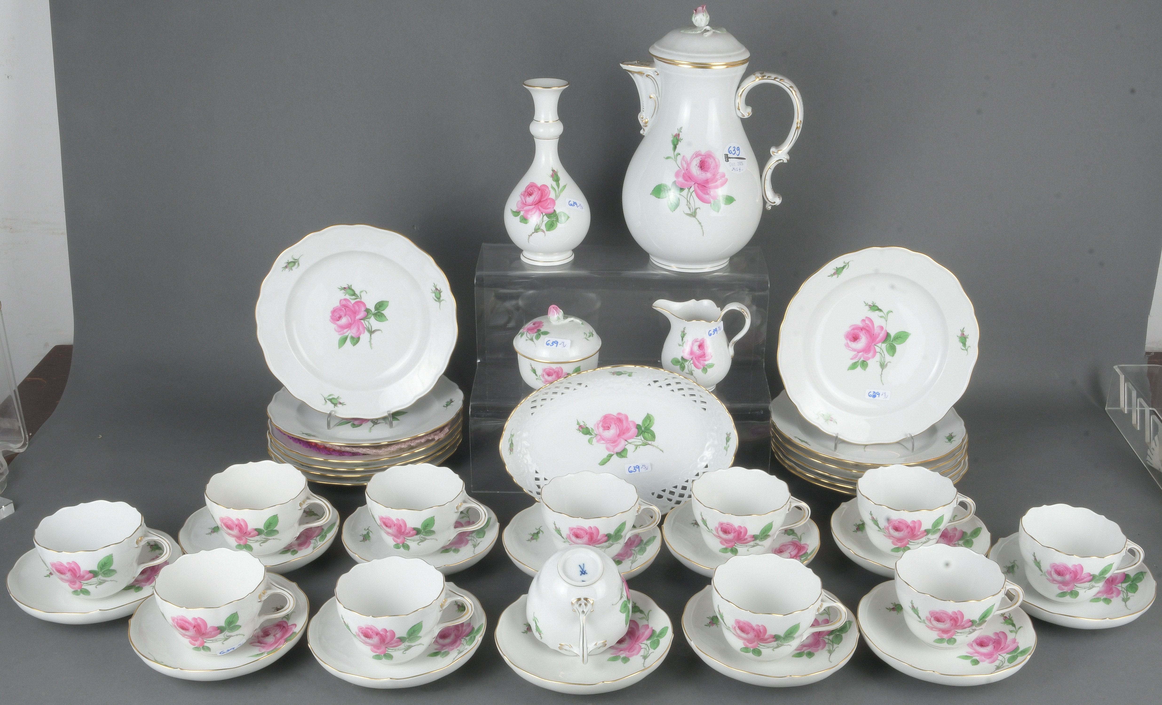 - Katalog-Nr: 63929-tlgs. Kaffeeservice „Rote Rose“. Meissen 20. Jh. Porzellan, bunt bemalt, mit Goldrand. Bestehend aus: Eine Kaffeekanne (H=28 cm), ein Milchgießer (H=9,5 cm), eine Zuckerdose (H=9 cm), zwölf Tassen mit Unterschalen, zwölf Kuchenteller (D=je 20,5 cm), eine Vase (H=17,5 cm) eine ovale Durchbruchsschale (H=4,4 cm, B=23 cm, T=15,8 cm). (min. best.)o.L.