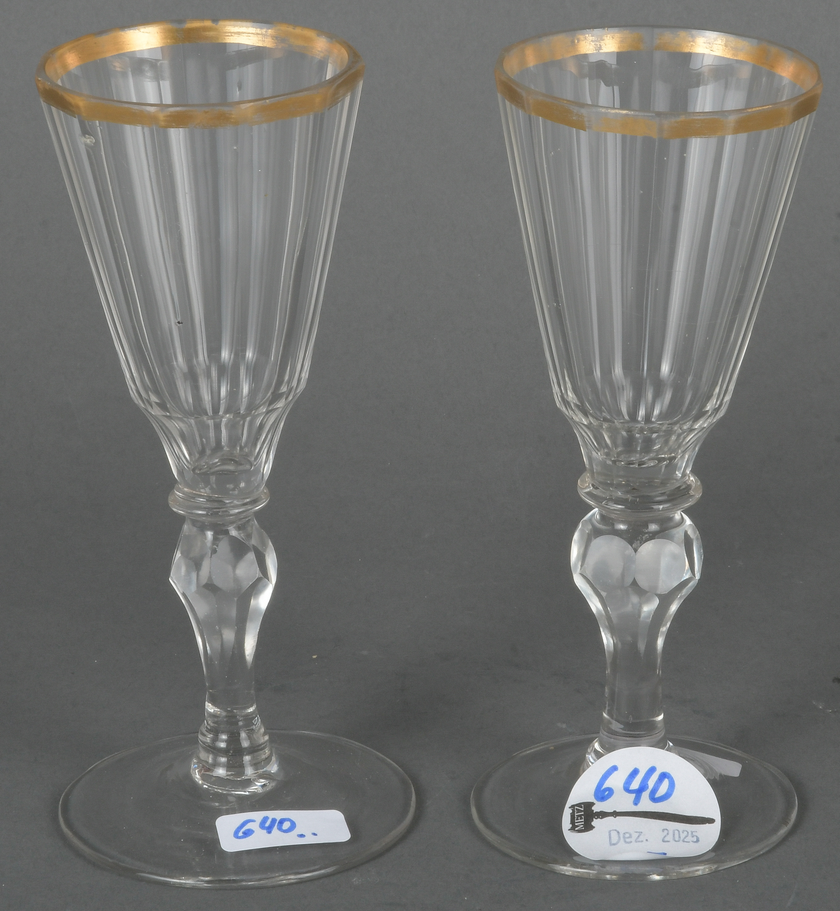 - Katalog-Nr: 640Paar Likörgläser. Schlesien 18./19. Jh. Farbloses Glas, geschliffen, mit Goldrand, H=15,4 cm.o.L.