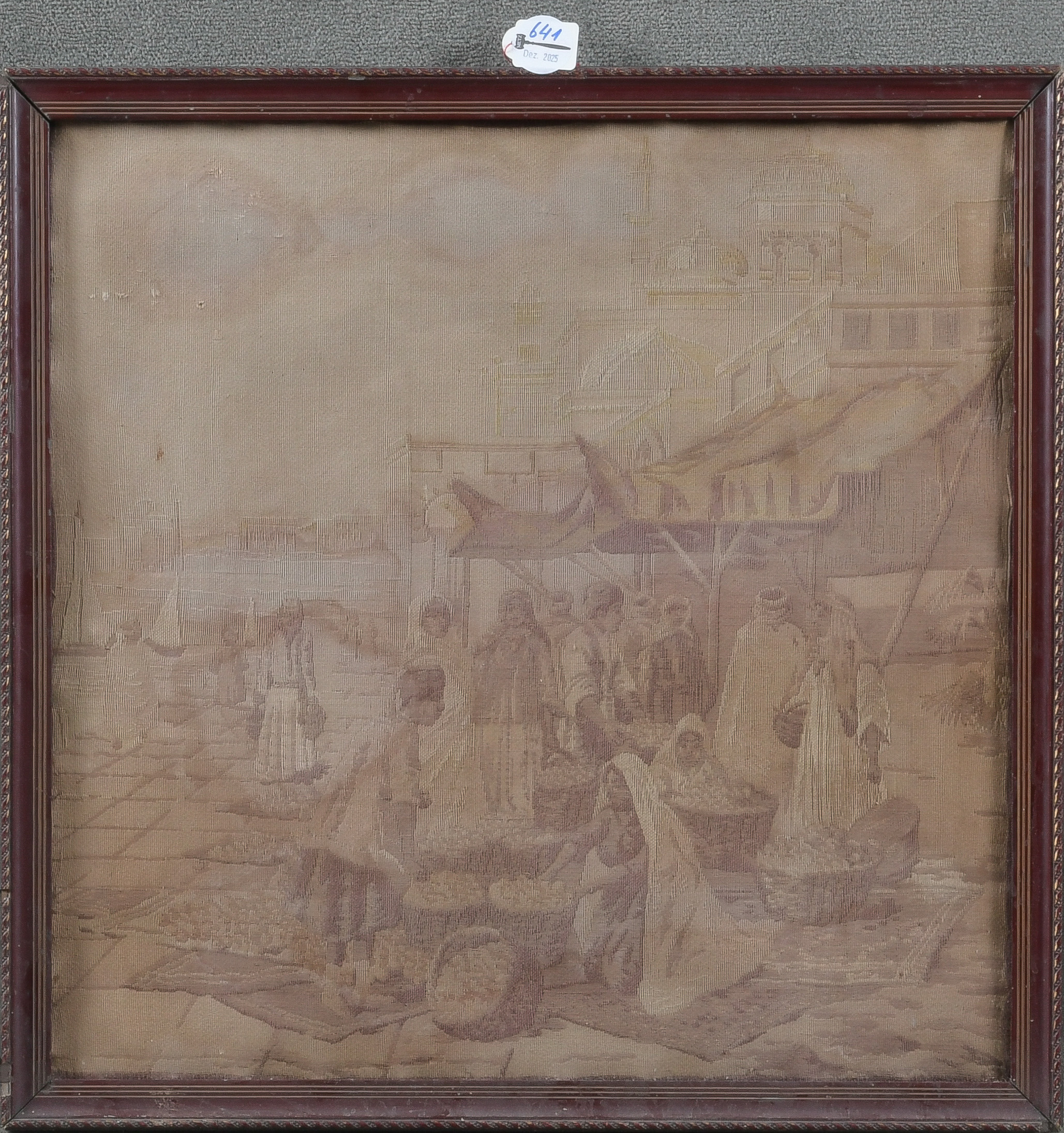 - Katalog-Nr: 641Gobelin. Wohl Frankreich um 1900. Mit arabischer Marktszene, gerahmt, 49,5 x 49 cm.o.L.
