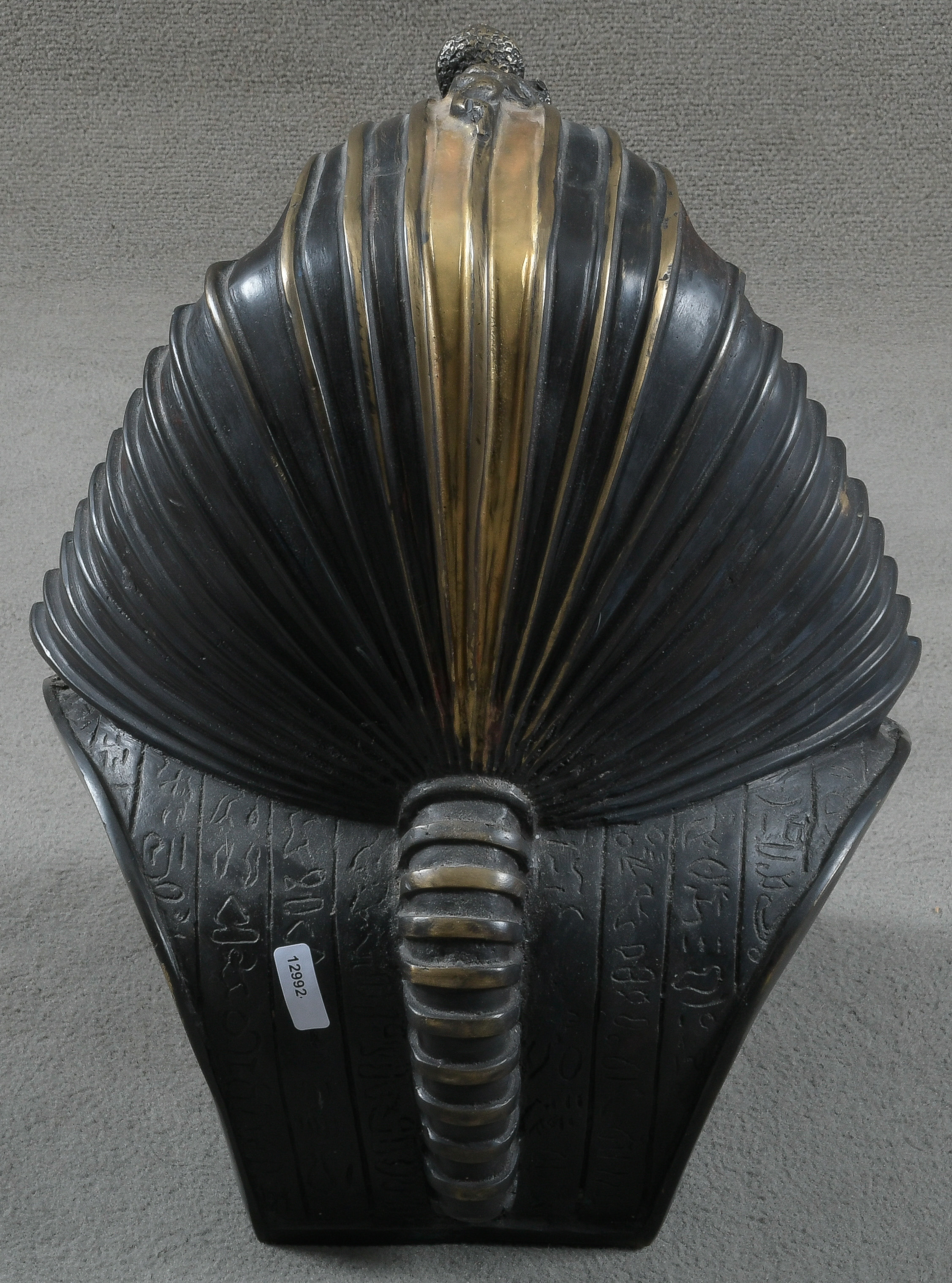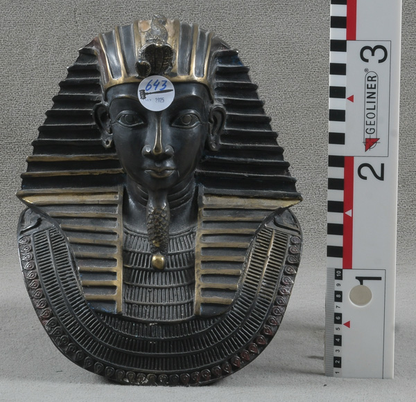 - Katalog-Nr: 643Totenmaske eines altägyptischen Pharaos. Wohl deutsch um 1900. Bronze, H=31 cm, B=25 cm, T=18 cm.o.L.