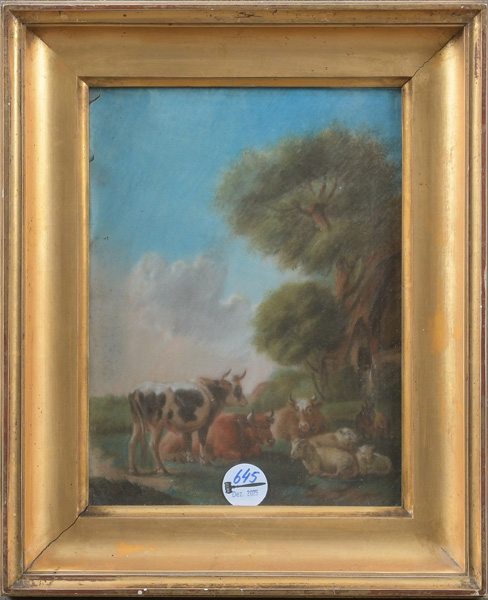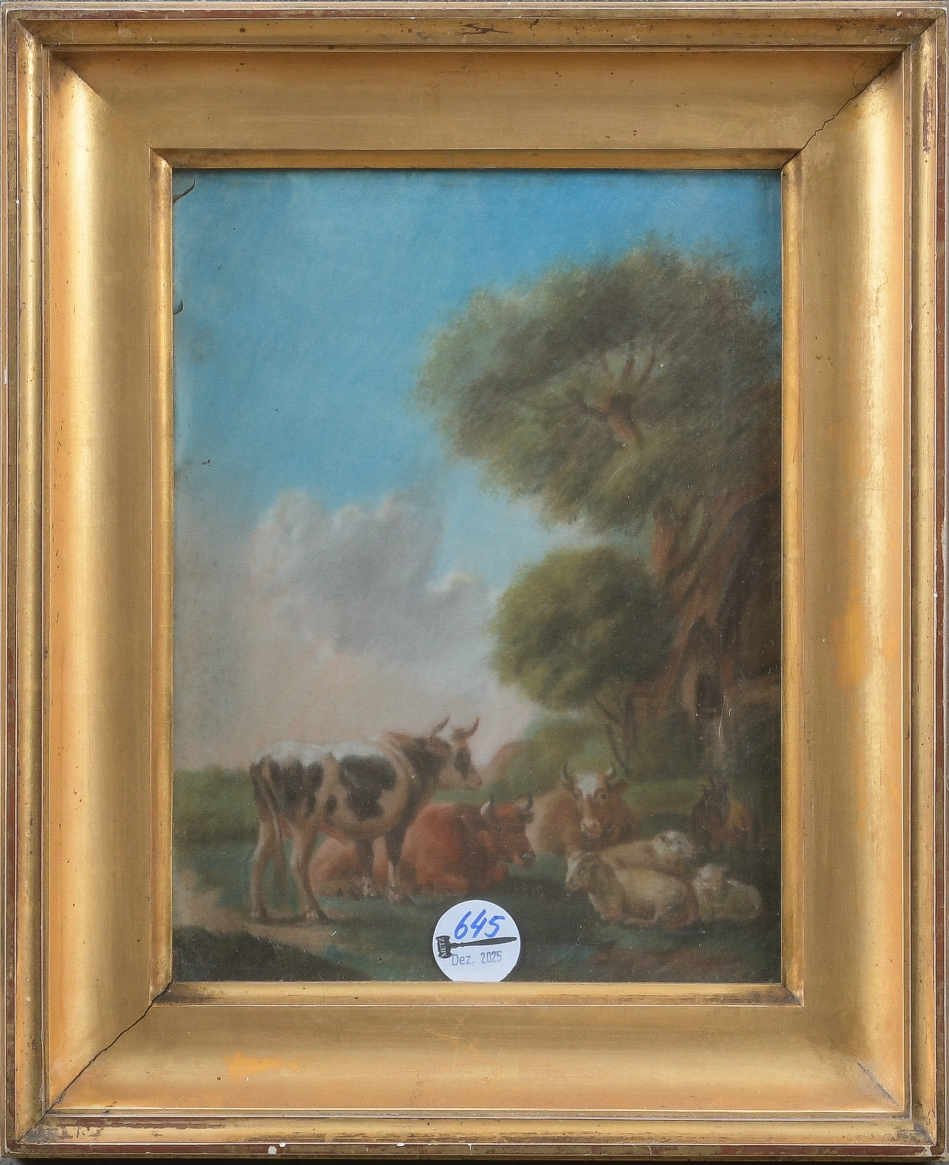 - Katalog-Nr: 645Maler des 18. Jhs. Kühe und Schafe auf der Weide. Mischtechnik, hi./Gl. gerahmt, 29 x 21,5 cm. (besch.)o.L.