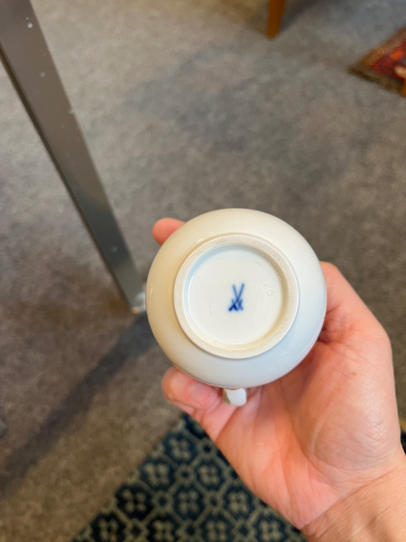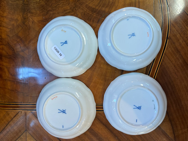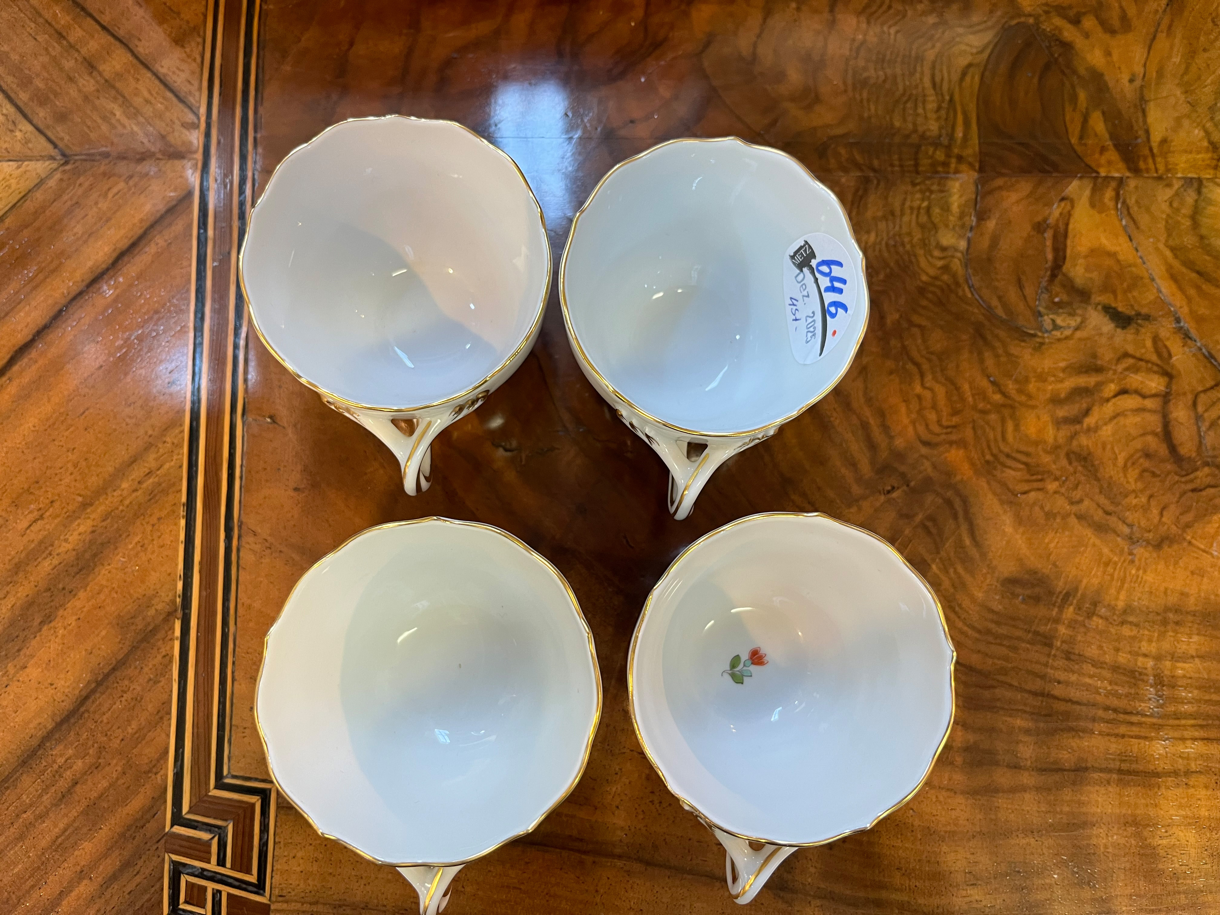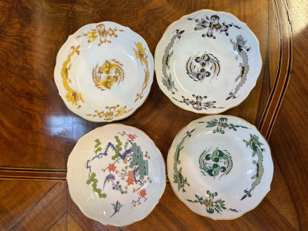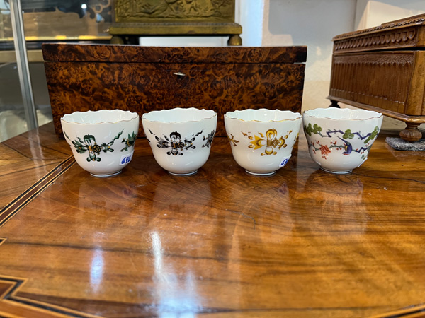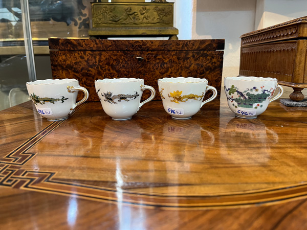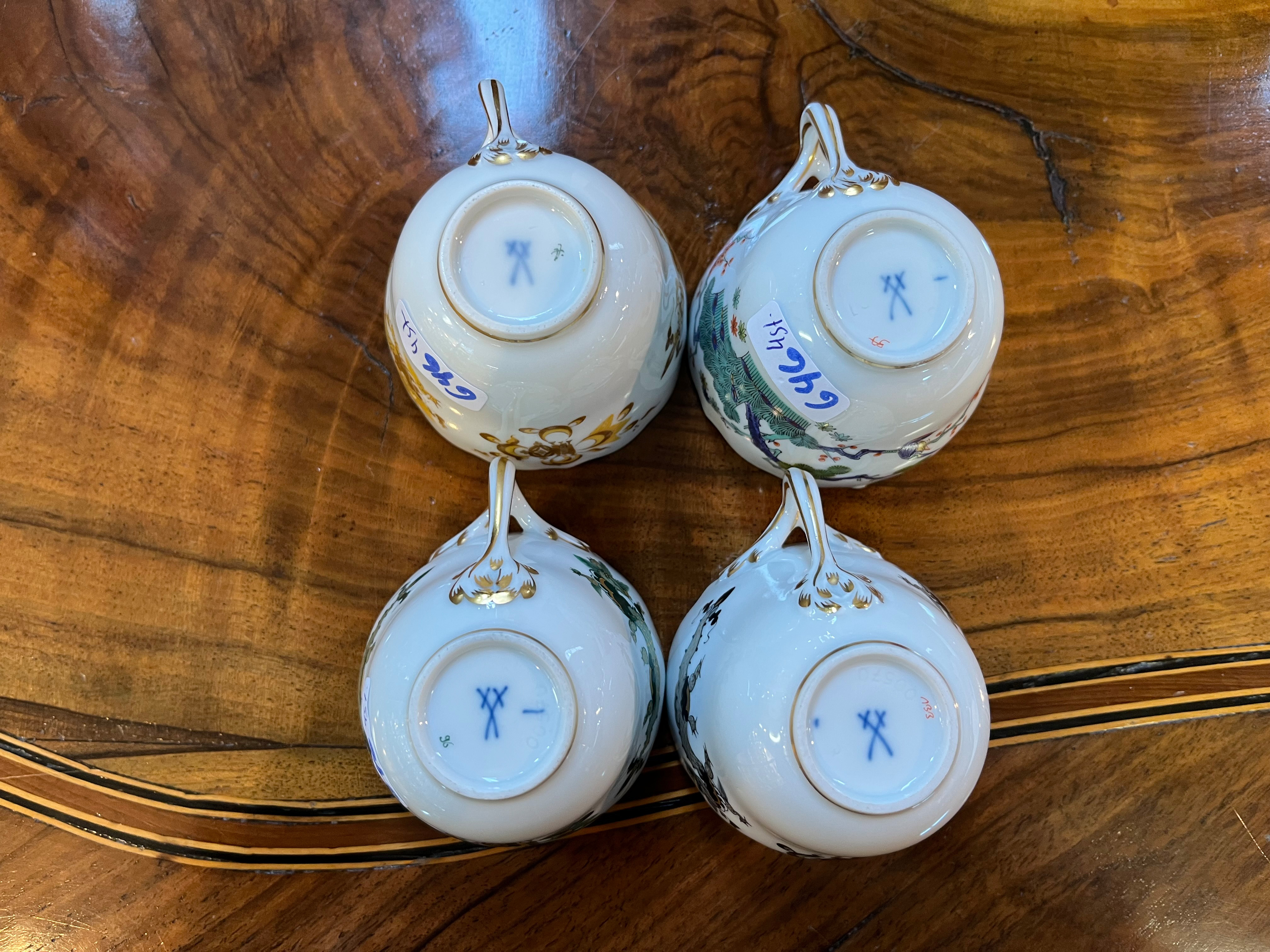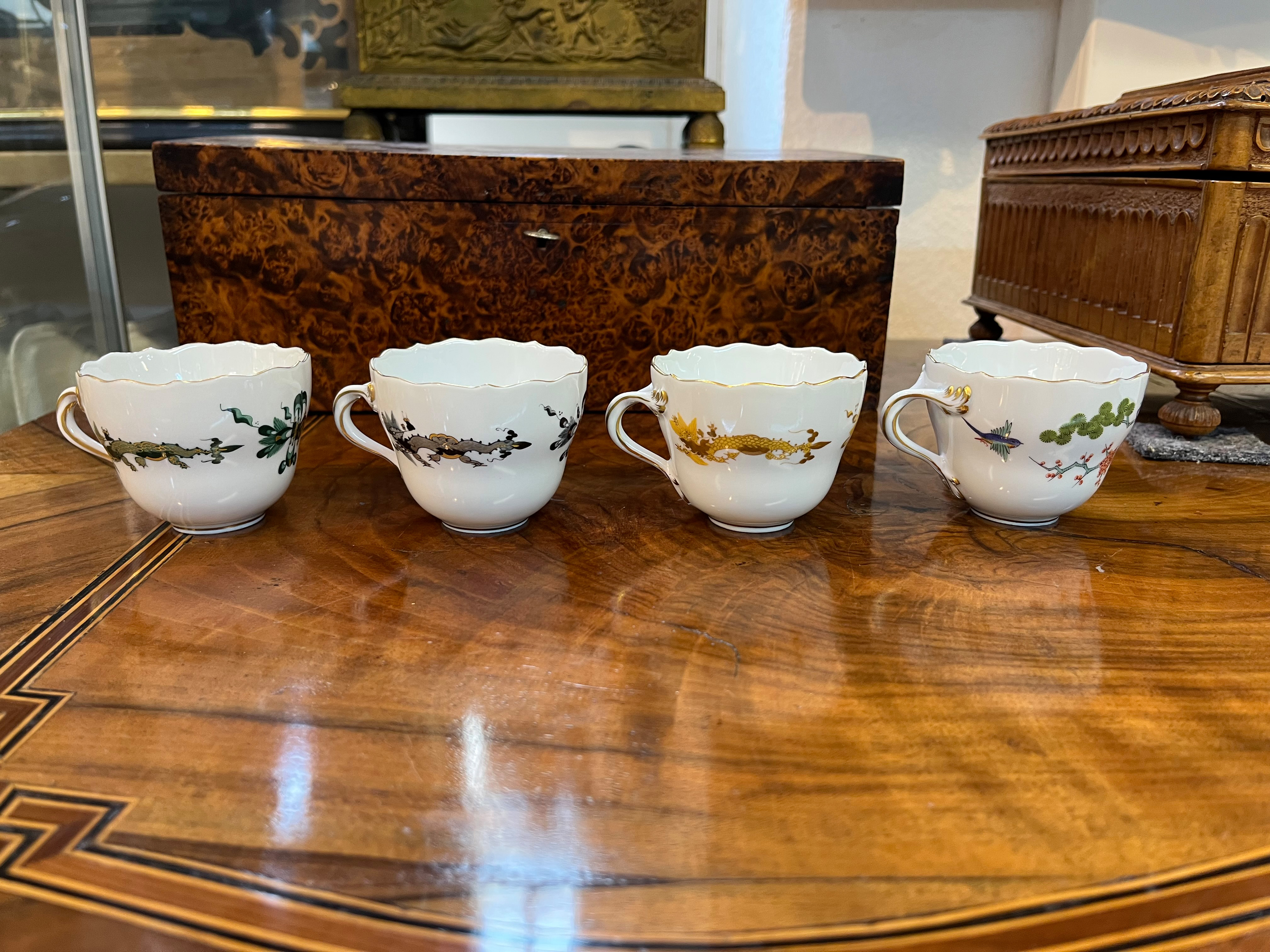 - Katalog-Nr: 646Vier Mokkatassen mit Untertassen. Meissen 20. Jh. Porzellan, unterschiedlich bunt bemalt mit Drachen- bzw. Kakiemonblütendekor; verso unterglasurblaue Schwertermarke.o.L.