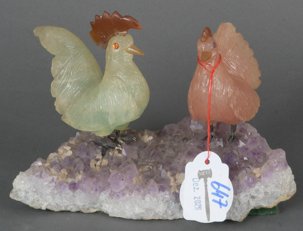 - Katalog-Nr: 647Hahn und Henne. Wohl deutsch 20. Jh. Halbedelstein geschnitten, auf Amethystsockel, H=11 cm.o.L.