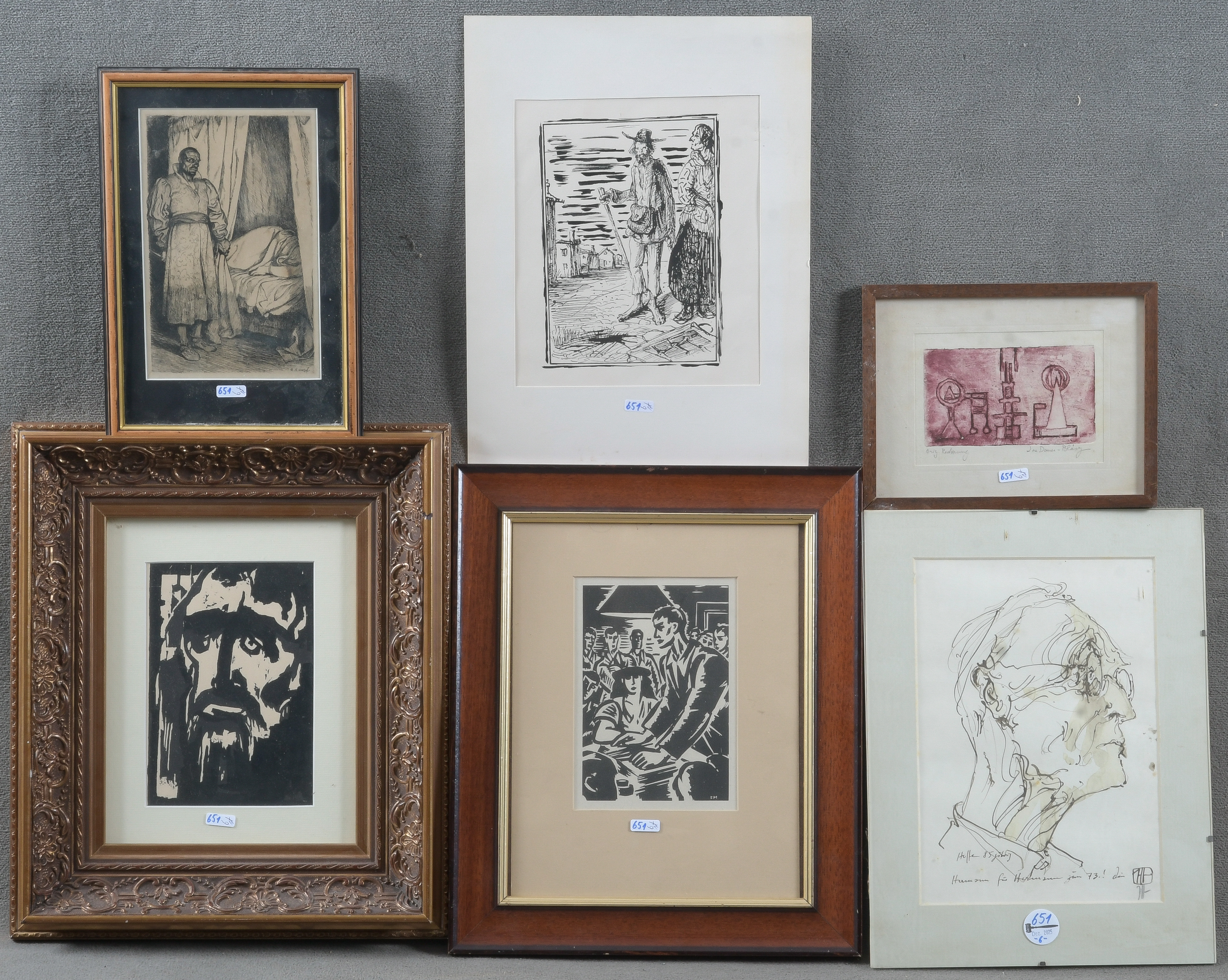 - Katalog-Nr: 651Ira Damer-Blasy (Graphikerin des 20. Jhs.) / Horst Janssen (1929-1995) / Arthur Kumpf (Graphiker des 20. Jhs.) / Alfred Kubin (1877-1959) u.a. Konvolut Holzschnitte und Radierungen mit abstrakten Kompositionen und Othello-Szene, re. bzw. li./u./sign., mit Passepartout hi./Gl. gerahmt, 8,5 x 15 bis 30 x 21 cm.o.L.