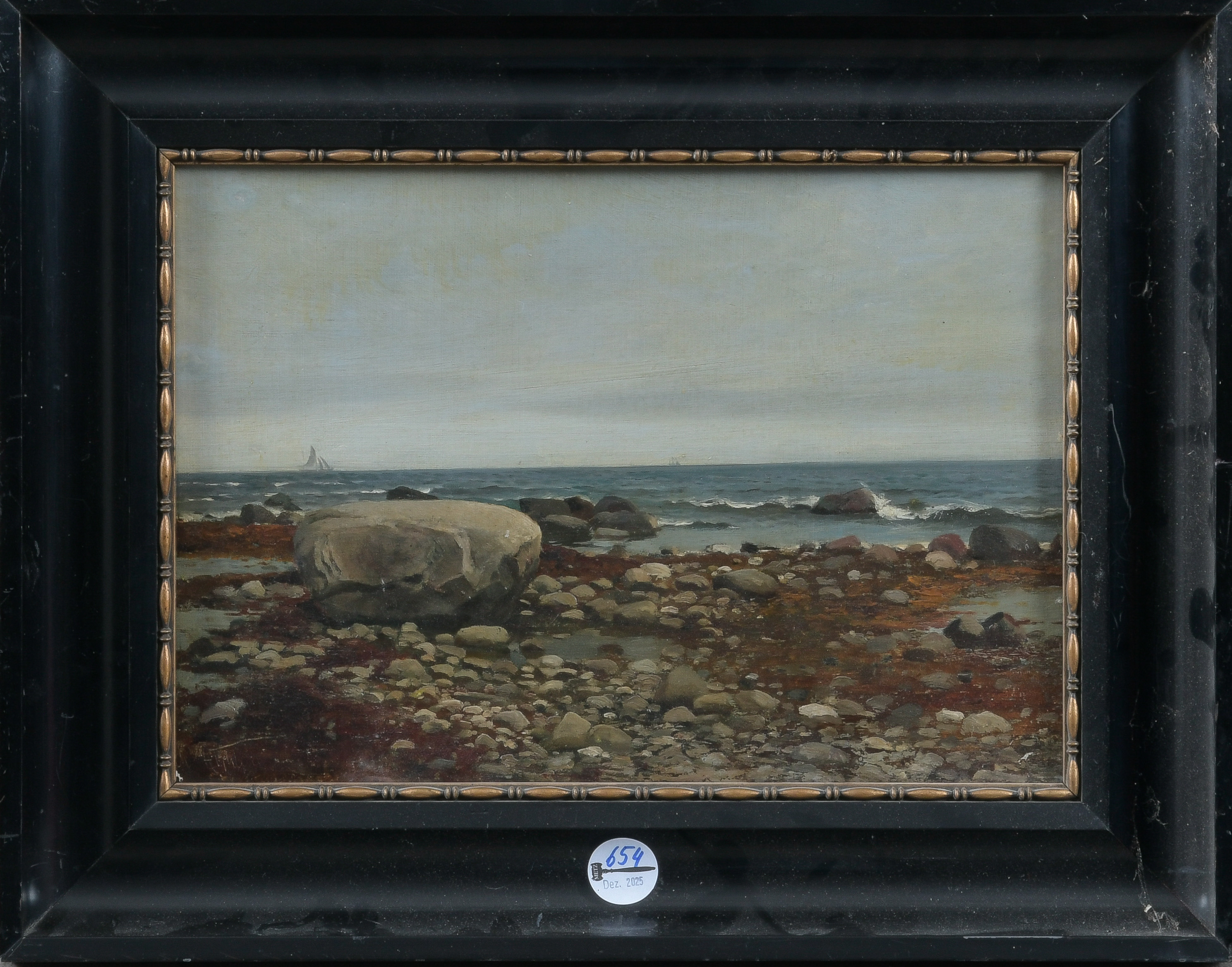- Katalog-Nr: 654Hans Schleich (1834-1912) attrib. Felsen am Meer. Öl/Lw., aufgezogen, li./u./sign./dat. (18)86, gerahmt, 28,5 x 41 cm.o.L.