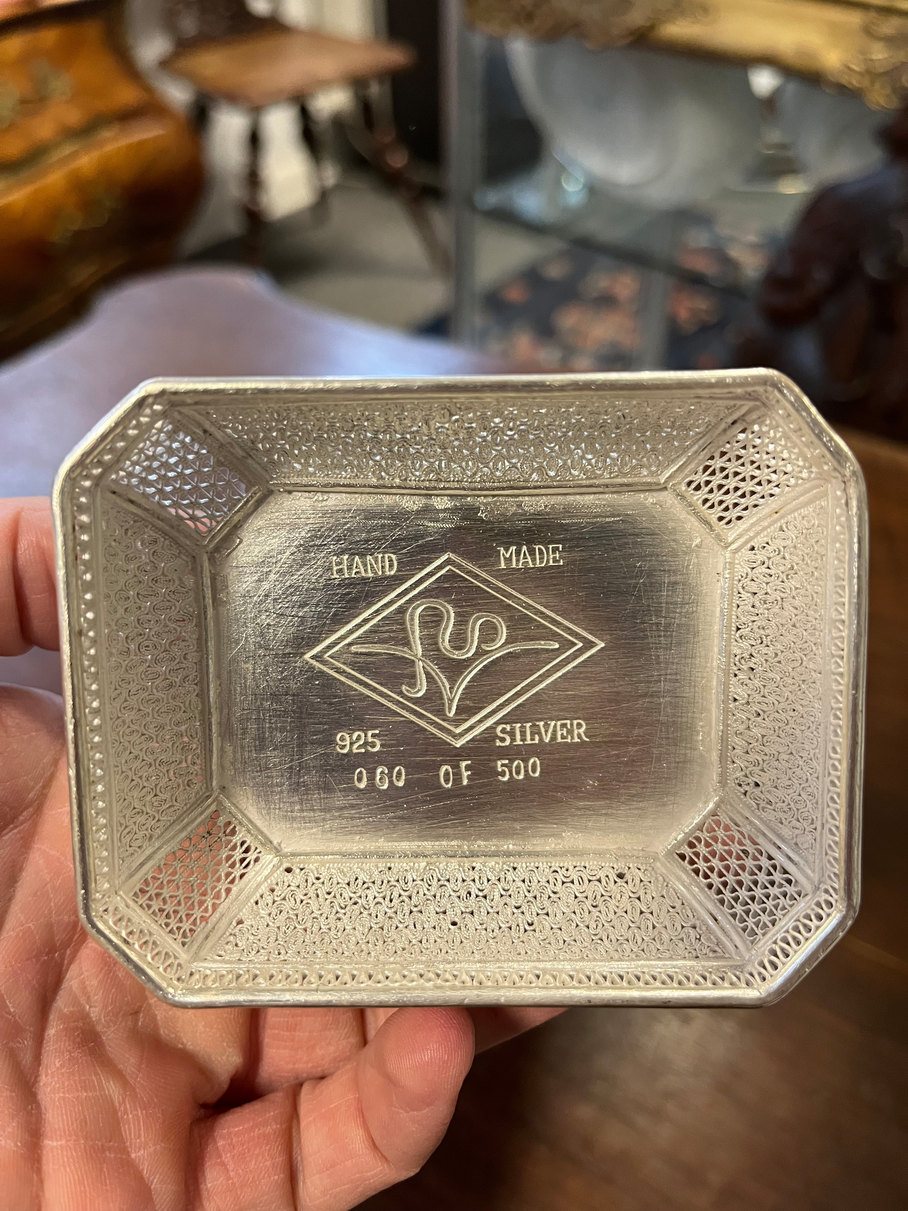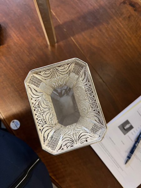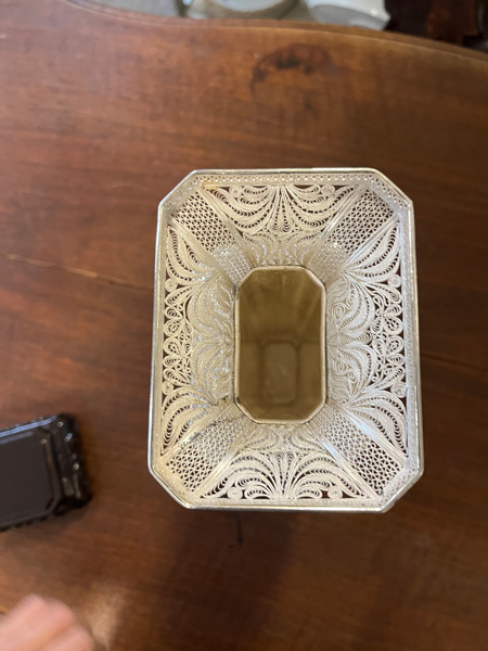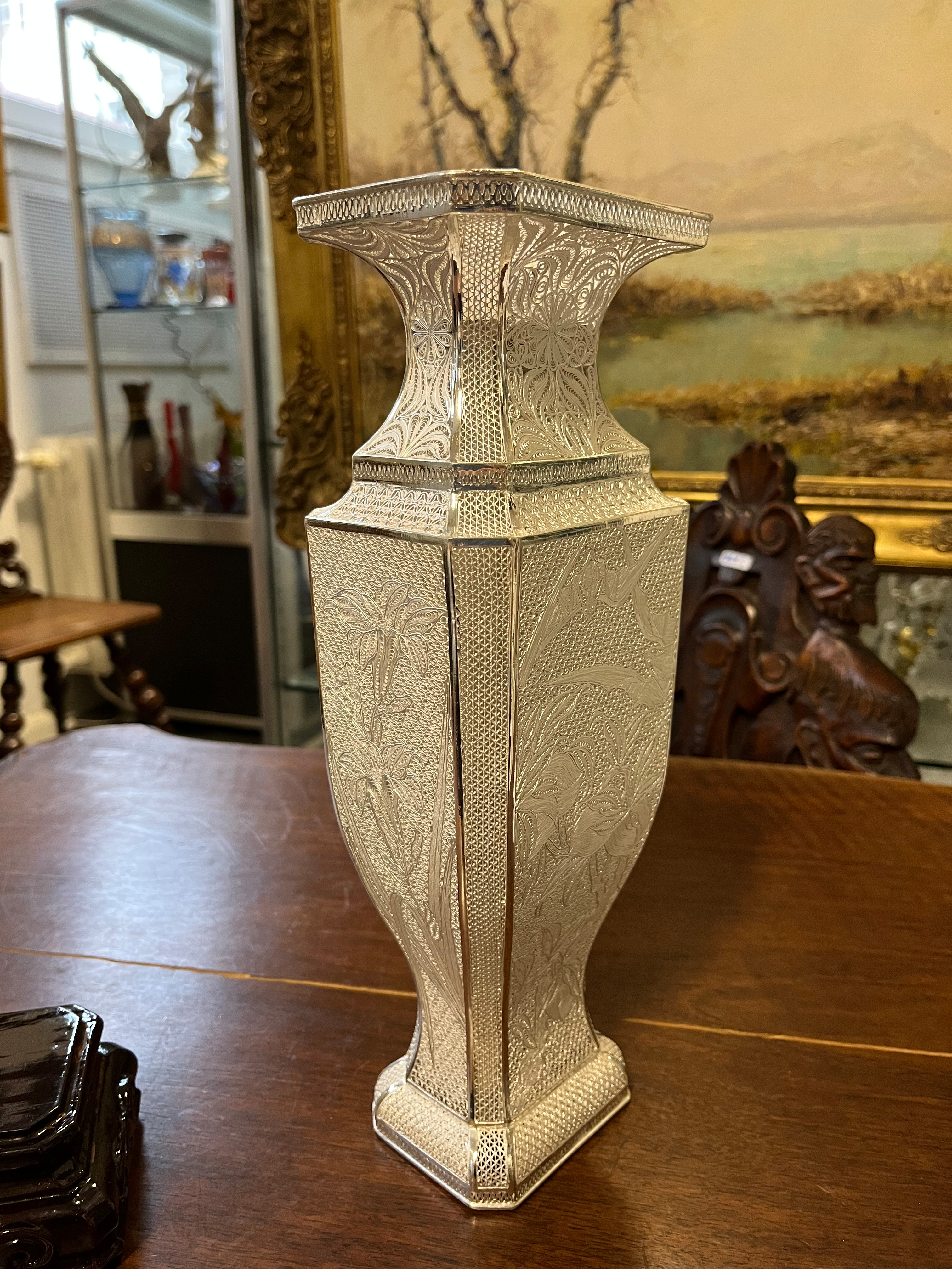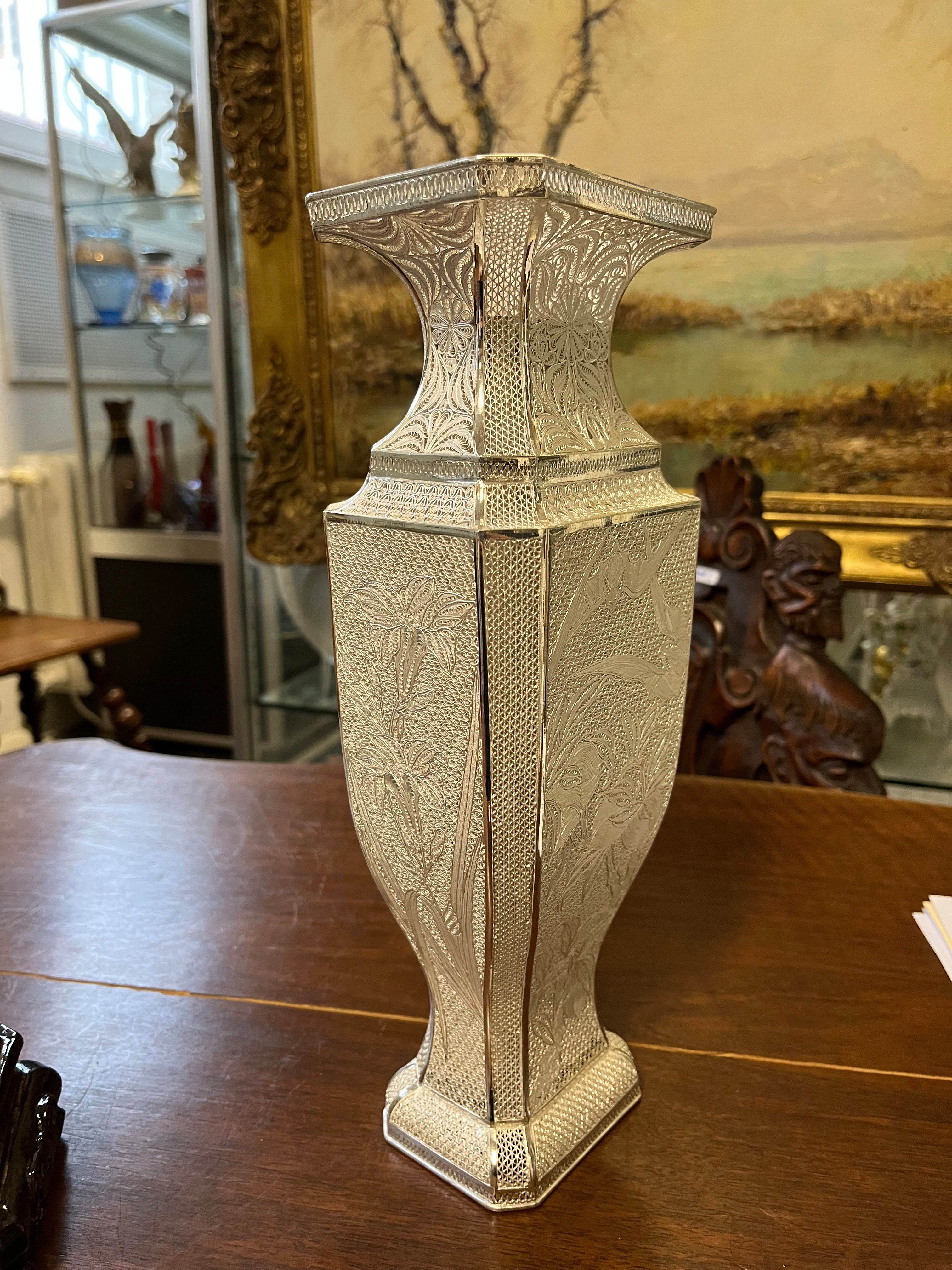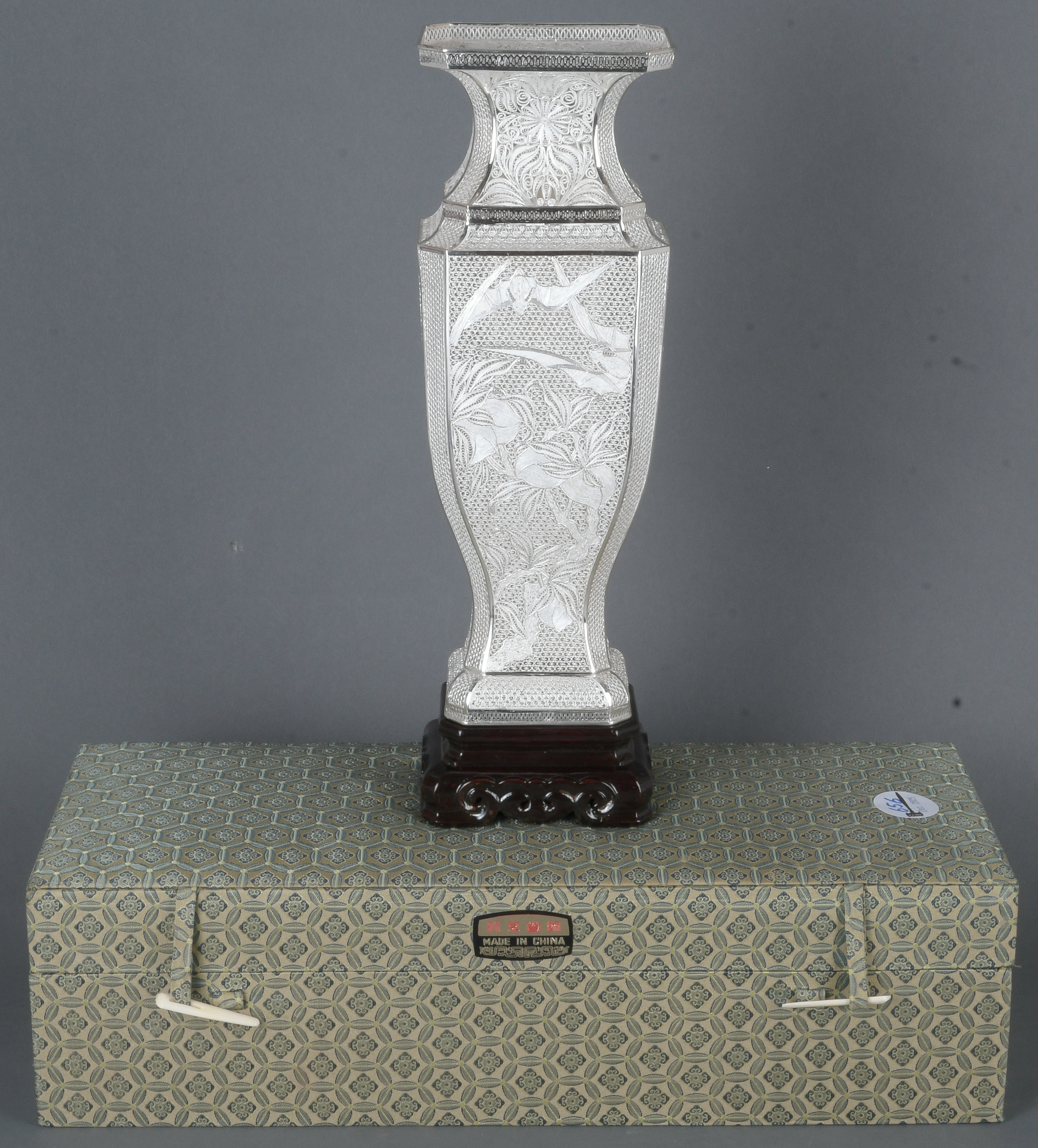- Katalog-Nr: 656Hohe Vase. Asien. 925er Sterlingsilber, ca. 939 g; in Filigrantechnik mit innen liegendem Wassergefäß aus Metall; dazu Holzsockel und Box, H=31,5 cm.o.L.