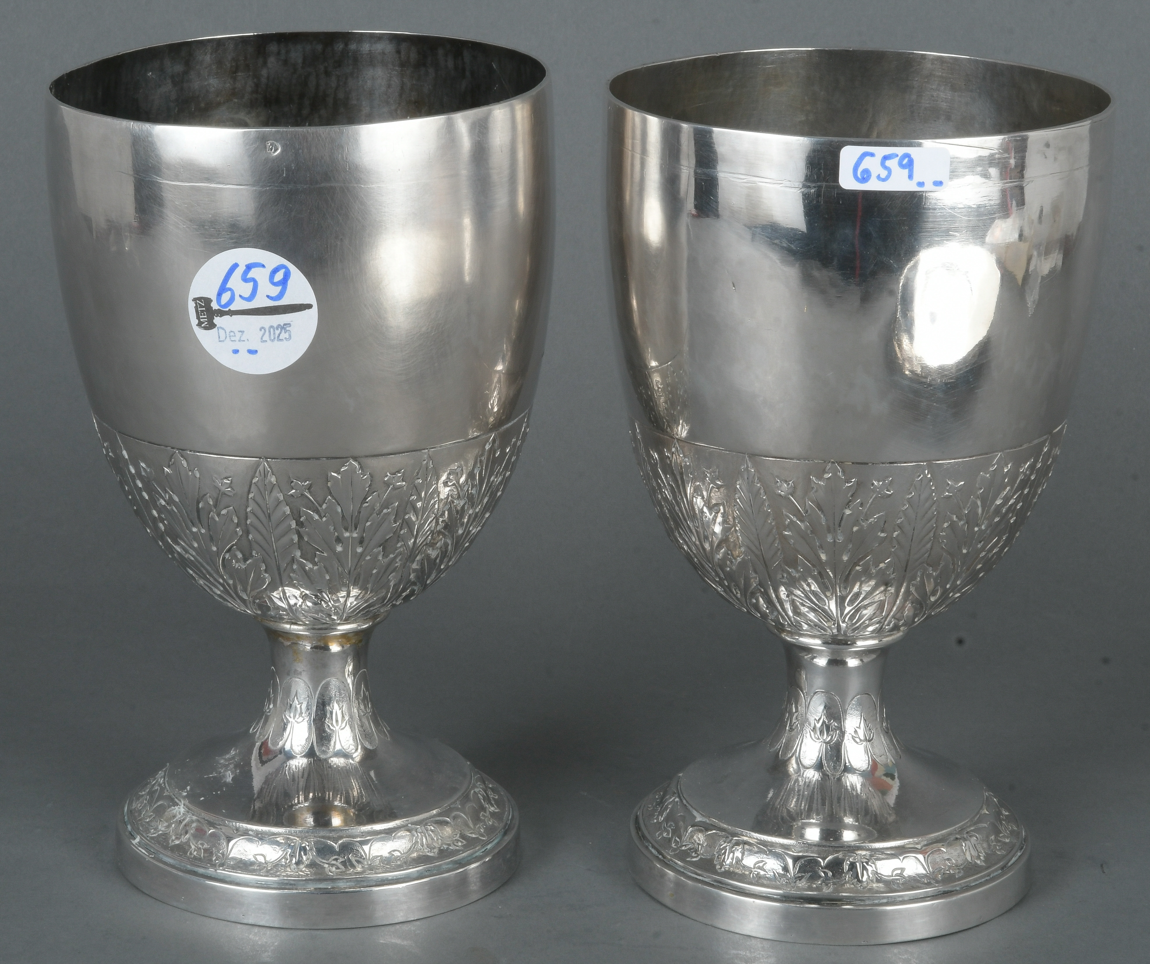 - Katalog-Nr: 659Paar Pokale. Frankreich um 1780-89. Silber, ca. 1.276 g; an der Wandung gepunzt; je mit trichterförmigem Fuß und walzenförmiger Kuppa, H=je 21 cm.o.L.